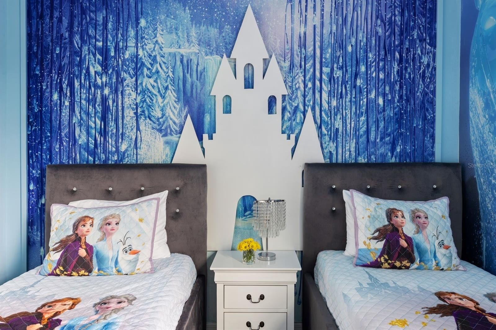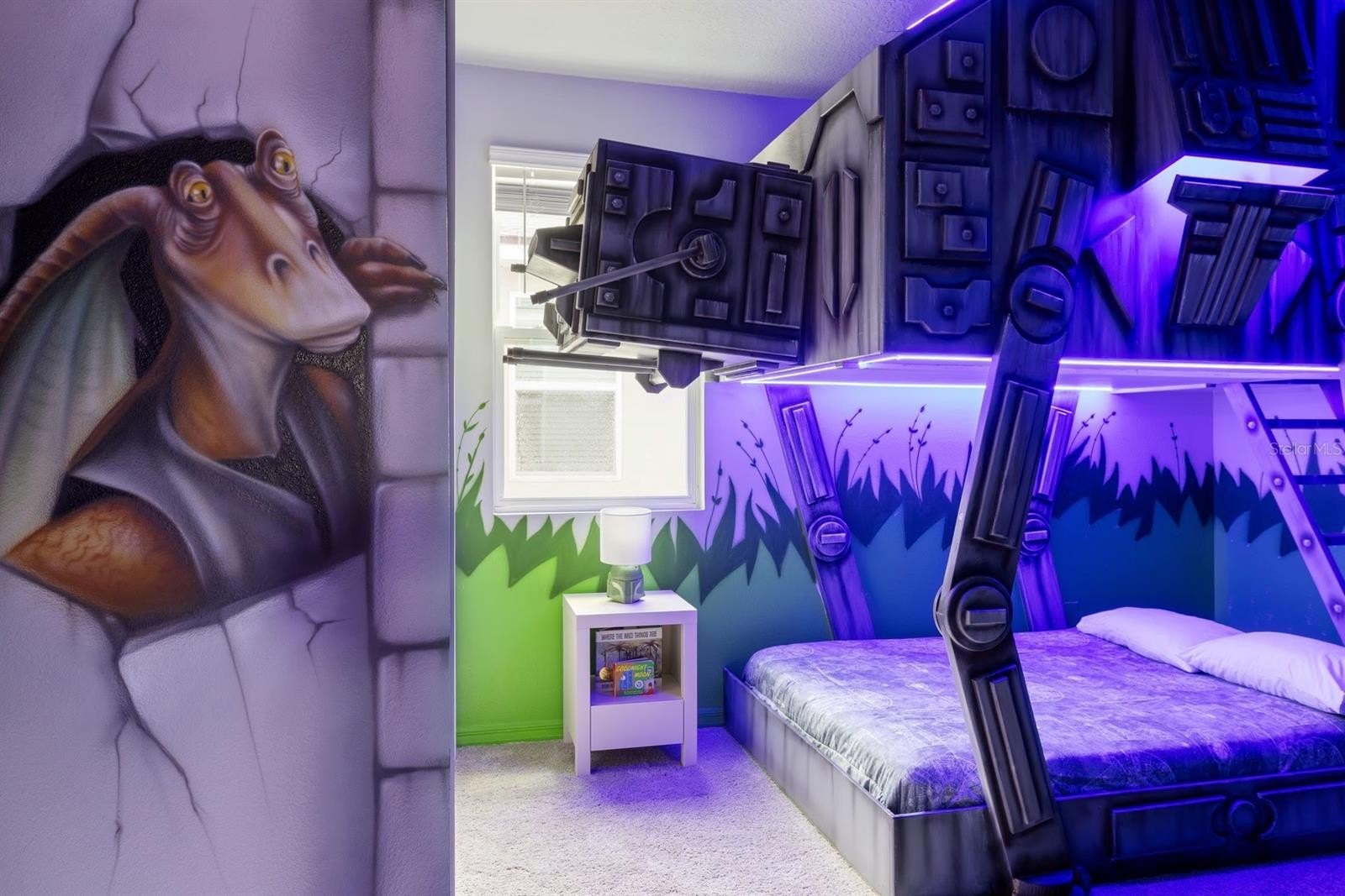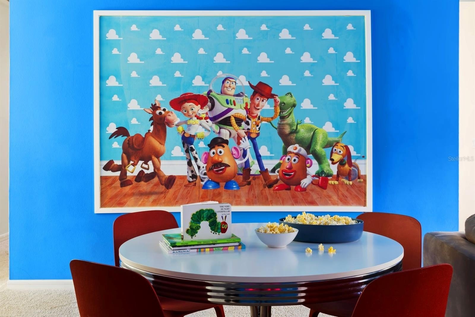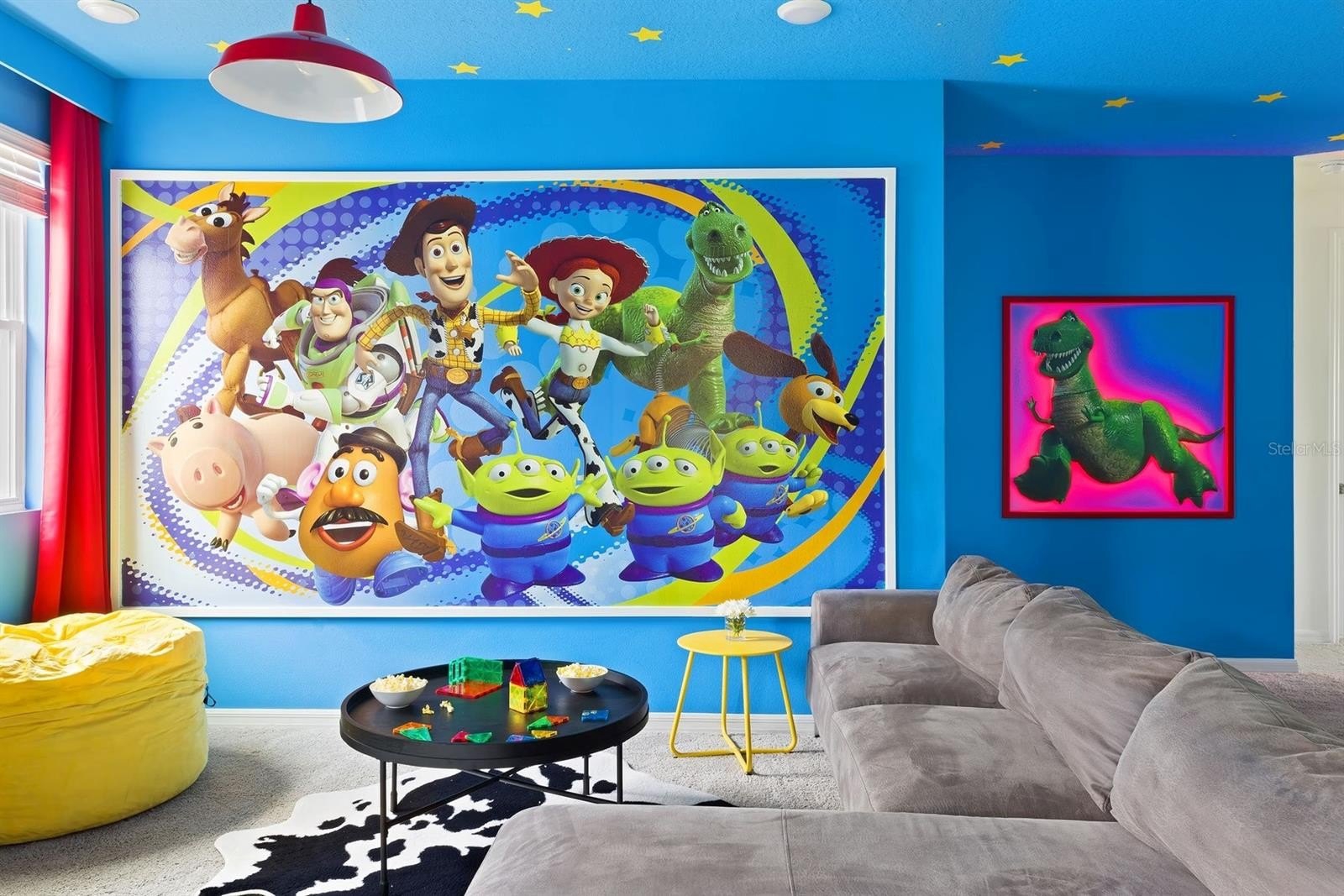 Entertainment is built in, with a fully equipped game room featuring air hockey, foosball, a pool table, and an Xbox, along with themed bedrooms designed to enhance the guest experience. Step outside to an extended lanai with a private pool and spa, offering a spacious outdoor setting for relaxing or entertaining.