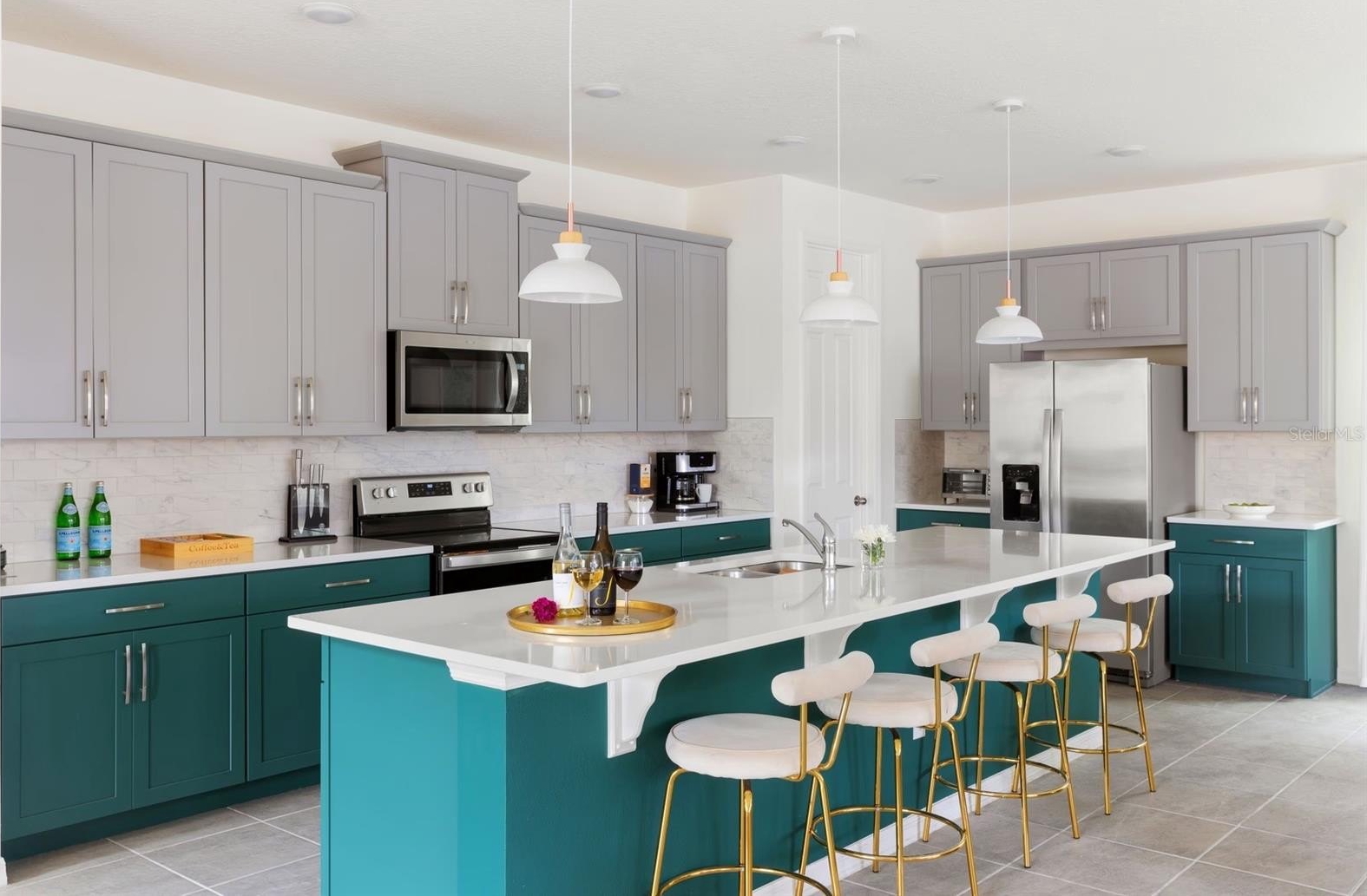 The home is designed with an open-concept floor plan that maximizes space and functionality, highlighted by two primary suites, including one conveniently located on the main floor. The kitchen is equipped with stainless steel appliances, granite countertops, and an oversized island with a double sink and ample seating, flowing seamlessly into the main living and dining areas.