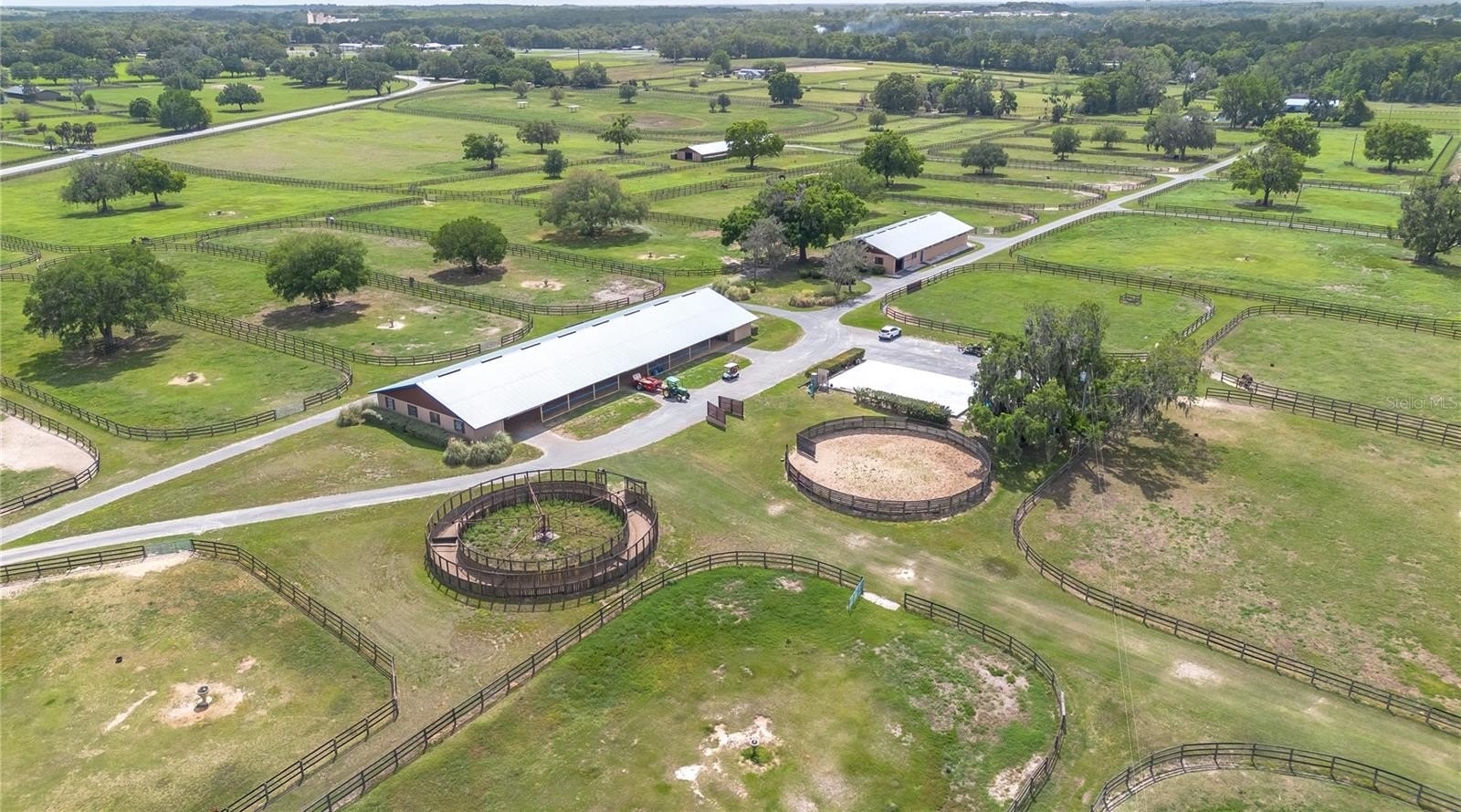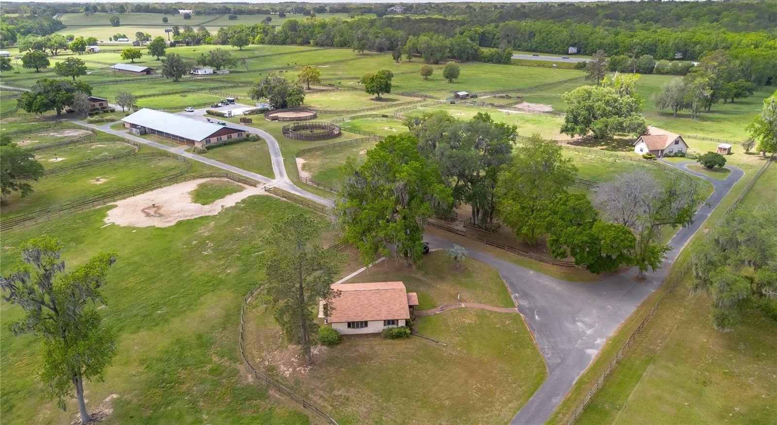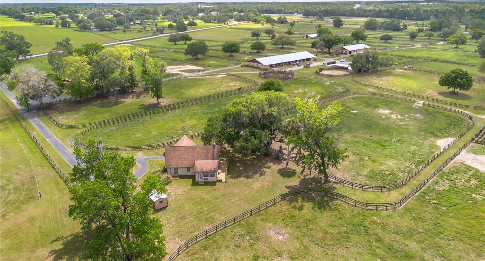 Equal parts elegant homestead and serious equestrian operation, this 50+/- acre farm offers the rare combination of refined living and top-tier horse facilities in the heart of Ocala's premier equestrian region. Just a short drive from both HITS and the World Equestrian Center (WEC) and minutes from Ocala and I-75, the location alone sets this property apart. Fenced and gated with a paved driveway, the property features rolling green pastures and paddocks stretch out in every direction, each thoughtfully designed to include their own mature oak trees for much needed shade. Two high-quality barns offer a combined 32 stalls, including a smaller 7-stall barn ideal for stallions or foaling. A eurocizer, round pen, and ample open space round out a training environment designed with serious equestrian operations in mind from start to finish. One well and two septics provide exceptional water access and operational capacity. The residence includes a warm, welcoming A-frame main home with vaulted ceilings, a stone fireplace, and sunlit gathering spaces. The open kitchen flows easily into the living and dining areas, while the primary suite on the main floor provides privacy and retreat. A separate office building supports business operations, and could easily be converted for use to an additional residence or continued to be used for business. For the buyer seeking a true equestrian estate where impressive infrastructure and room to grow all come together, this is a one-of-a-kind offering in one of Florida's most celebrated horse communities. For those looking for higher acreage and additional residential options, barns, and more, OM722441 offers an additional 50+/- acres purchase directly next door.