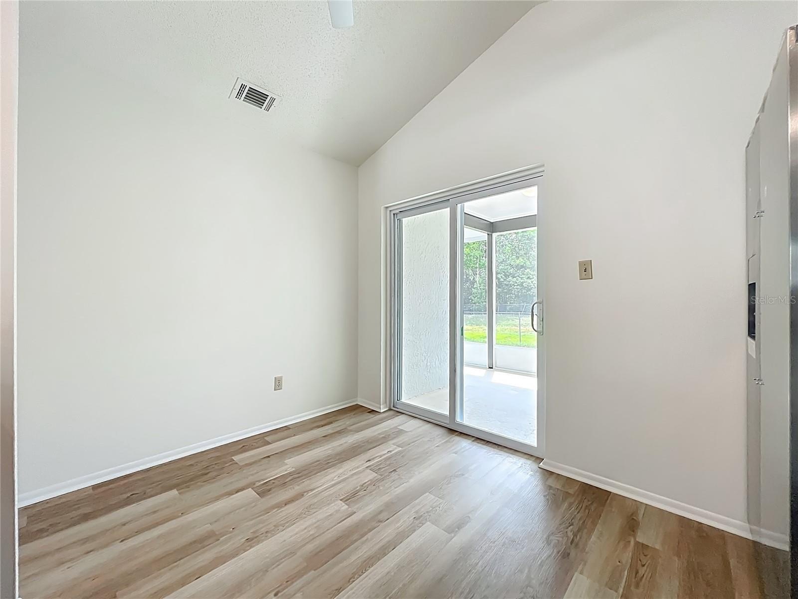 The primary bedroom offers a walk-in closet and private access to the patio through sliding glass doors.