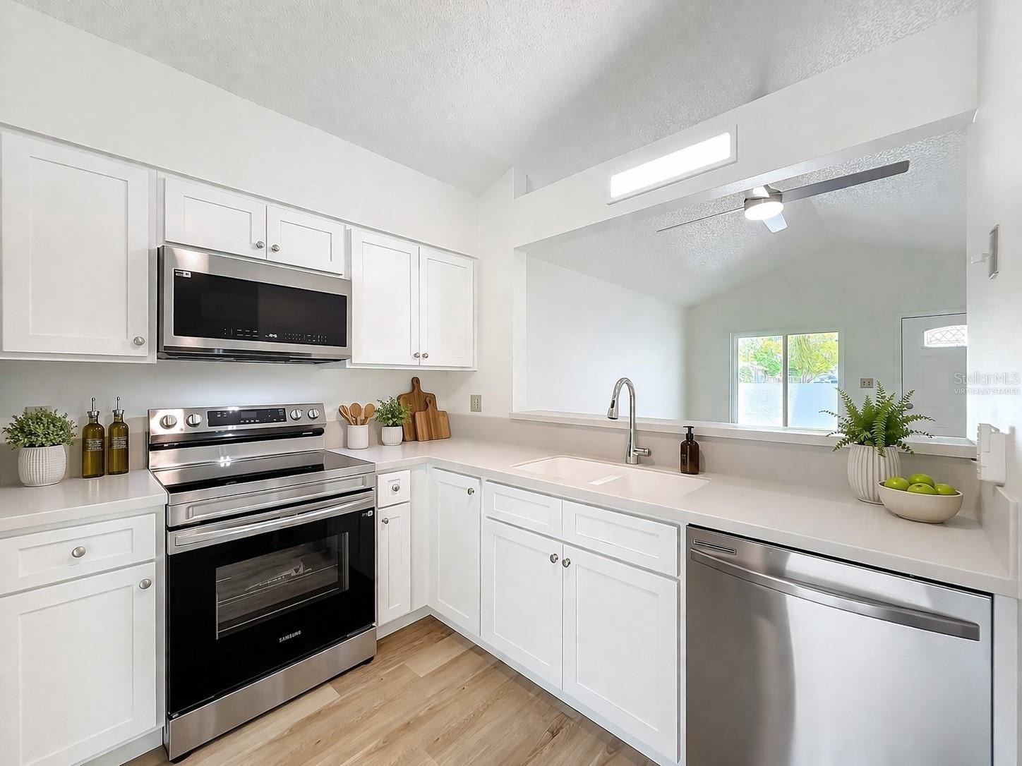 Enjoy peace of mind with a new roof, new plumbing, new windows, fresh interior and exterior paint, and all-new flooring throughout. The beautifully updated kitchen features brand-new cabinetry, Corian countertops, stainless steel appliances, a breakfast bar, and sliding doors that lead to a screened patio—perfect for relaxing or entertaining.