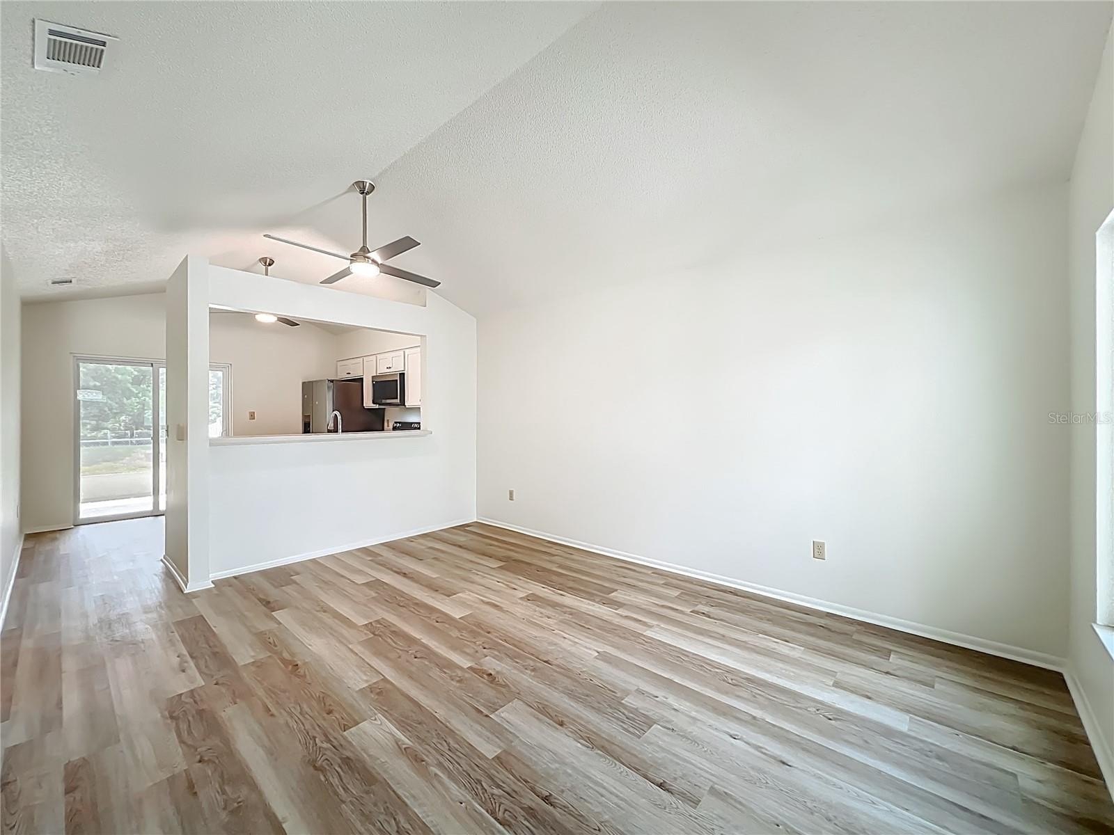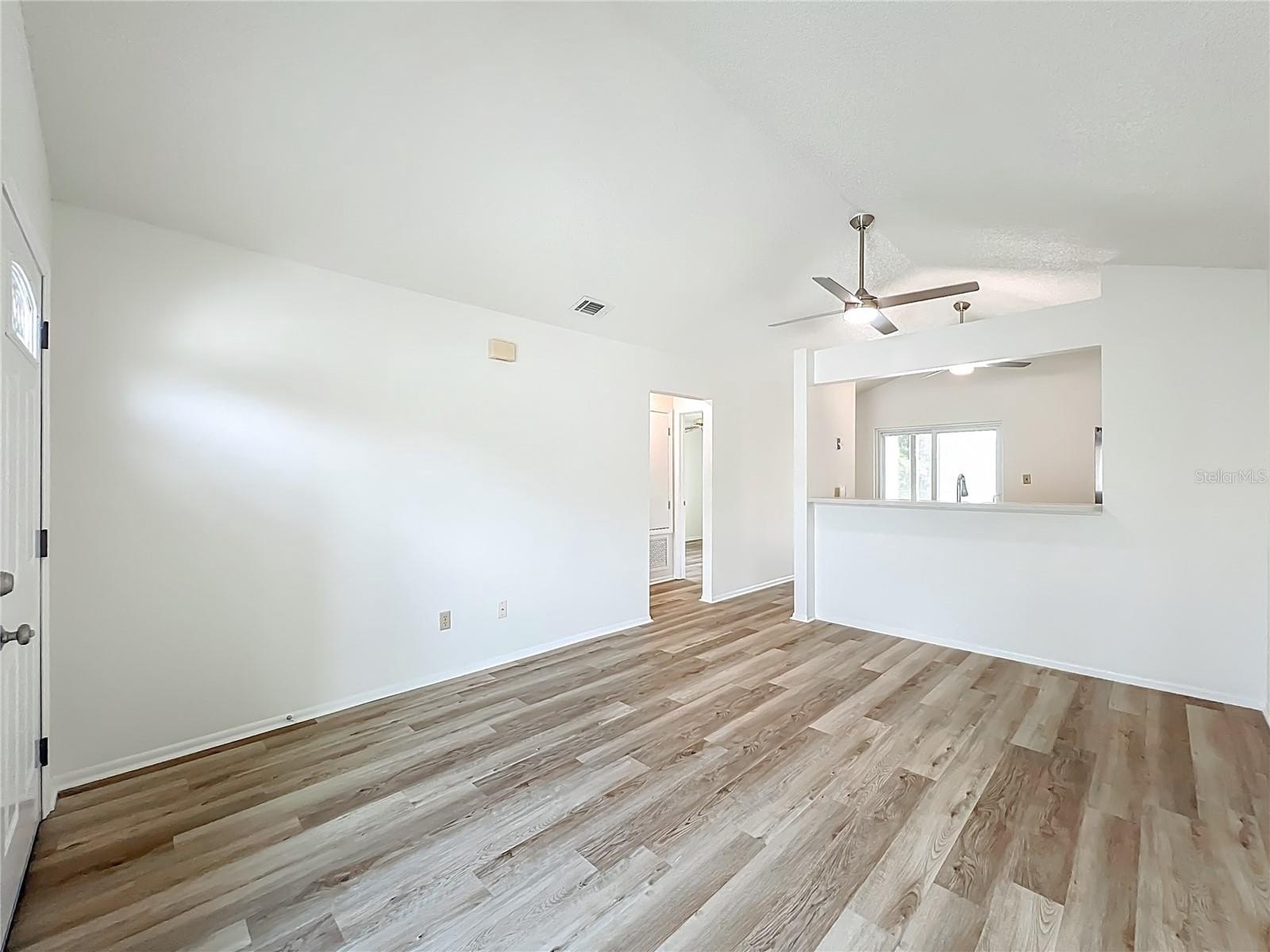 The living area showcases luxury vinyl plank flooring that flows seamlessly throughout the home. Both bedrooms are generously sized and share a completely remodeled bathroom with a new vanity, updated lighting, and custom beadboard detailing.