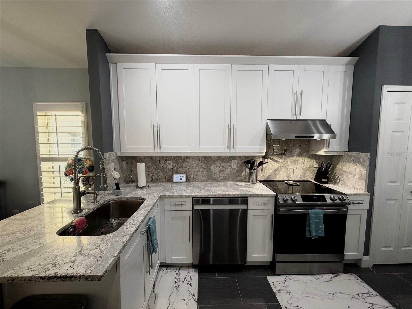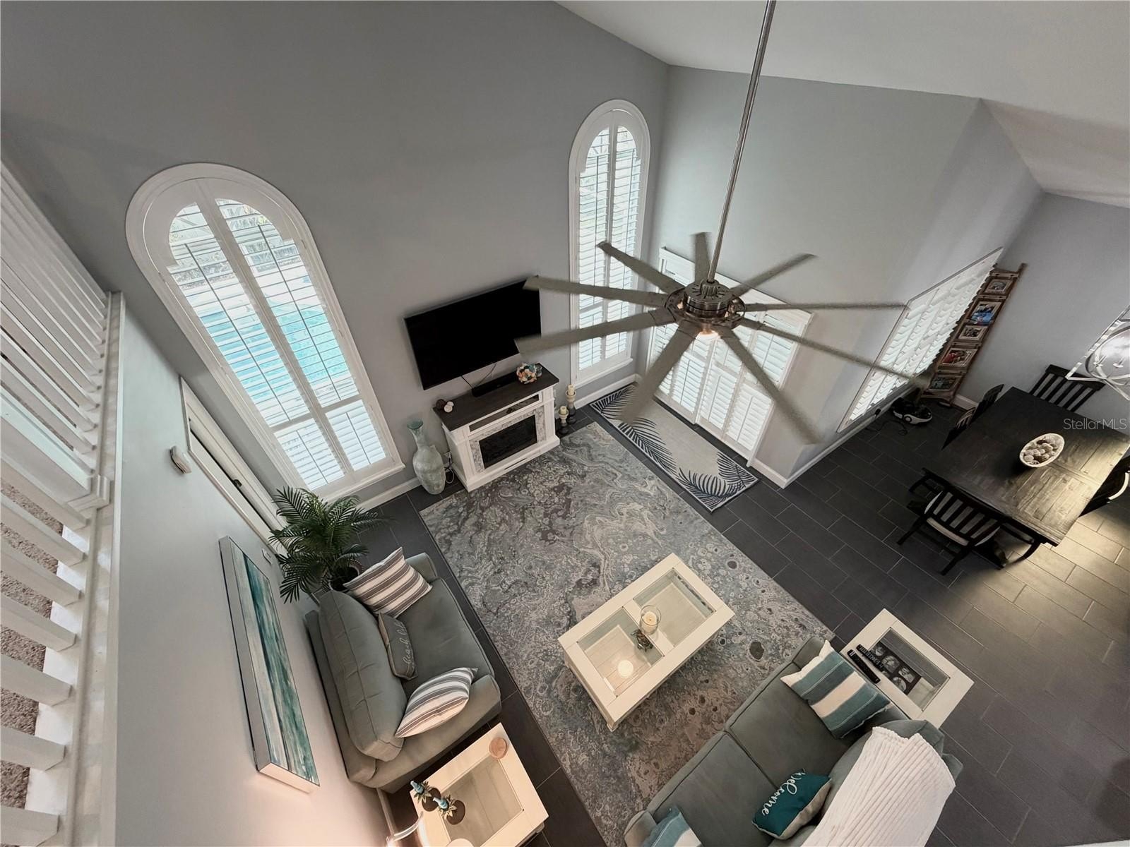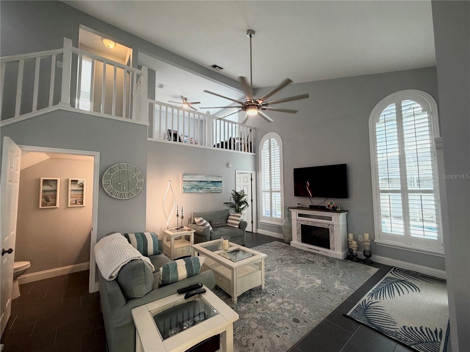 As soon as you walk in, you’ll love the bright, open feel created by the tall vaulted ceilings and gorgeous tile flooring that flows throughout the main level. Beautiful plantation shutters on every main-level window let in tons of natural light while keeping the space cozy and private. The kitchen is a showstopper with elegant quartz countertops, sleek stainless steel appliances, and a built-in beverage cooler: perfect for entertaining or just relaxing with your favorite drink.