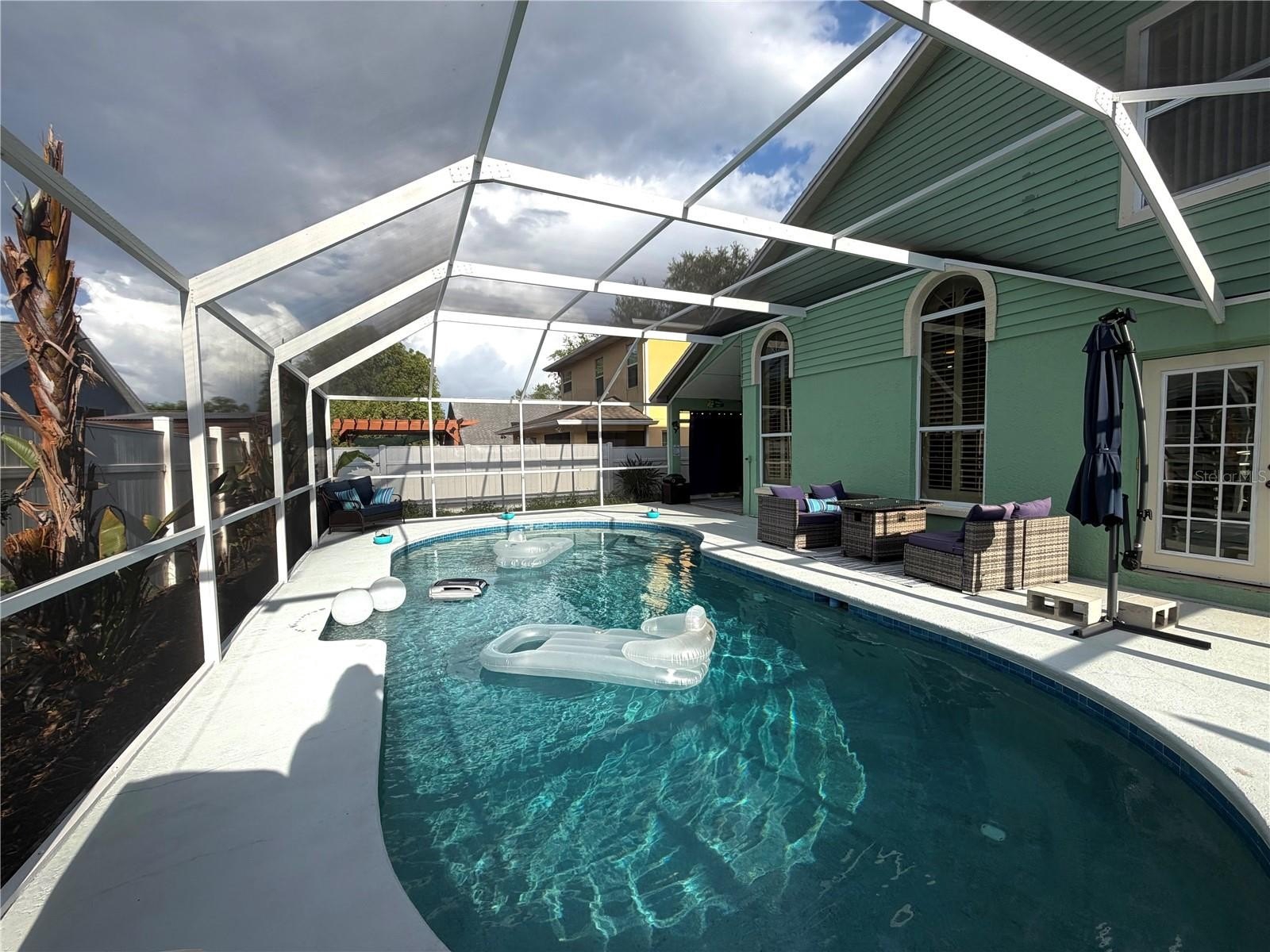 Now let’s talk about the backyard – this is the standout feature everyone falls in love with! The huge enclosed lanai gives you tons of shaded outdoor living space. Whether you’re enjoying your morning coffee while looking out at the recently resurfaced sparkling pool, hosting weekend cookouts, or just relaxing with friends, this backyard is pure Florida living at its best. An automatic irrigation system keeps the luscious grass vibrant and the thoughtfully planted Florida greenery thriving year-round. It truly feels like your own personal resort.