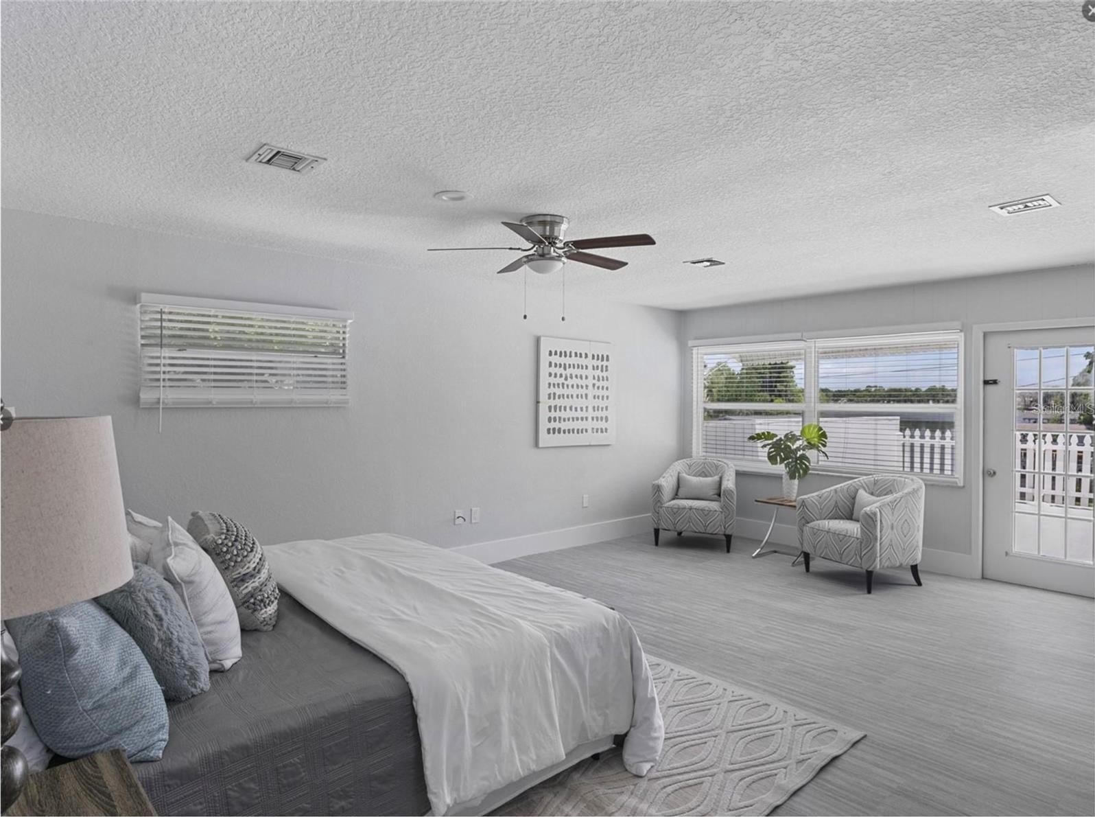 The primary suite opens to a private balcony overlooking the water, creating a serene retreat. Outdoors, the property offers a fenced yard and a rare combination of circular driveway and rear-access garage.
