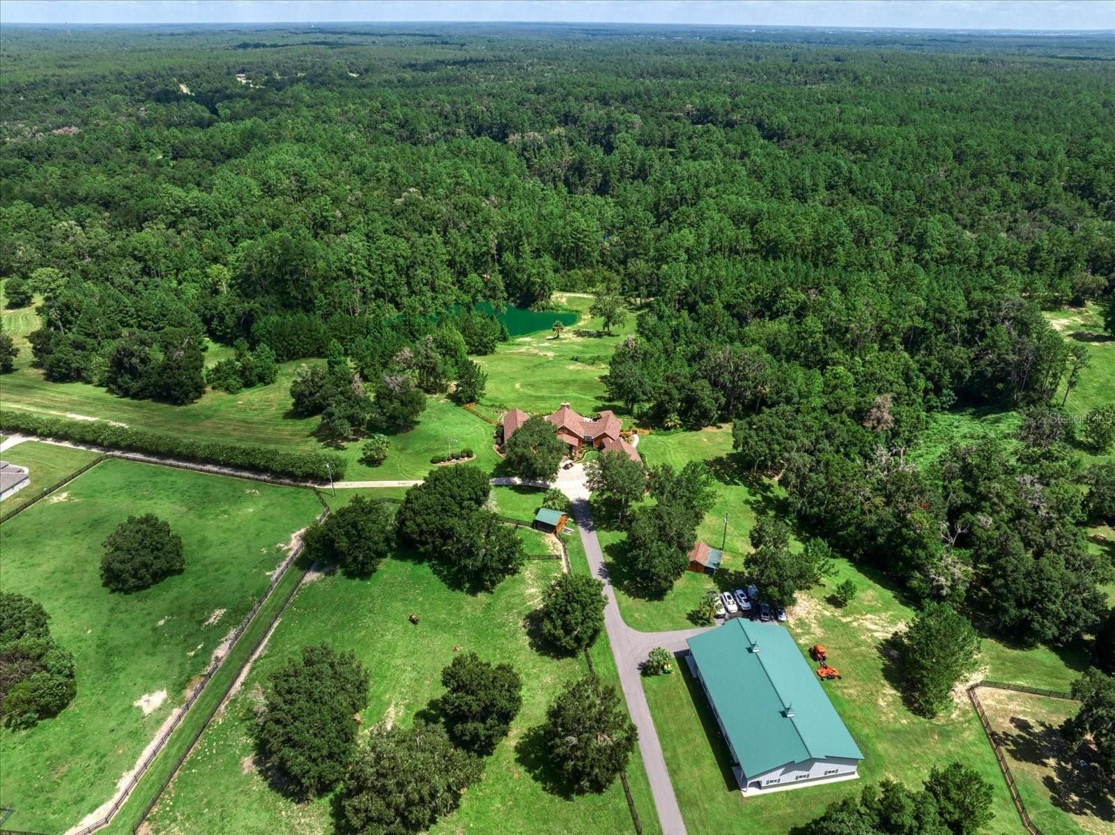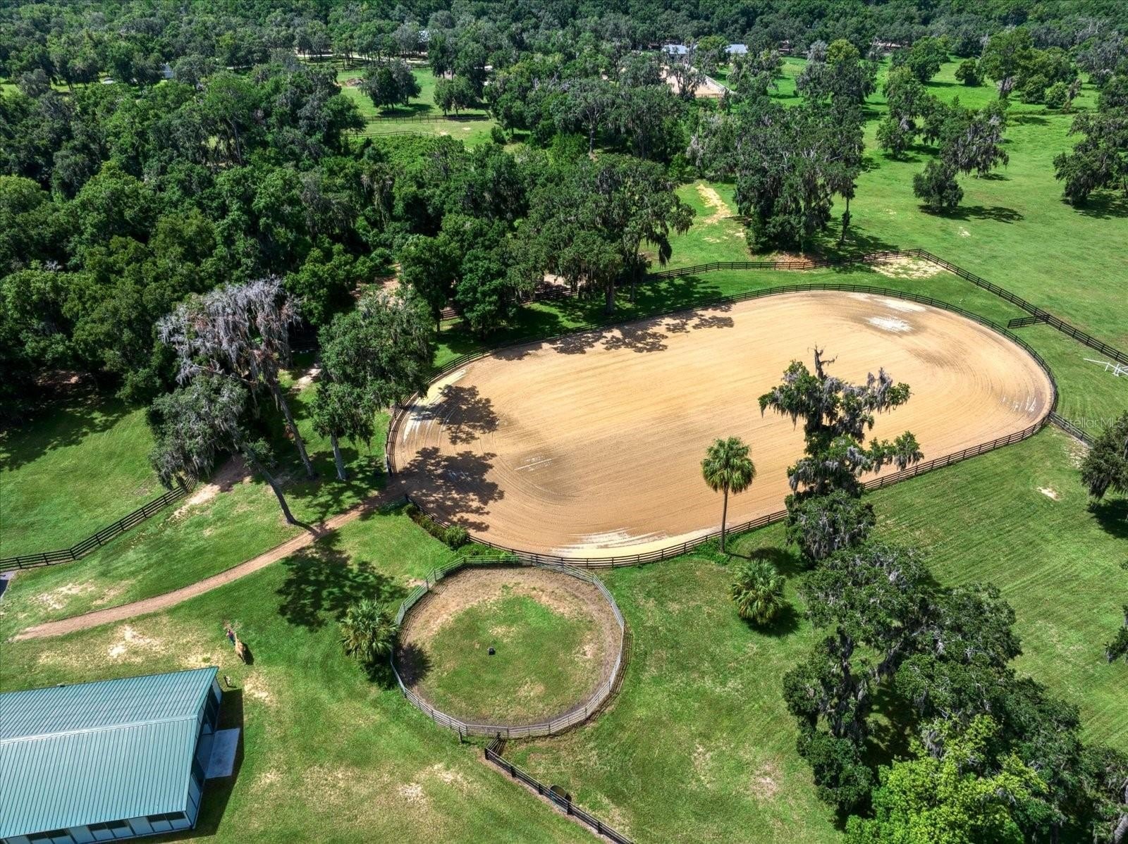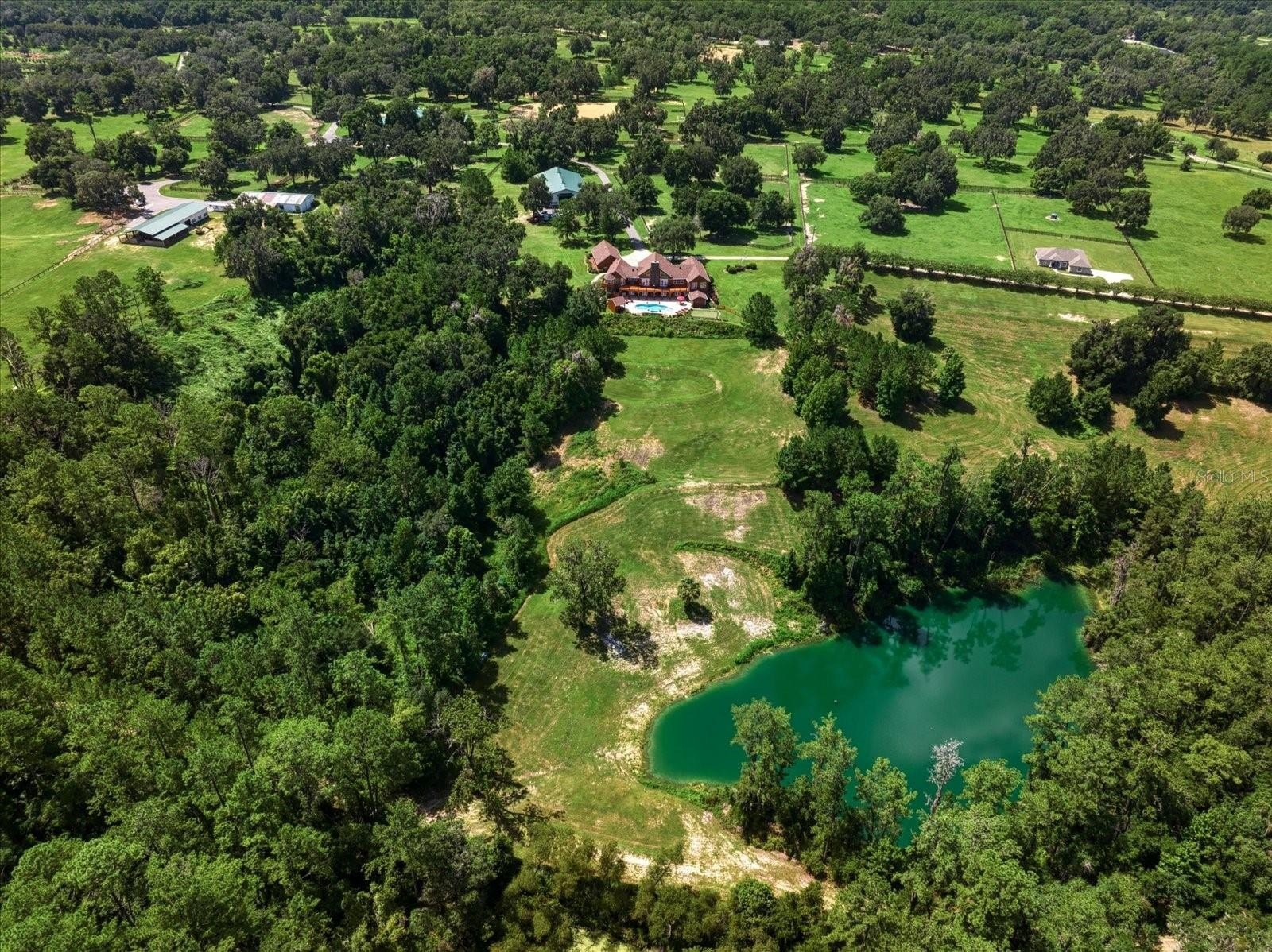 87+ acre equestrian estate strategically located in Ocala's prestigious horse country, easy access to the World Equestrian Center. This turnkey facility offers exceptional value for serious equestrian enthusiasts and investors. Paved drives bring you past rolling pastures and majestic trees to this custom-built home featuring soaring pine ceilings, 23-foot stone fireplace, and polished cherry hardwood floors throughout. The open-concept living area includes built-in entertainment center, wet bar, and loft space with French doors framing the grand fireplace offering expansive views across the pool area, putting green, and the aquifer-fed pond. Continuing thru the large dining area is the gourmet kitchen featuring ample countertop space, custom cabinetry, dual ovens, gas cooktop, and breakfast bar. The breakfast area offers beautiful views and access to the upper deck overlooking the pond and pool area. Master suite occupies private wing with dual walk-in closets, luxury bath with jetted tub, dual vanities, and a walk-in shower. Connected office/sitting room with panoramic windows accesses upper deck and pool area. Adjacent is additional bonus room suitable for gym, studio, or bedroom. Lower level offers a large family/game room with large wet bar, two bedrooms each with private bath, and direct pool access. The expansive multi-level deck with built-in grill, lanai with brick oven, cabana, pool house/studio, resort style pool and spa are accessed with two spiral staircases connecting the two levels. Adjacent to the home is the 4-car oversized garage with workshop and storage area plus an additional bath. The main barn is an MD Barnmaster with zero fire spread rating. Main barn has 35 stalls, multiple grooming/wash areas, feed rooms, hay storage, tack lockers, office and two 2-bedroom apartments. The secondary barn has 8 oversized stalls and is designed for breeding complete with a lab. This well-maintained property has four fenced pastures, 19 paddocks, miles of 4-board fencing, paved drive and parking, professional grade Drinking Post waterers and 10 additional feeding stations. The Morton Building is 60x100 with 2 car lifts, roll up door for RV parking and is HVAC ready. Recent upgrades include new asphalt roofs (2023) and state-of-the-art Trane 454B HVAC systems (March 2025), along with many more 2025 improvements too numerous to list. Additional property available: 10 acres w/ 2,340 sfla guest home plus 12 acres vacant