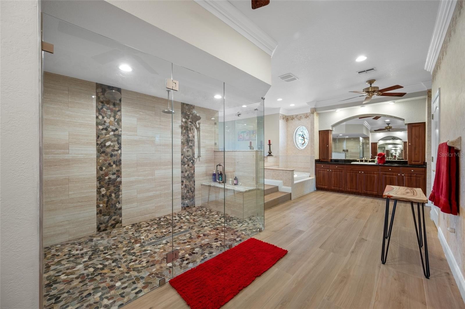 Welcome to the Equestrian Community of Pasco Trails! This estate is fully fenced with a private gated entrance that leads to a circular driveway with a 5,564 s/f pool home sitting on 9.75 acres of property. Enter the home through the leaded glass front doors into the vast foyer with a direct view to the lanai, pool and backyard. To your left is an oversized family room and your own personal master wing that includes a private office/ bedroom, sitting area, 2-sided fireplace, wet bar, en-suite bath and exercise/flex room with access to the pool area. The master bath is incredible with a private water closet, multi-head shower, dual vanities and heated jetted soaking tub. The master also has a large walk-in closet with secure gun room. The three additional bedrooms are on the opposite side of the home and each with its own en-suite bath, one with pool access. There is a double desk space with storage in the hall leading to the 3 additional bedrooms, a great landing spot for doing homework or working on a project. The kitchen will impress even the most discerning chef in the family. The massive island has tons of storage including a wine rack, cooktop with a beautiful stainless-steel hood and convenient warming drawer. Plenty of counter space, two dishwashers, double built-in convection ovens and a separate microwave. The walk-in pantry has room for all the staples and utensils every cook wants and needs. The Living room with gas fireplace is spacious and also has direct access to the lanai. The formal dining room is large enough to host any large holiday gatherings. The excessively large mud room/laundry room with laundry room sink, built in ironing board is ideal for backpacks, shoes and plenty of room for an extra refrigerator! The laundry room leads to a spacious 4 car garage. The 40 X 20 pool with spa and outdoor kitchen are meant for entertaining with a wonderful view of the property. There is a detached garage with drive-through ability to house the lawn equipment, cars and would make a great workshop. This house comes with a 2023 new roof, 2 new water heaters, water softener, two new 5 ton A/C units, 3 electrical panels, central vacuum and so much more. Just minutes to the Suncoast Parkway or I75; both will take you to shopping, dining, Tampa International Airport, entertainment and the beautiful Suncoast beaches.