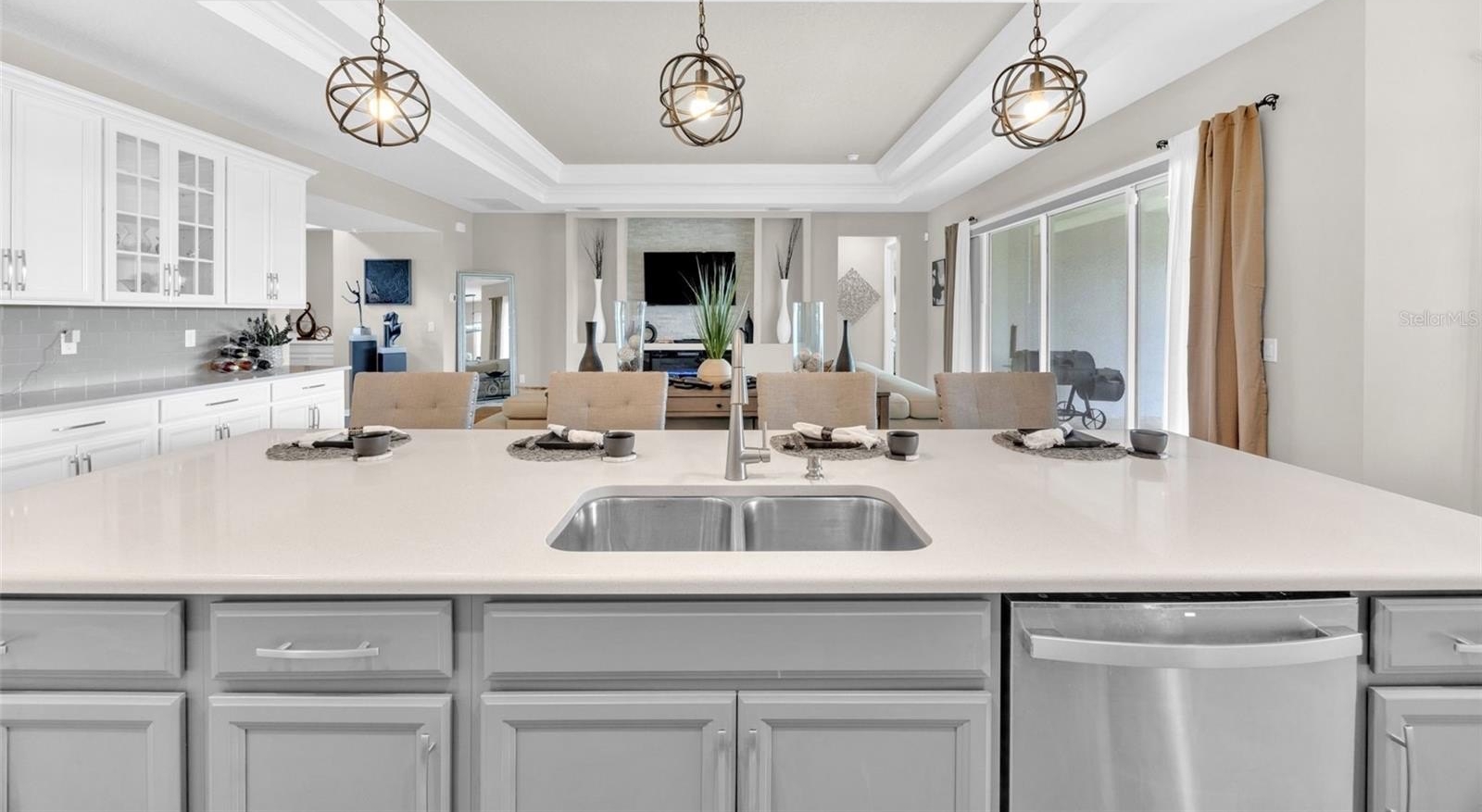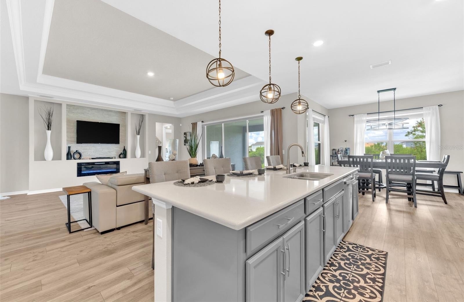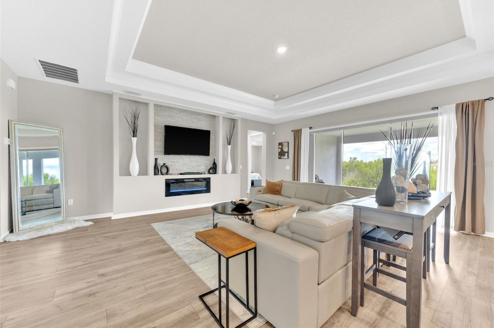 From the moment you enter, the soaring 8-foot doors, luxury vinyl plank flooring, and elegant tray ceilings in the foyer, main living area, and flex/game room set the tone for elevated living. The open-concept design flows seamlessly into the gourmet kitchen and spacious family room, highlighted by a custom built-in fireplace wall that creates the perfect focal point for entertaining or relaxing at home.