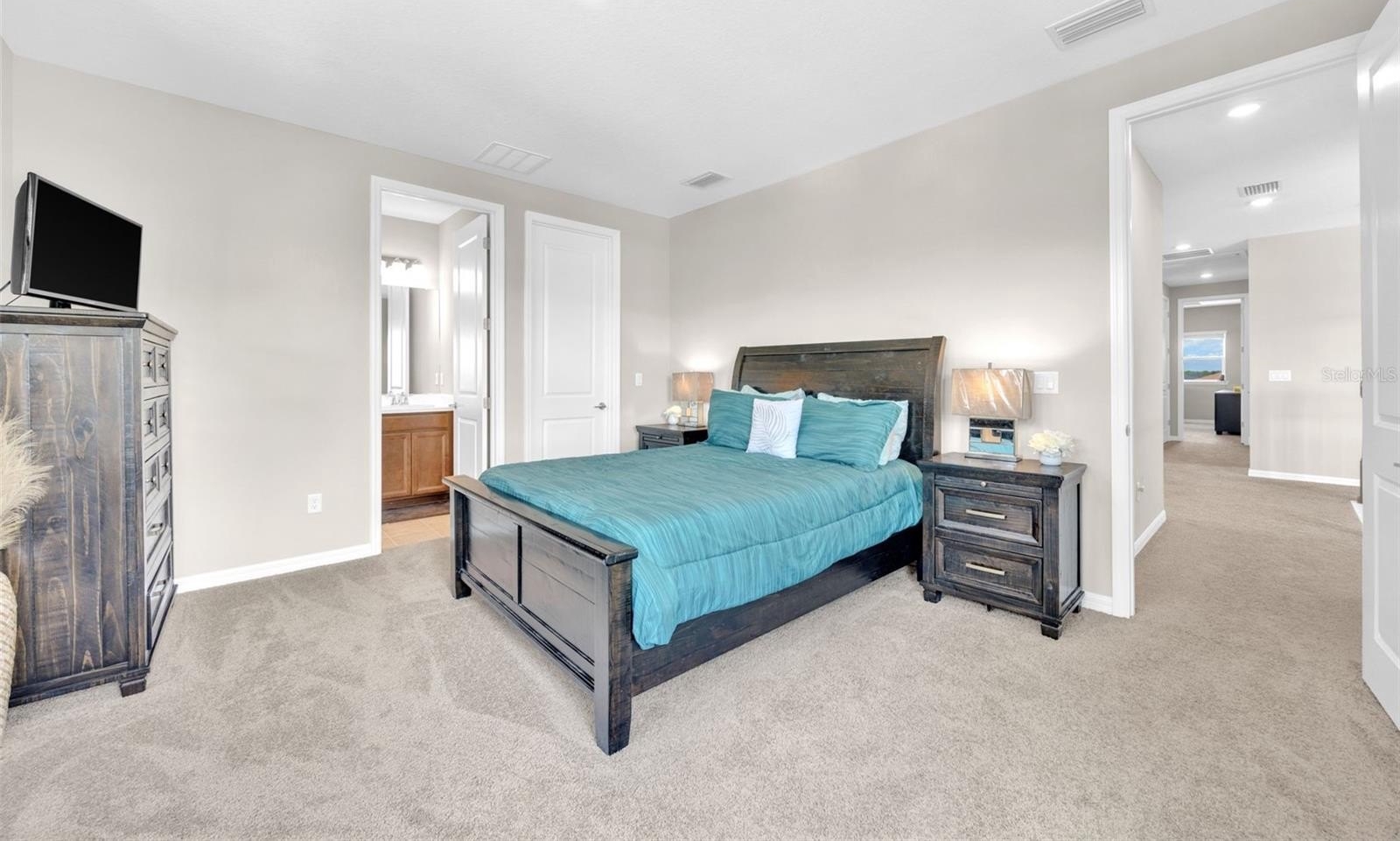 The first-floor owner’s suite is a true retreat, featuring a tray ceiling, spa-inspired walk-in shower, and an extended walk-in closet designed for both style and function. Sliding glass doors lead to an extended lanai where you can unwind while enjoying tranquil preserve views and no rear neighbors.