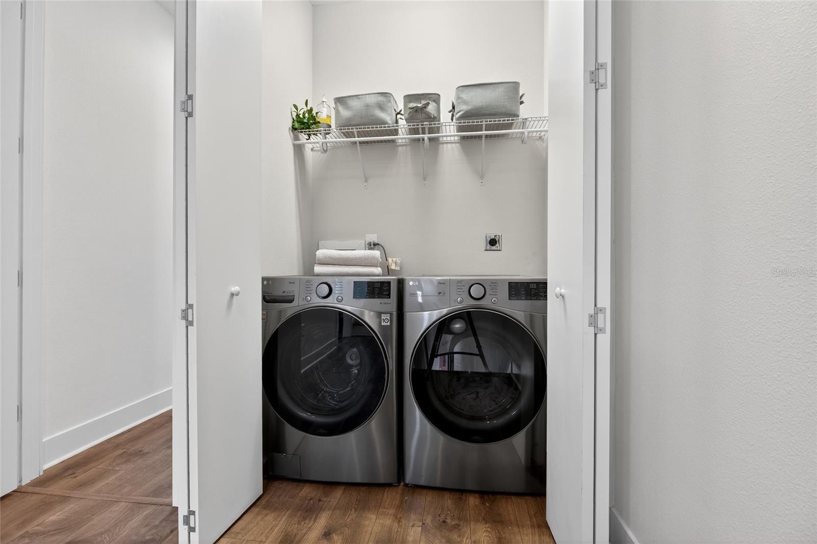 Upstairs, the primary suite delivers comfort and style with two spacious walk-in closets, a double vanity, glass walk-in shower, and linen storage — your own private sanctuary to unwind. A dedicated laundry area on the primary level with front-loading washer and dryer keeps daily life seamless, and the private two-car garage with additional storage adds one more layer of everyday ease.