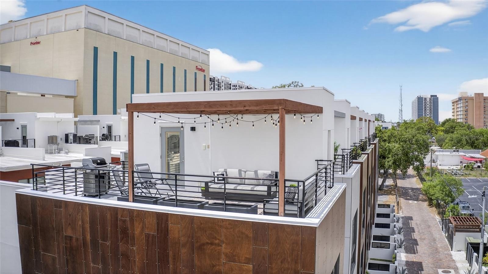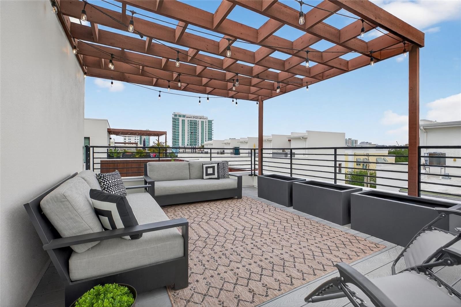 And then there's the showstopper — your private rooftop terrace. Under the pergola, imagine evenings spent grilling, mixing cocktails at the wet bar, or catching the game with the Downtown St. Pete skyline as your backdrop. This isn't just an outdoor space — it's your personal rooftop oasis.