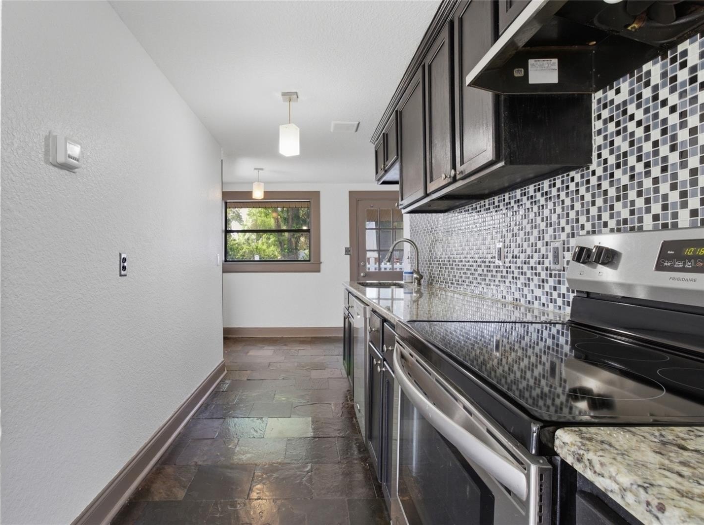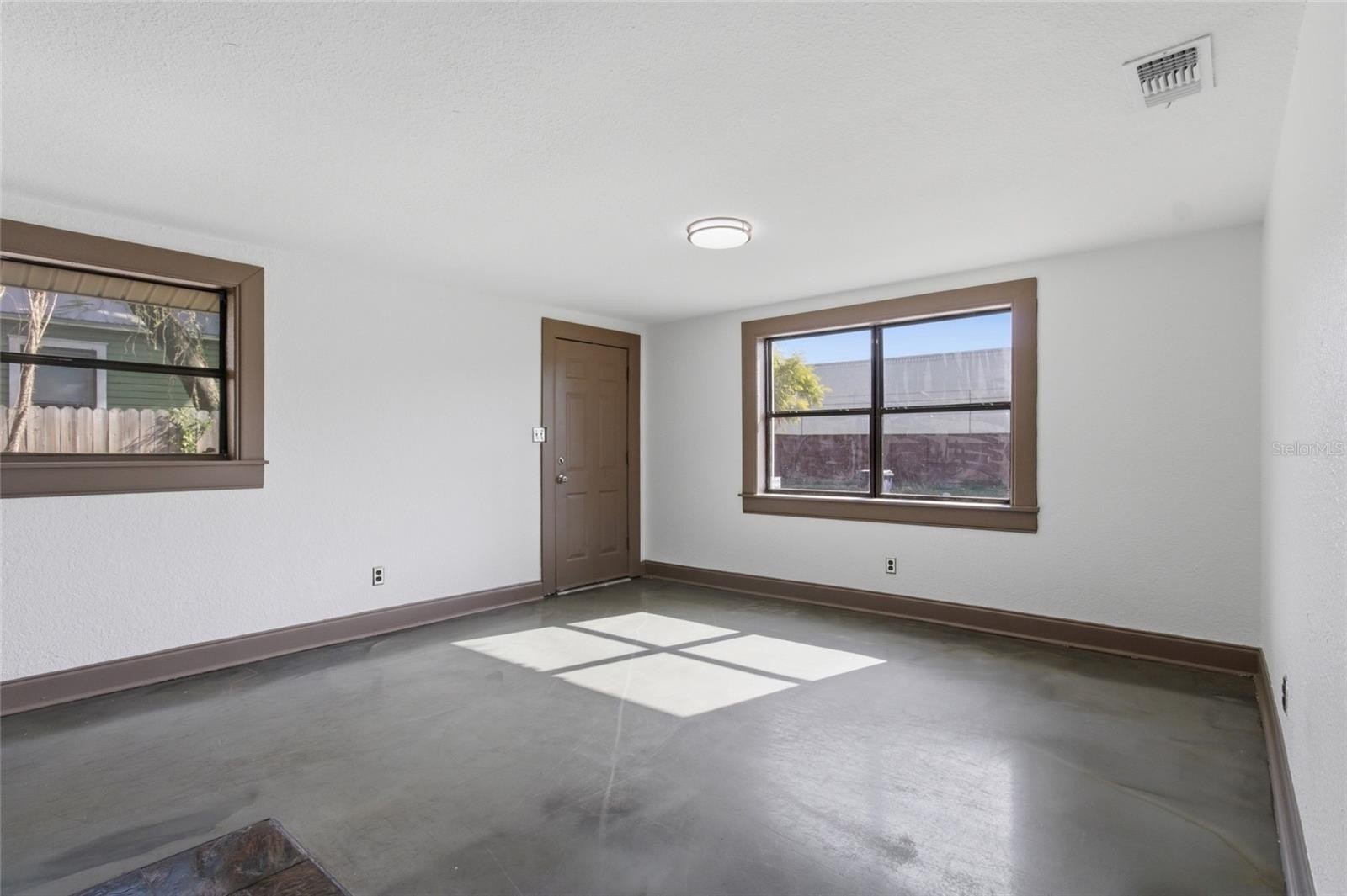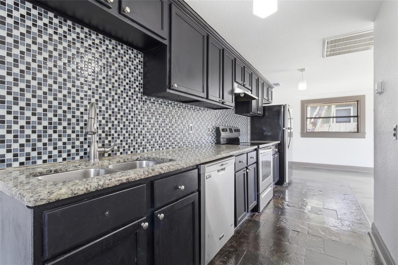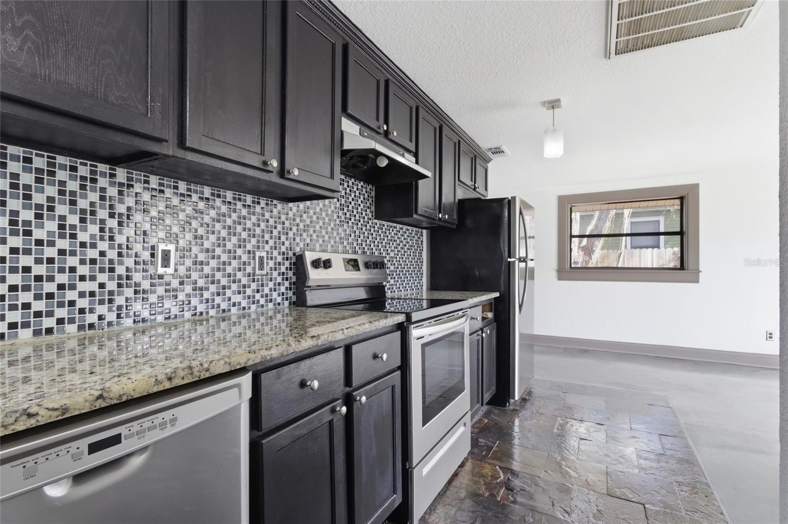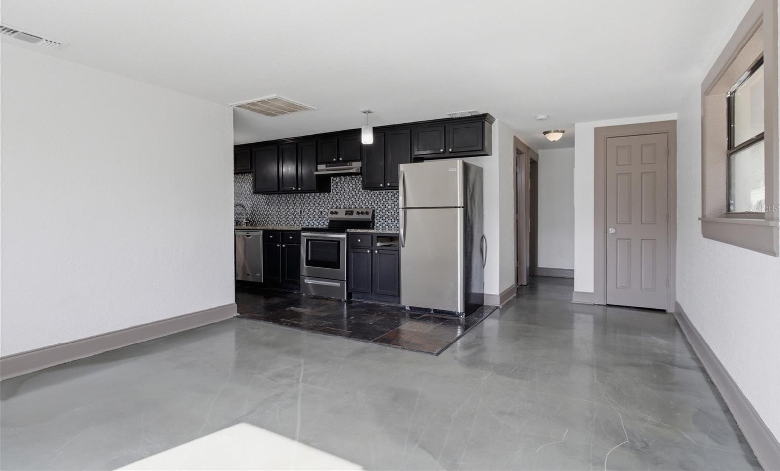 Built in 1971, the home has been updated with fresh paint and polished concrete flooring . The kitchen features slate flooring, granite countertops, a large glass tile mosaic backsplash, pendant lighting, and stainless steel appliances. It flows seamlessly into the living room, creating an open-concept layout ideal for everyday living and gatherings. Situated on a 60x124 lot, this property offers a spacious rear yard perfect for entertaining family and friends.