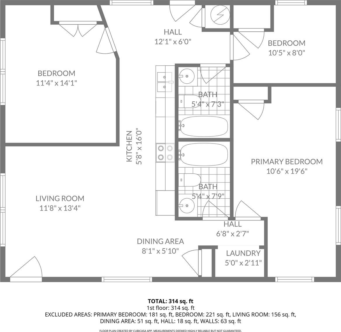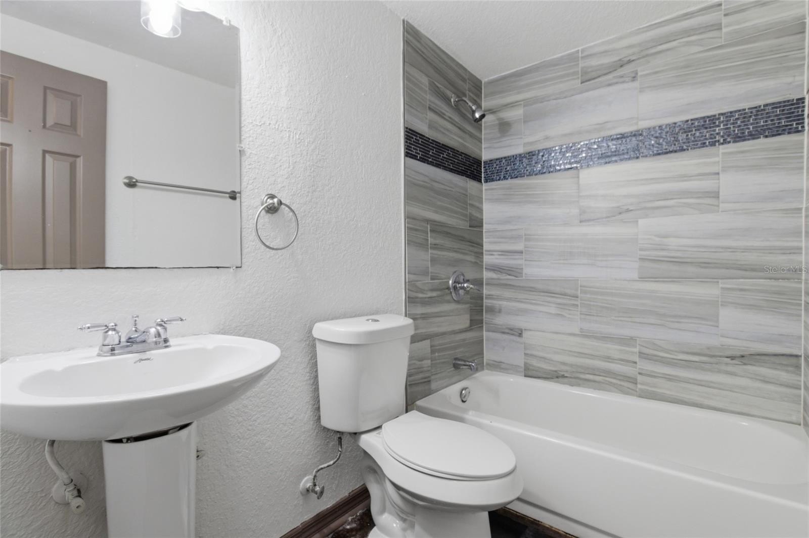 Both bathrooms include tub/shower combinations, toilets, and pedestal sinks. The primary bedroom suite is privately located at the rear of the home and features its own bathroom along with a convenient laundry closet with washer and dryer hookups.