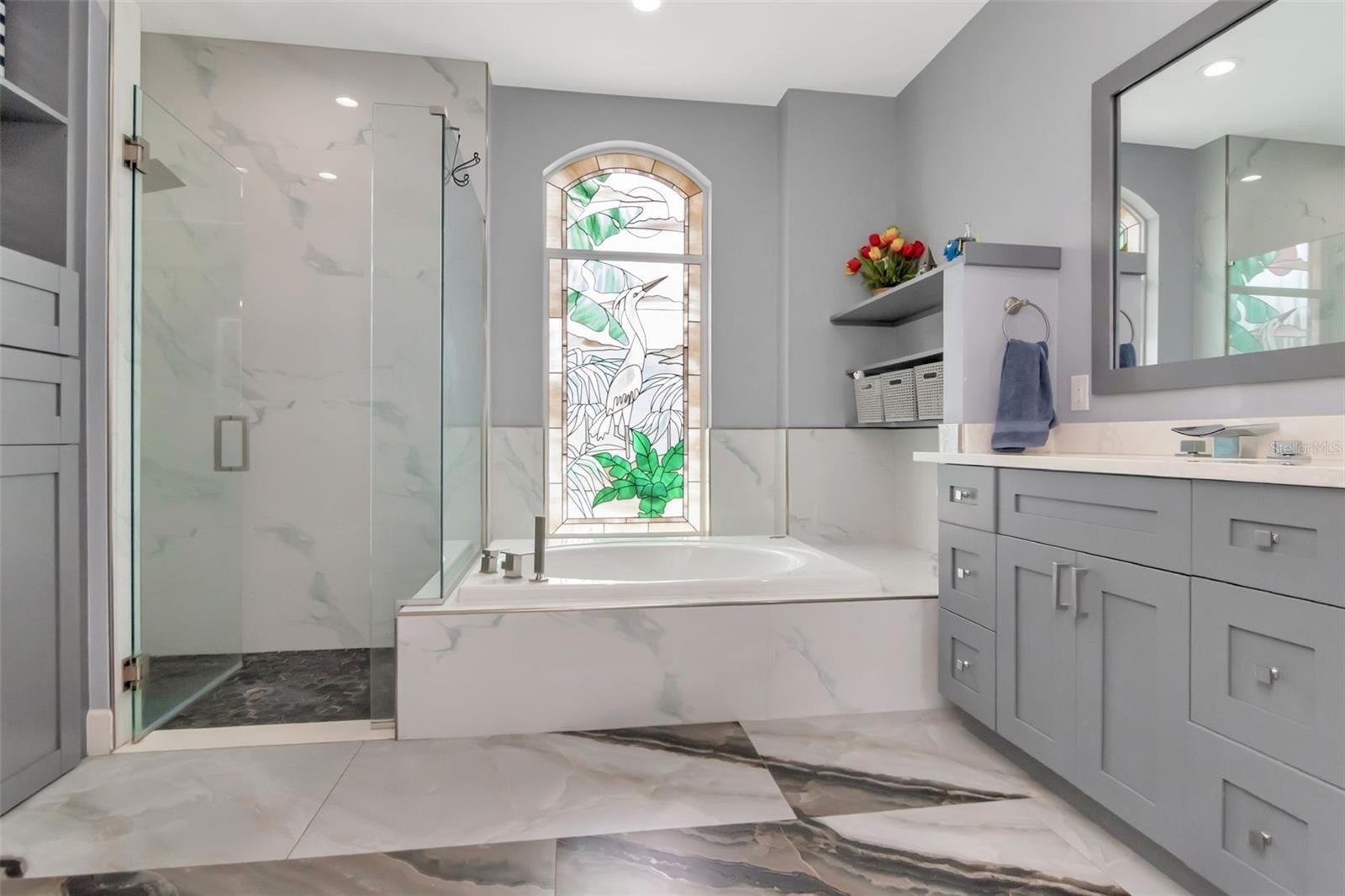 The spacious primary suite offers a private retreat, complete with walk-in closets and a luxurious en-suite bathroom featuring a soaking tub and separate walk-in shower. On the opposite side of the home, three additional bedrooms and two full bathrooms provide comfort and privacy for family or guests.