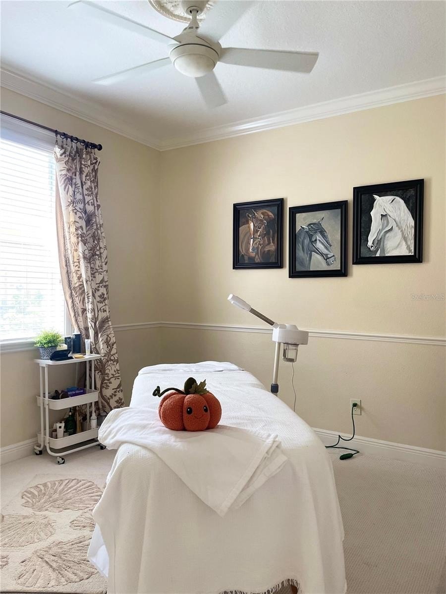 A first-floor bedroom (perfect for guests or a home office) is conveniently located next to a full bathroom and two linen closets. Additional features include a large laundry room with upper cabinetry and a utility sink.