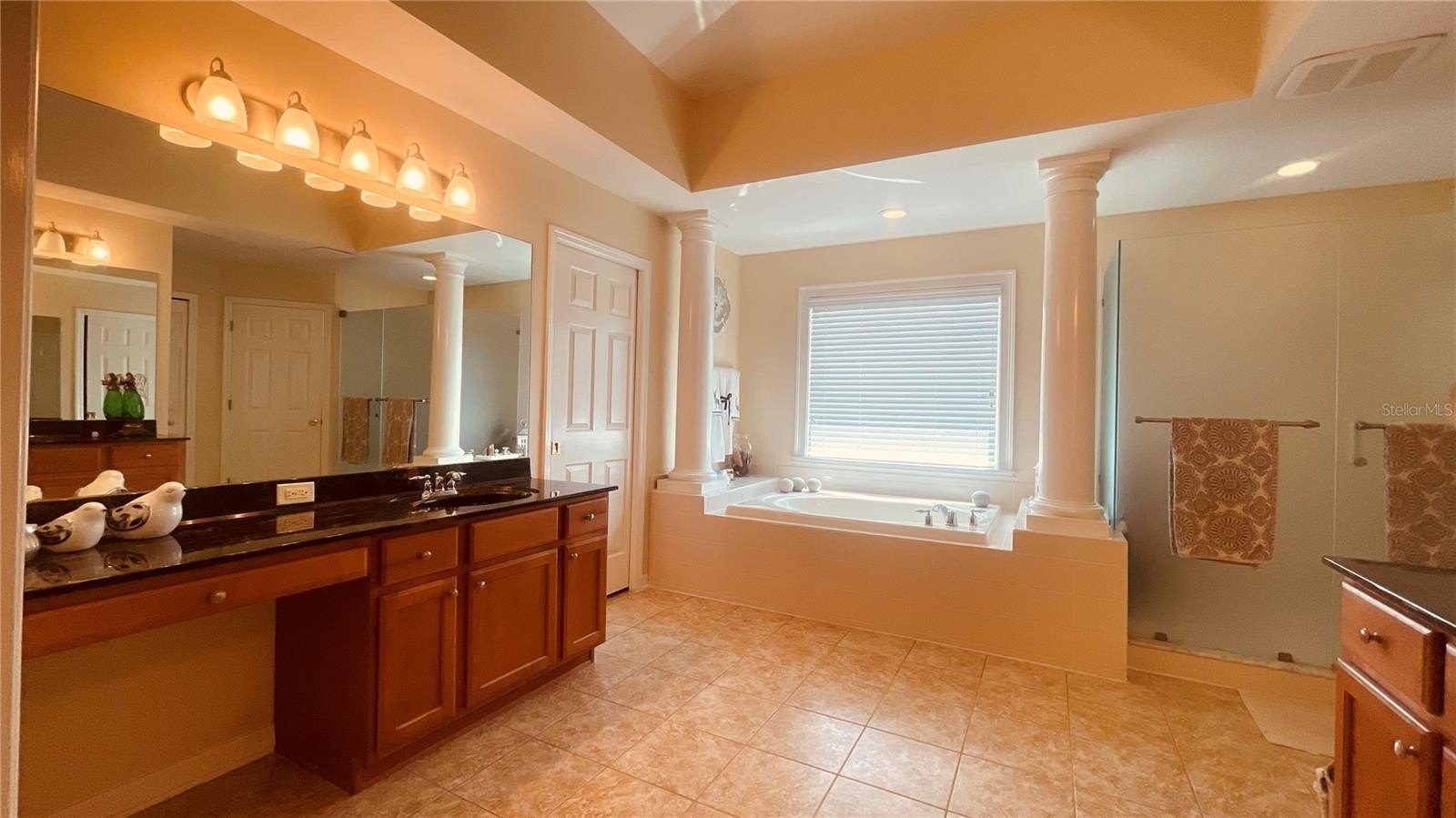 Upstairs, you’ll find a spacious primary suite with double-door entry, room for a sitting area, and private balcony access overlooking the sparkling pool (resurfaced in August 2020). The en-suite bathroom offers a spa-like experience with a soaking tub framed by Tuscan-style columns, dual vanities (including a dedicated makeup station), and ample space.