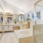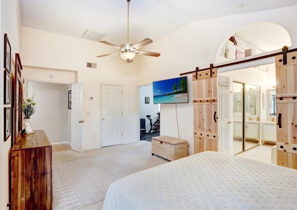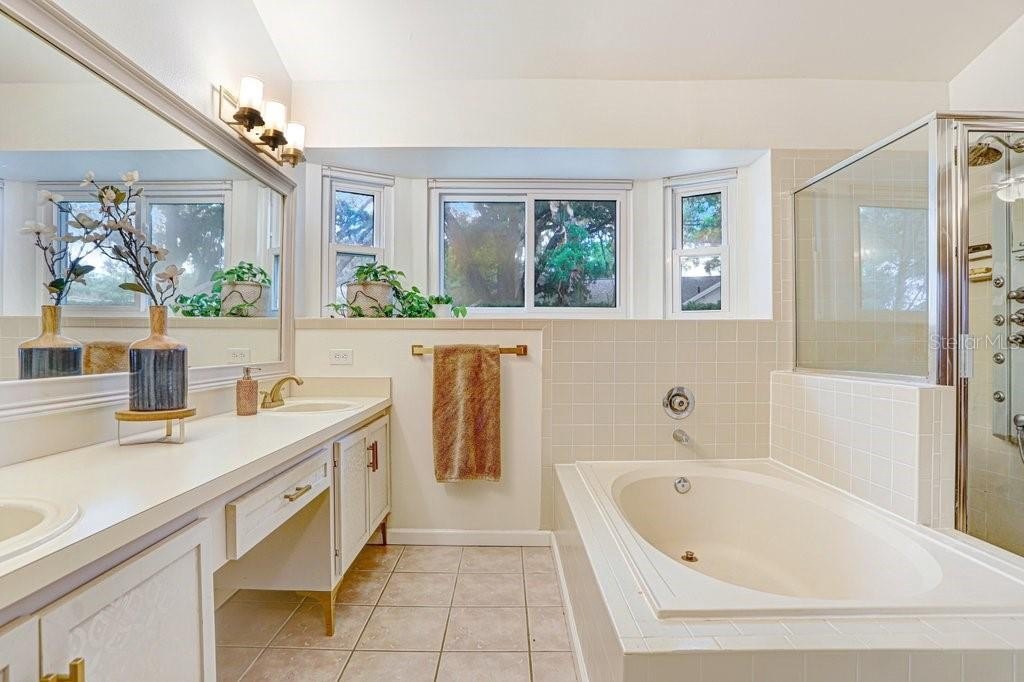 The first-floor primary suite offers a private retreat with an attached office, direct access to the lanai, and a spacious ensuite bathroom featuring dual vanities, a garden tub, and a separate shower. An additional full bathroom is also located on the main level for guests.