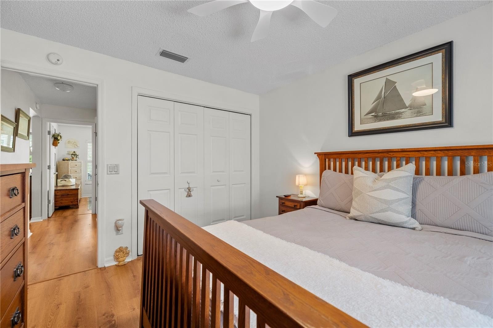Positioned in one of the most sought after central locations within The Villages, this well maintained 3 bedroom, 2 bathroom home offers the perfect blend of comfort, convenience, and access to the community’s unmatched lifestyle. Major system updates add value and peace of mind, including a roof that is approximately 5 years old and an AC system that is approximately 6 years old. Inside, the home features a functional and inviting layout with vaulted ceilings in the main living area, creating a bright and open feel. The living room, dining area, and all three bedrooms feature laminated wood flooring, complemented by neutral interior tones throughout. The kitchen is equipped with classic oak cabinetry, offering both warmth and functionality. Additional highlights include plantation shutters and a solar tube that enhances natural light within the home. The primary suite is designed for comfort, featuring a spacious layout, double sinks, and a walk in shower. Just off the primary bathroom is a dedicated laundry room with a separate door leading directly to the garage for added convenience. Two additional bedrooms provide flexible space for guests, a home office, or hobbies. Step outside to a screened lanai offering complete privacy, surrounded by mature trees and lush landscaping, creating a peaceful and secluded outdoor setting. What truly sets this property apart is its exceptional location. Just a short golf cart ride away, Spanish Springs Town Square is approximately 1.5 to 2 miles away, offering dining, shopping, and nightly live entertainment. Lake Sumter Landing Market Square is also within easy reach at approximately 3 to 4 miles, featuring waterfront dining, boutique shopping, and vibrant entertainment options. Golf enthusiasts will appreciate the close proximity to several courses, including Mira Mesa Executive Golf Course, Tierra Del Sol Golf & Country Club, and De La Vista Golf Course, all just minutes away by golf cart. Nearby Chula Vista Recreation Center provides access to pools, fitness facilities, clubs, and a full calendar of activities. With true golf cart accessibility to multiple town squares, recreation centers, and golf courses, this home delivers the convenience and active lifestyle that make The Villages one of Florida’s most desirable communities.