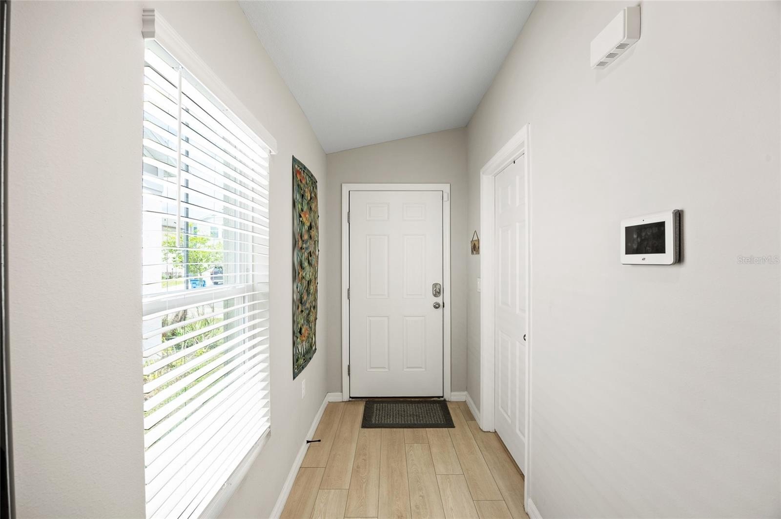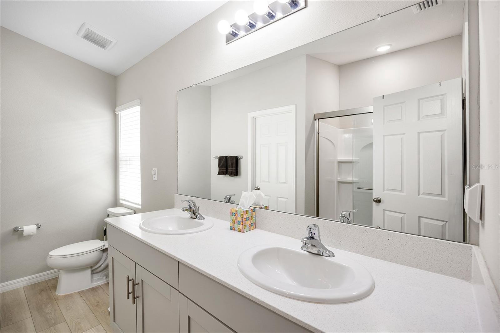The primary suite provides a comfortable retreat with an en-suite bath and ample closet space. Ceiling fans are installed in all bedrooms, as well as the living and dining areas, providing added comfort throughout the home. Additional interior features include tinted film on the back sliding doors and primary bedroom windows, along with a professionally installed ADT security system.