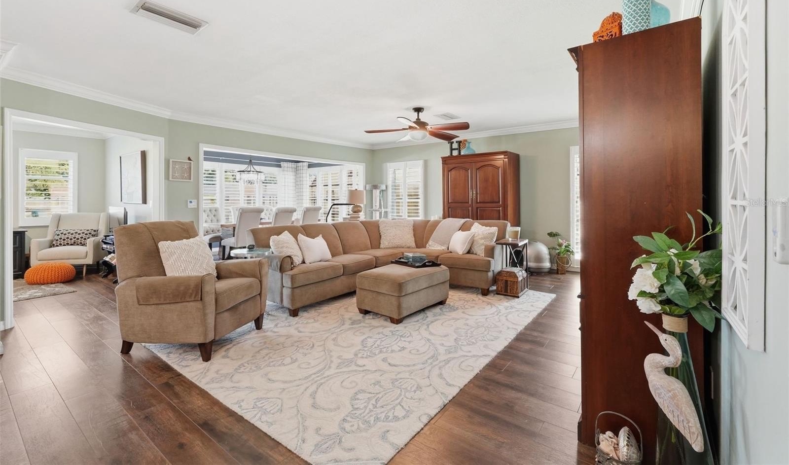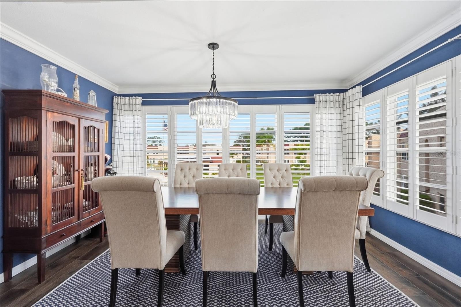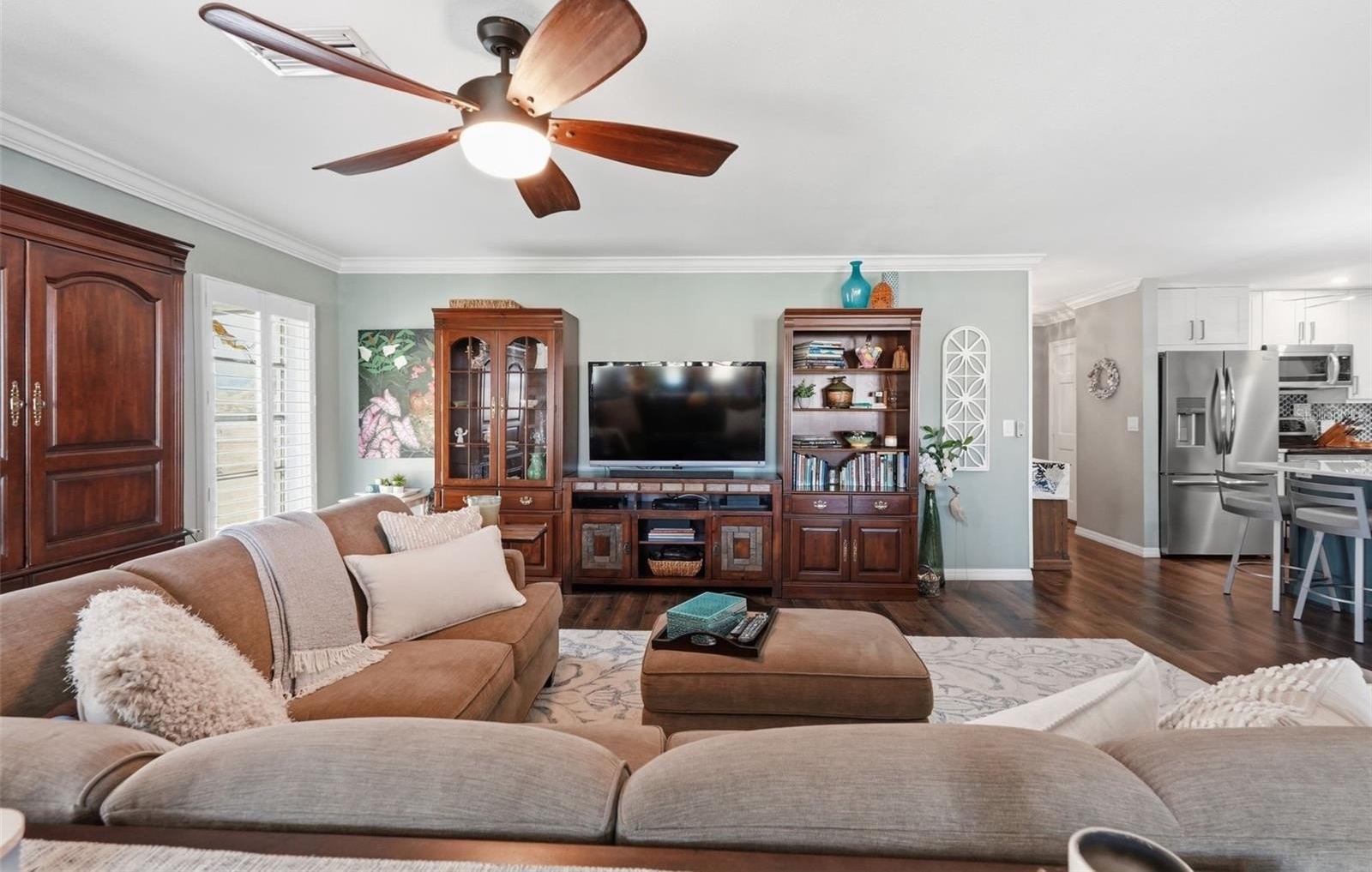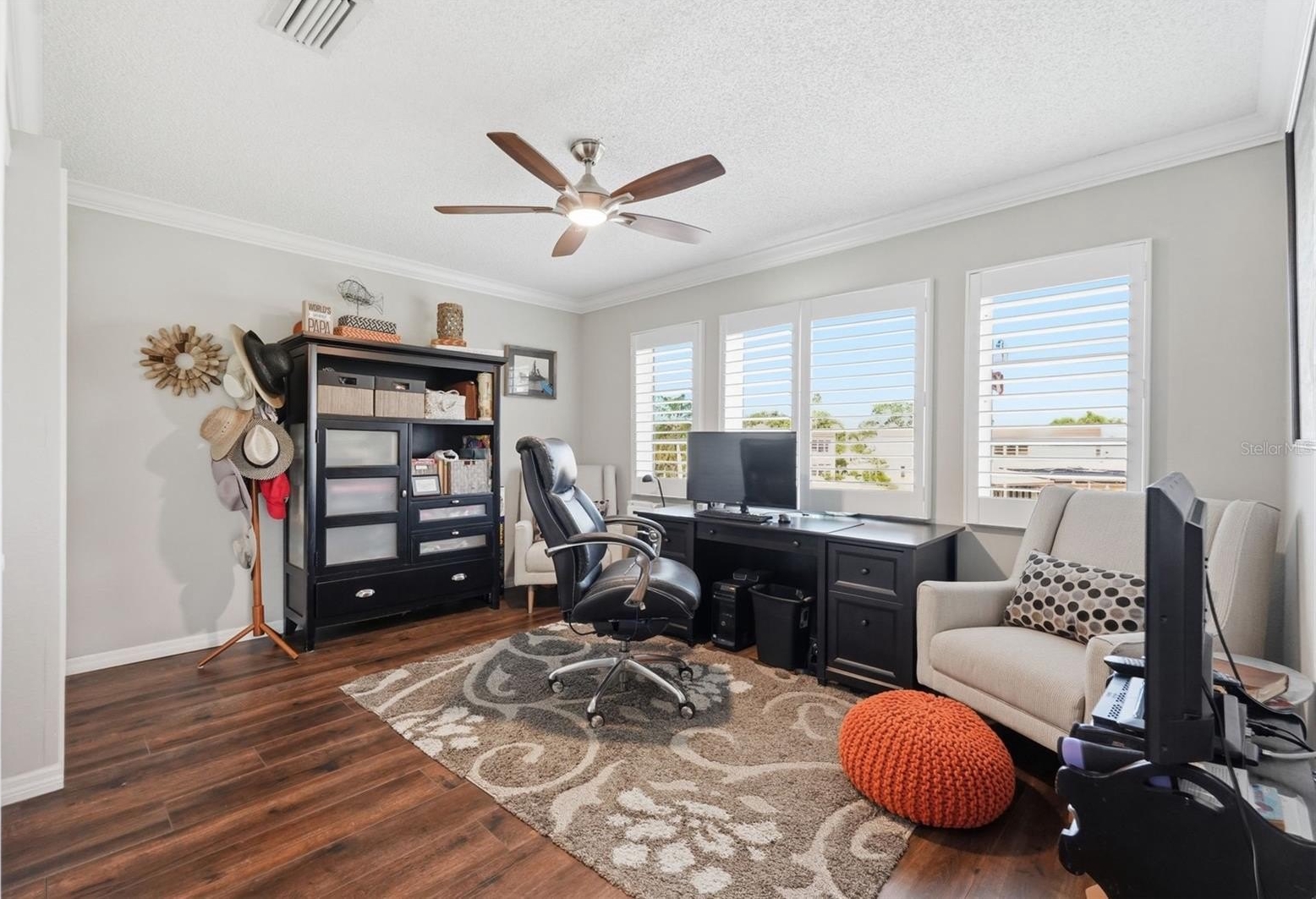 Throughout the home, you'll discover tasteful upgrades including six-panel doors with newer hardware, crown molding, updated baseboards, and contemporary lighting fixtures with ceiling fans. Professionally installed plantation shutters frame the windows beautifully, while durable waterproof laminate flooring flows seamlessly from room to room. Both bathrooms have been refreshed with newer vanities, and the guest bath features a convenient walk-in shower.