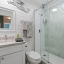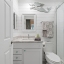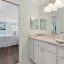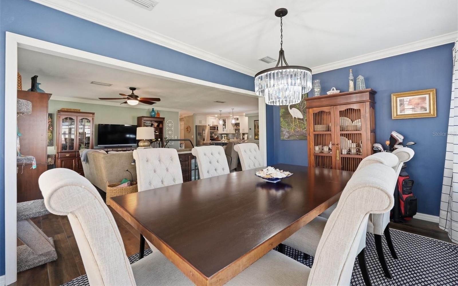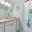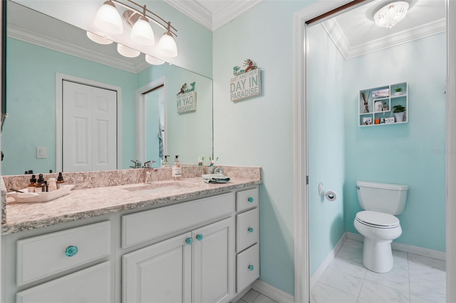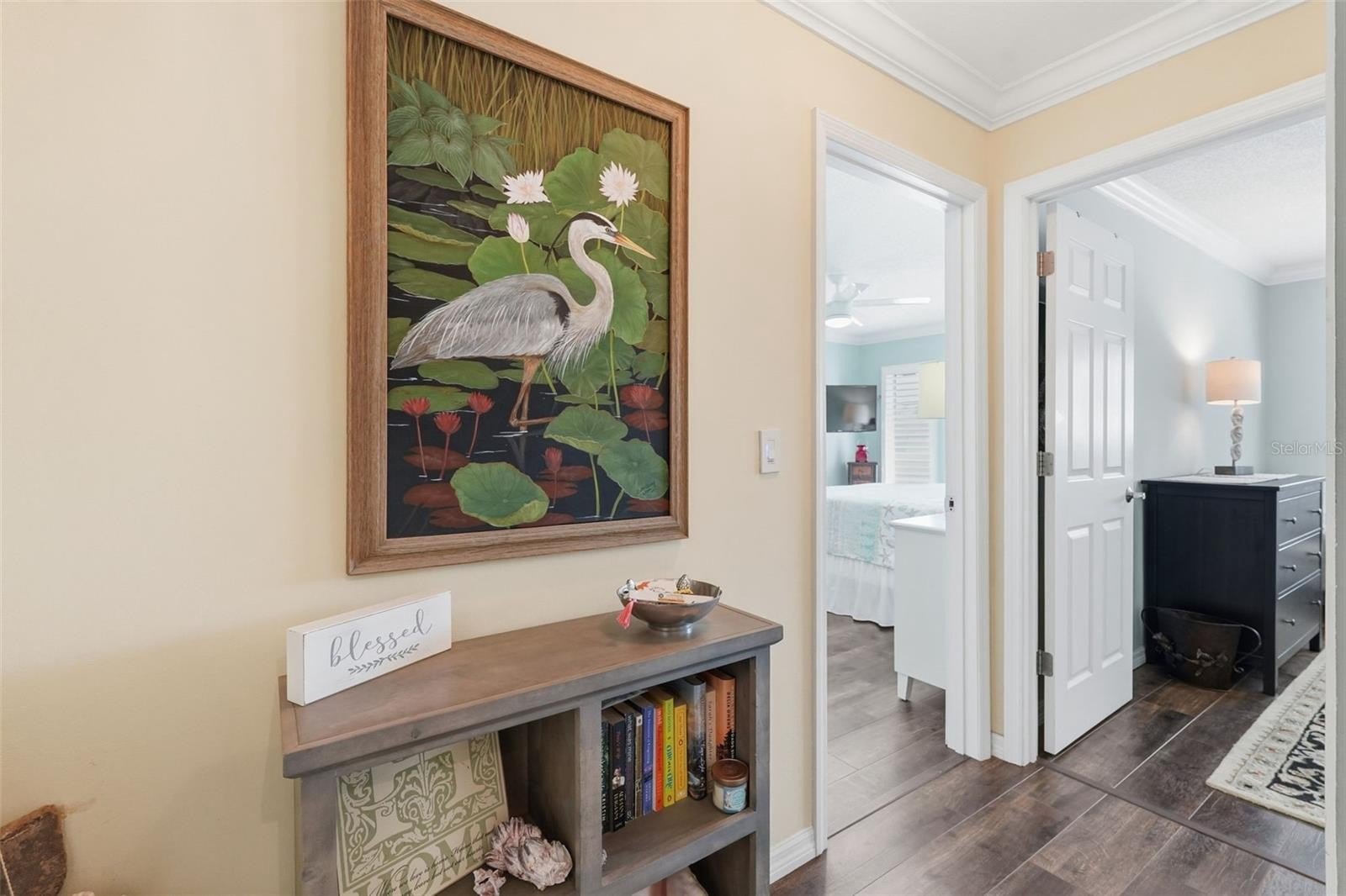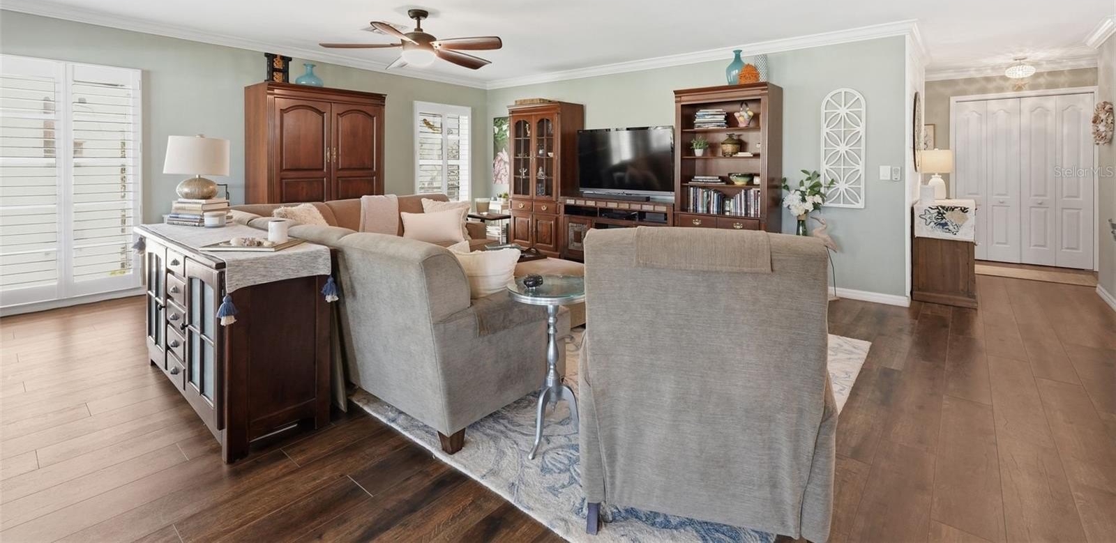 Throughout the home, you'll discover tasteful upgrades including six-panel doors with newer hardware, crown molding, updated baseboards, and contemporary lighting fixtures with ceiling fans. Professionally installed plantation shutters frame the windows beautifully, while durable waterproof laminate flooring flows seamlessly from room to room. Both bathrooms have been refreshed with newer vanities, and the guest bath features a convenient walk-in shower.