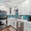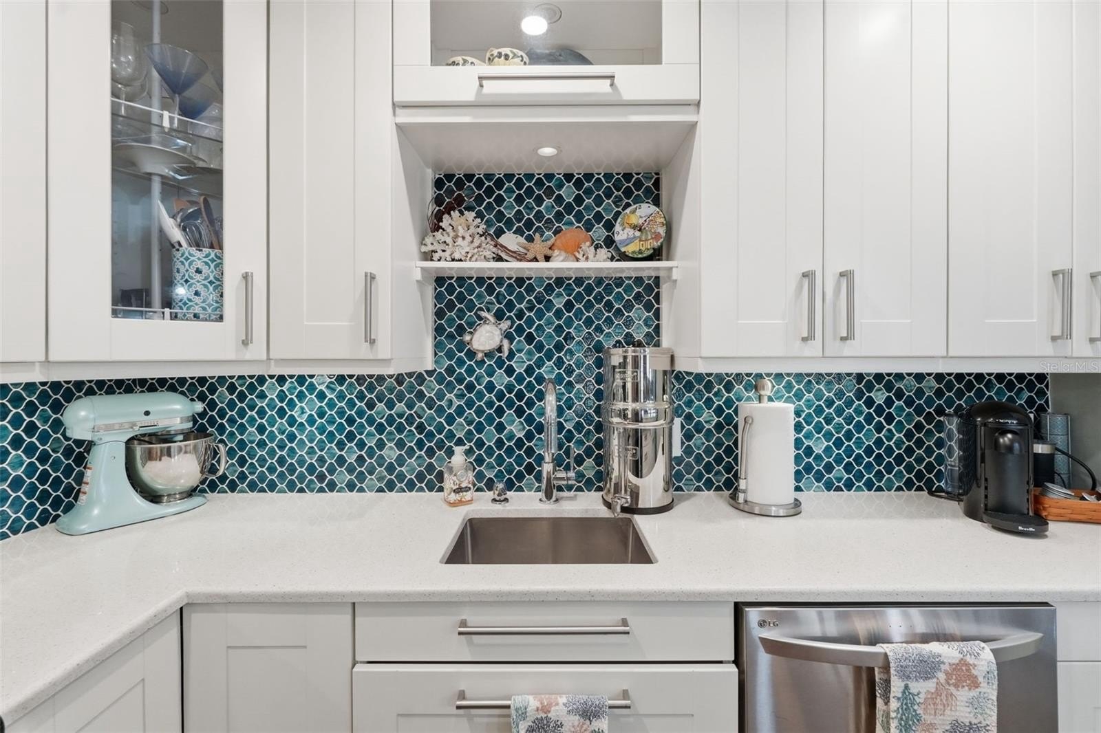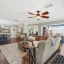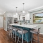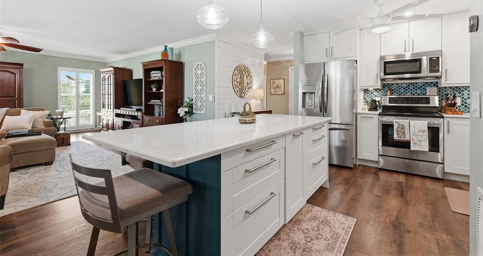 The bright, open-concept kitchen is a true showstopper, featuring elegant quartz countertops, a gorgeous tile backsplash, and gleaming LG stainless steel appliances. The expansive breakfast bar — measuring nearly 3.5 by 8 feet — comfortably seats up to six, making it the ideal gathering spot for morning coffee or evening entertaining. Every detail has been thoughtfully considered, from abundant storage to modern finishes that elevate the entire space.