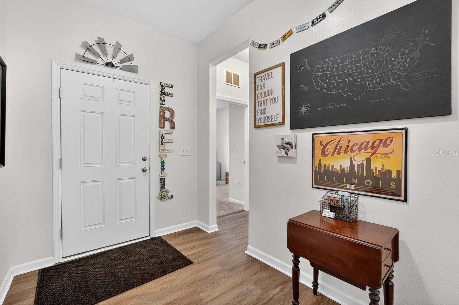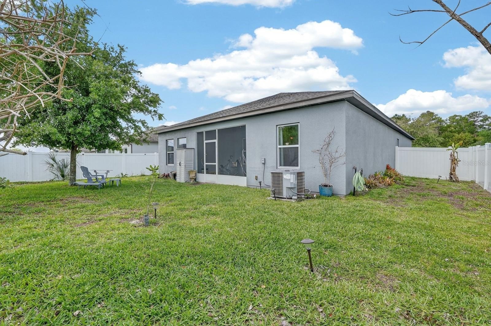 Beautifully maintained and move-in ready, this 3-bedroom, 2-bath home in Deltona offers a bright, open layout designed for comfortable everyday living. Built in 2019, the popular Hawking floor plan features spacious living areas, a split-bedroom design for added privacy, and thoughtful updates throughout. The kitchen is the heart of the home, showcasing a large center island, stainless steel appliances, ample counter space, and a functional layout perfect for both daily use and entertaining. The open-concept design flows seamlessly into the dining and living areas, creating an inviting space filled with natural light. Brand new luxury vinyl plank flooring runs throughout the main living areas, while the bedrooms are comfortably carpeted. Step outside to enjoy the enclosed back porch--an ideal spot to relax year-round--overlooking a backyard with banana and plantain trees for a touch of Florida charm.Additional features include a built-in irrigation system, well-kept landscaping, and a high-and-dry location with no history of flooding for added peace of mind. Conveniently located near shopping, dining, and major roadways, this home also sits within a community offering a pool for residents to enjoy.A truly well-cared-for home that combines style, function, and location--ready for its next owner.