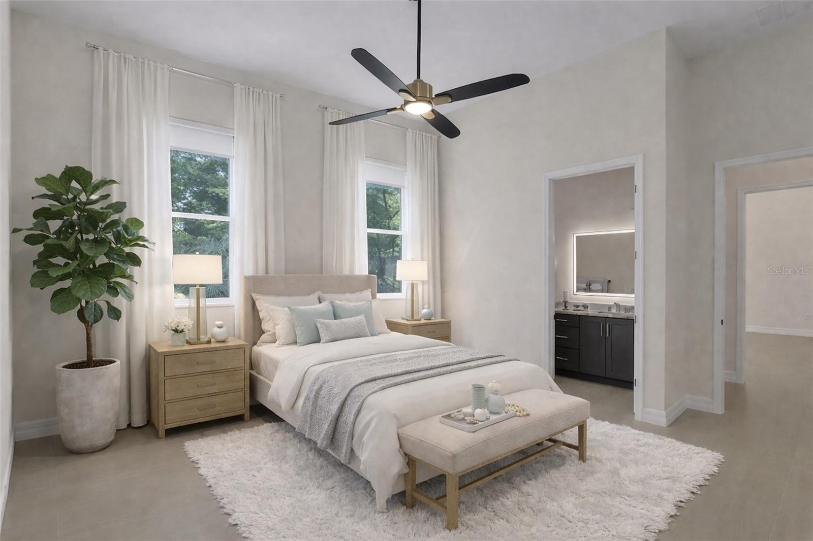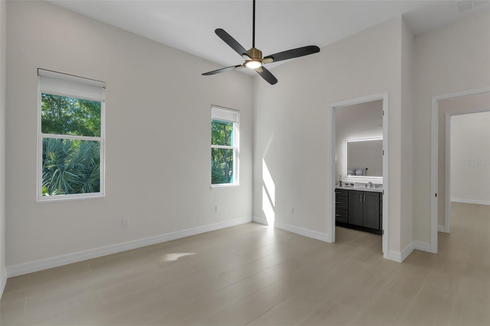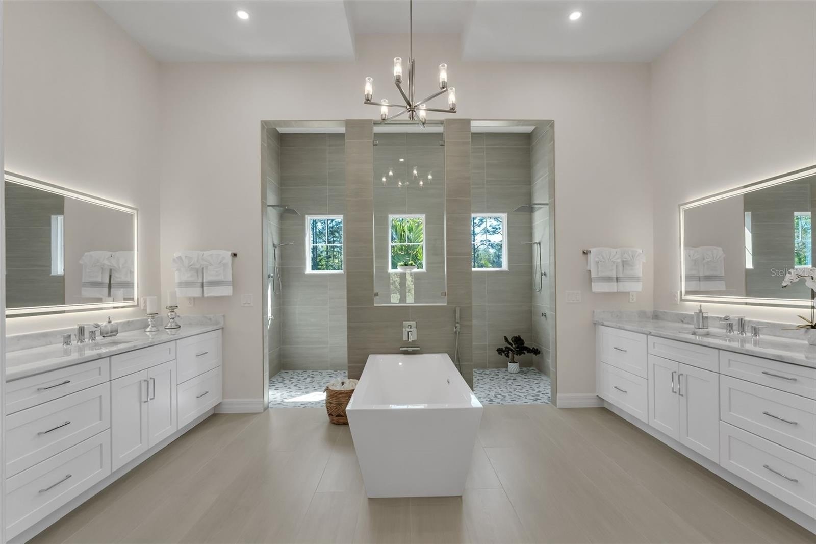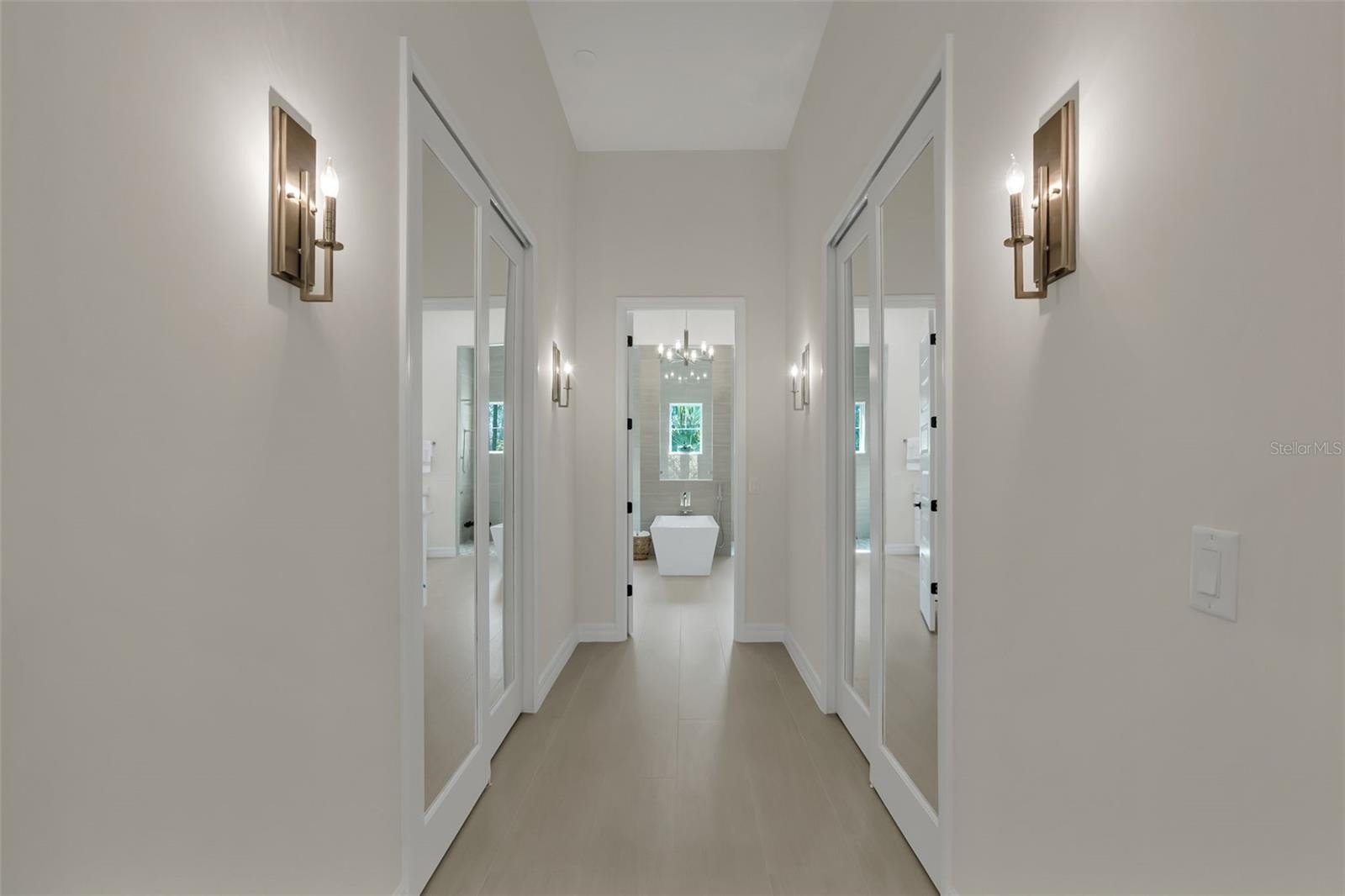 The luxurious primary suite is a true retreat, featuring an elegant double-door entry and dual oversized walk-in closets, including a custom “hers” closet measuring approximately 20’8” x 5’6” and a generous “his” closet at 13’8” x 5’8”, both designed with quality wood shelving and mirrored sliding doors.