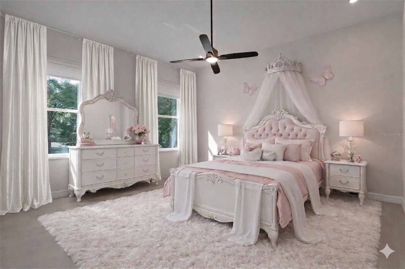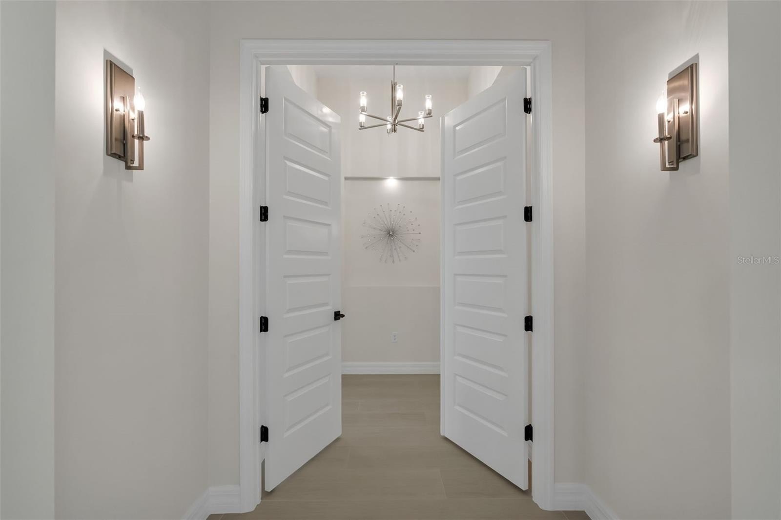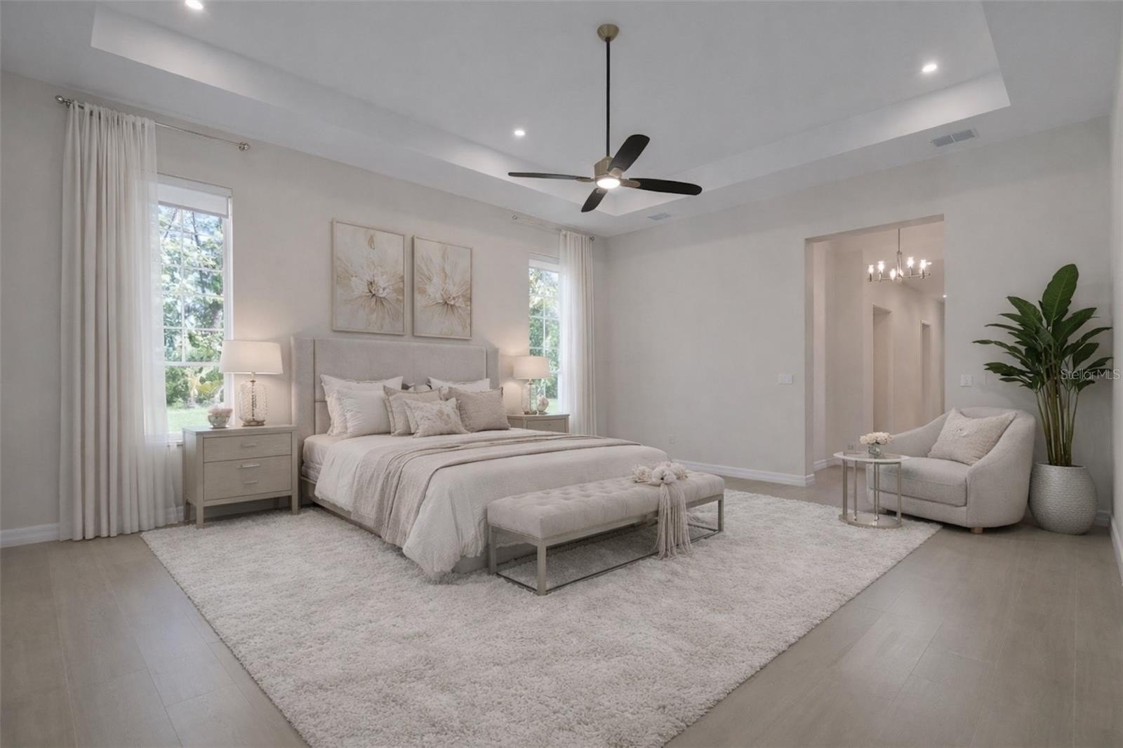 The luxurious primary suite is a true retreat, featuring an elegant double-door entry and dual oversized walk-in closets, including a custom “hers” closet measuring approximately 20’8” x 5’6” and a generous “his” closet at 13’8” x 5’8”, both designed with quality wood shelving and mirrored sliding doors.