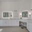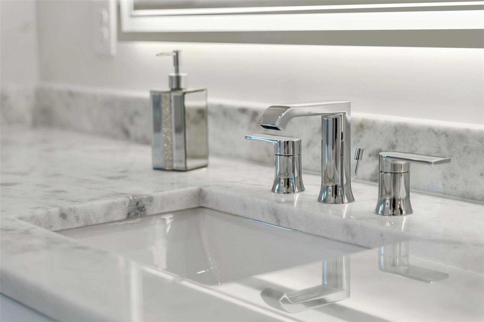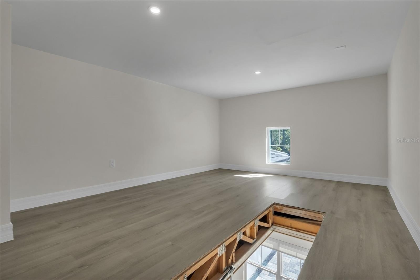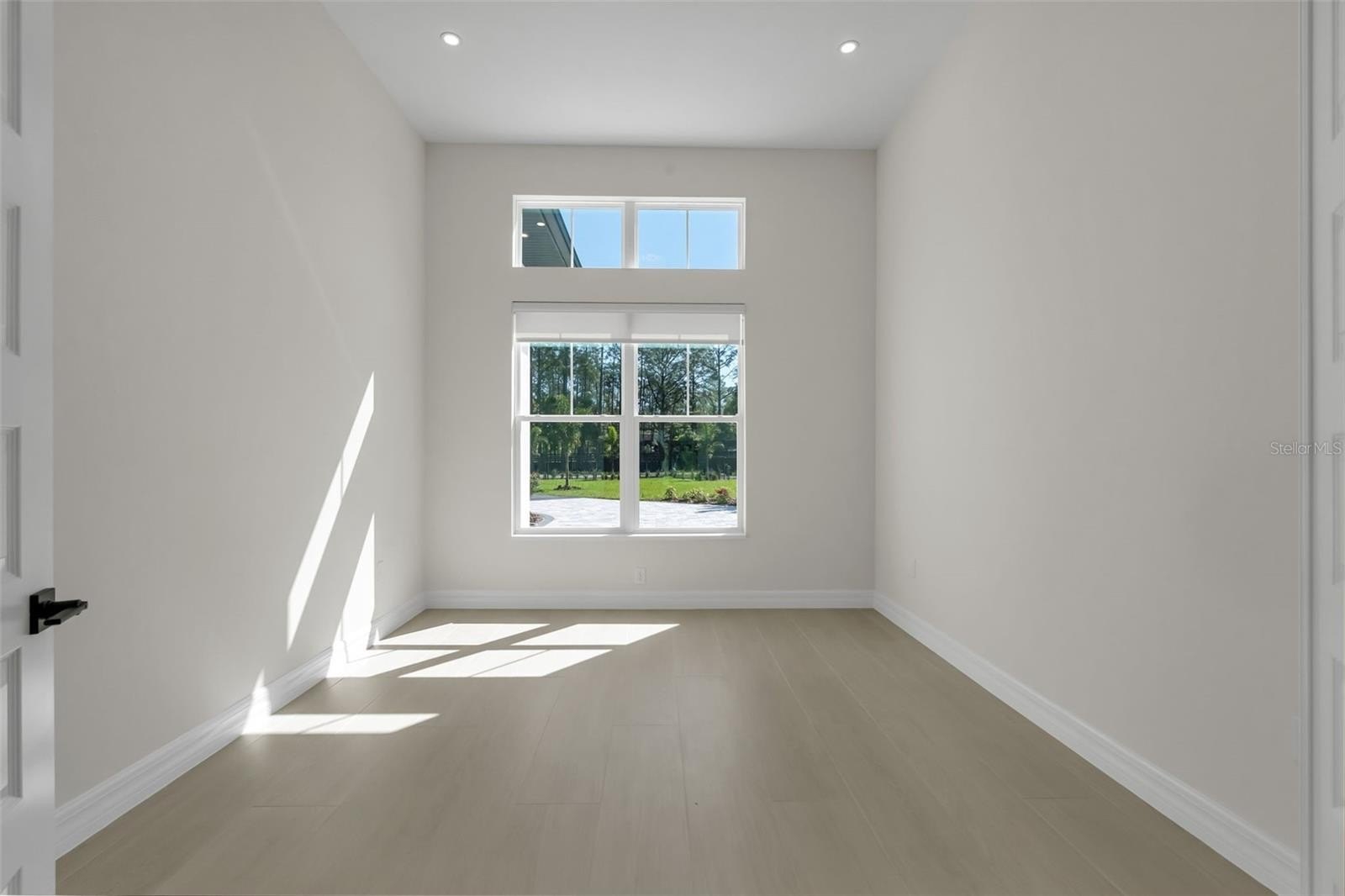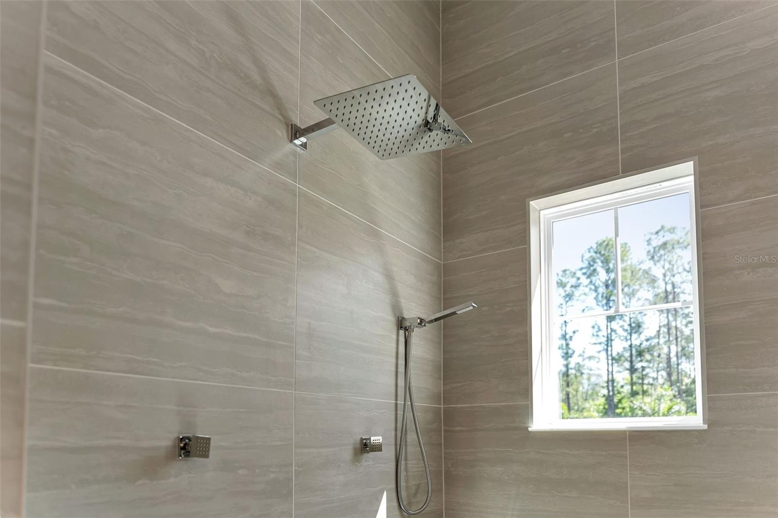 The luxurious primary suite is a true retreat, featuring an elegant double-door entry and dual oversized walk-in closets, including a custom “hers” closet measuring approximately 20’8” x 5’6” and a generous “his” closet at 13’8” x 5’8”, both designed with quality wood shelving and mirrored sliding doors.