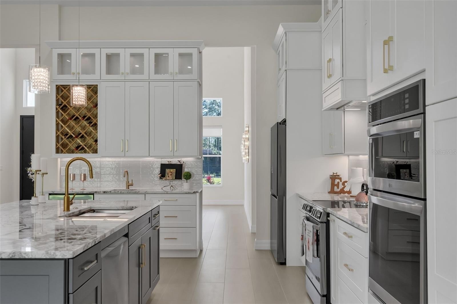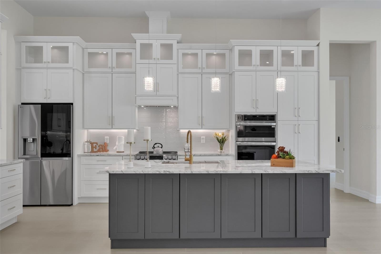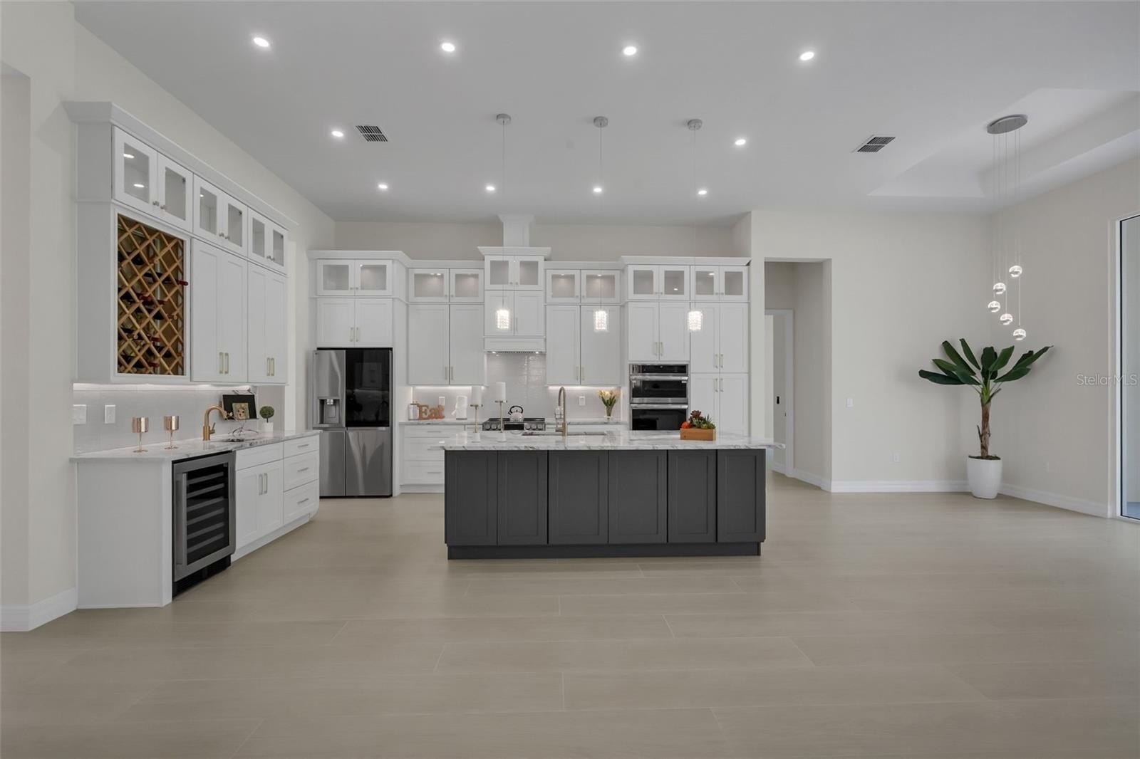 At the heart of the home is a stunning designer kitchen featuring an oversized island topped with Italian Mona Lisa granite, creating a true centerpiece for entertaining and everyday living. The kitchen is further enhanced by floor-to-ceiling custom cabinetry with illuminated upper display cabinets, a wet bar with wine cooler, and elegant finishes throughout. The open-concept layout flows seamlessly into the main living space, complemented by premium porcelain tile flooring throughout.