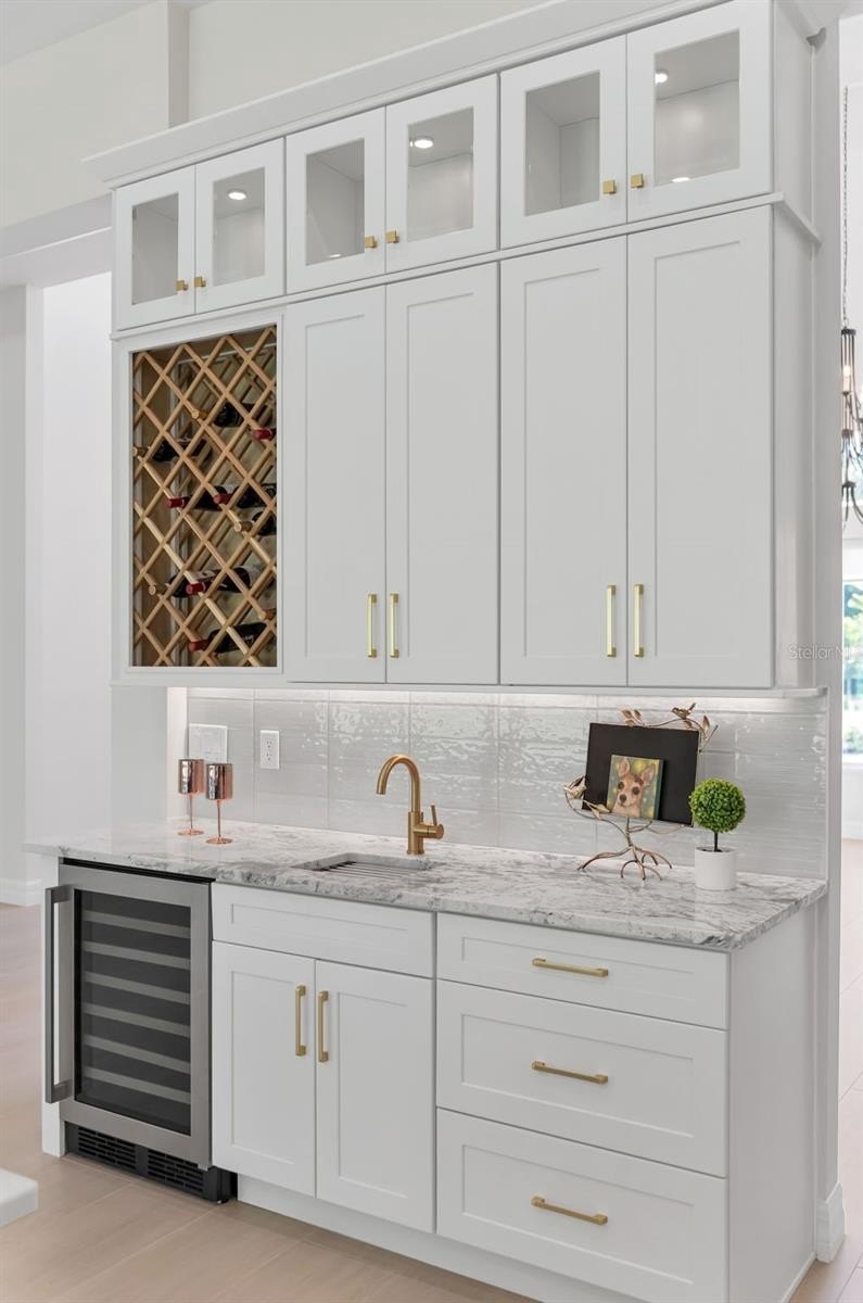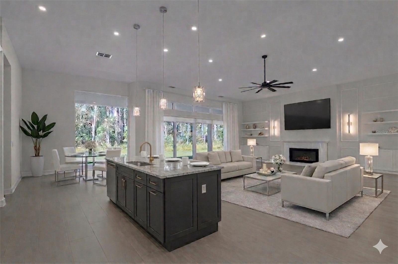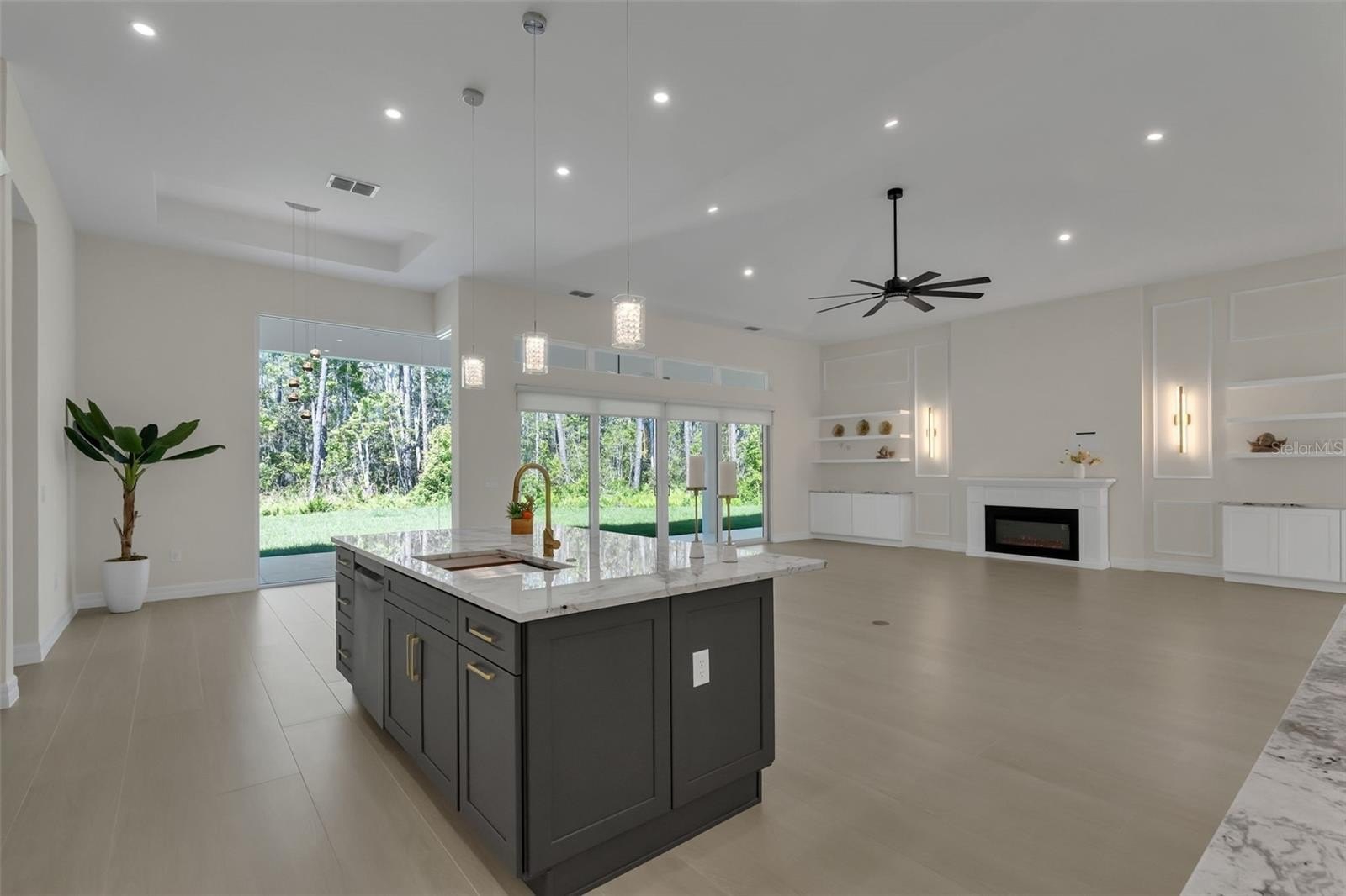 At the heart of the home is a stunning designer kitchen featuring an oversized island topped with Italian Mona Lisa granite, creating a true centerpiece for entertaining and everyday living. The kitchen is further enhanced by floor-to-ceiling custom cabinetry with illuminated upper display cabinets, a wet bar with wine cooler, and elegant finishes throughout. The open-concept layout flows seamlessly into the main living space, complemented by premium porcelain tile flooring throughout.