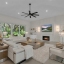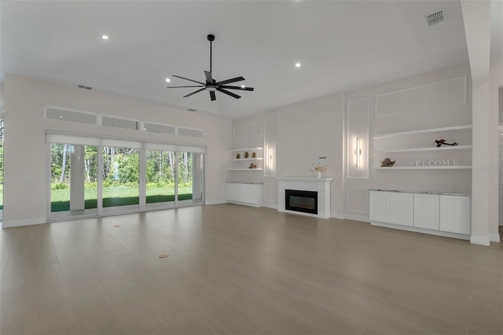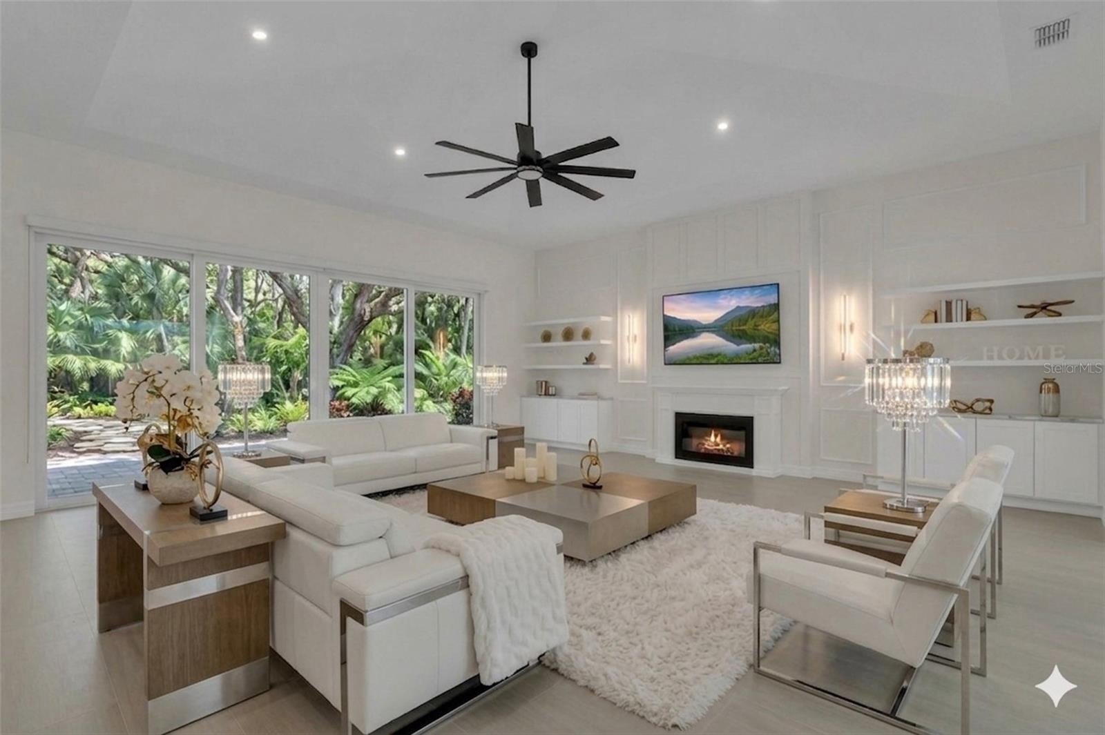 The spacious living area features a modern electric fireplace with mantel surround, beautifully complemented by custom built-in cabinetry and designer wall shelving, adding warmth and architectural elegance to the space.