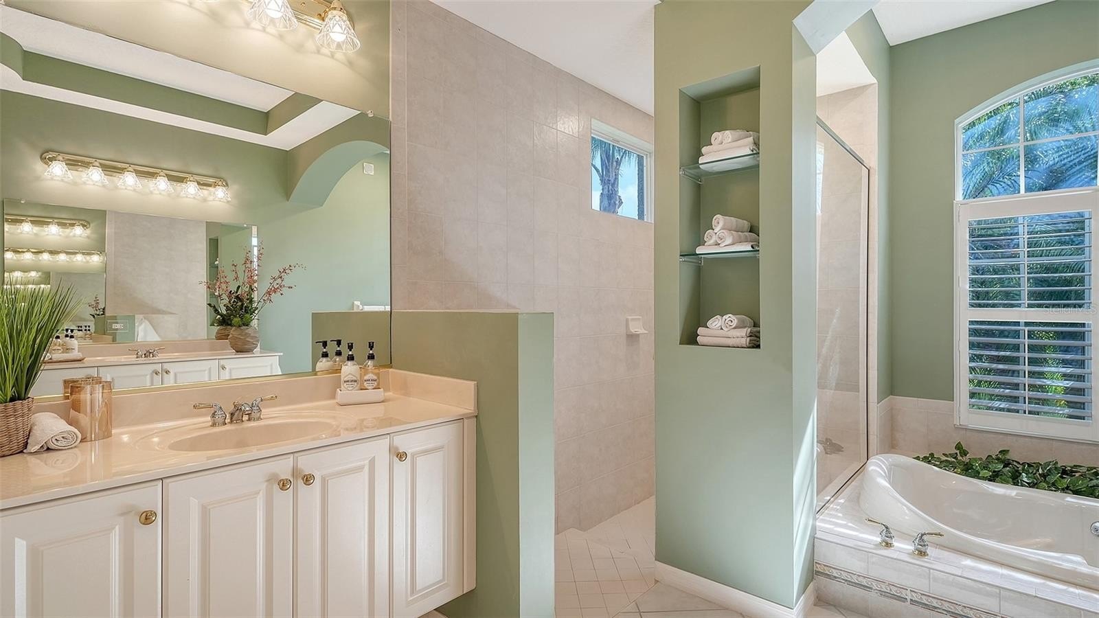 The spacious primary suite is a true retreat, featuring a beautiful bay window sitting area, private access to the lanai, and a well-appointed en-suite bath with separate vanities, a walk-in shower, and a relaxing jetted tub.