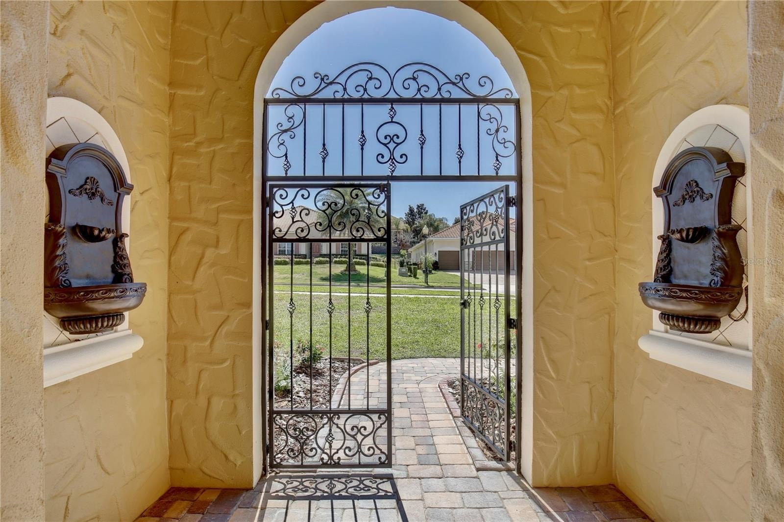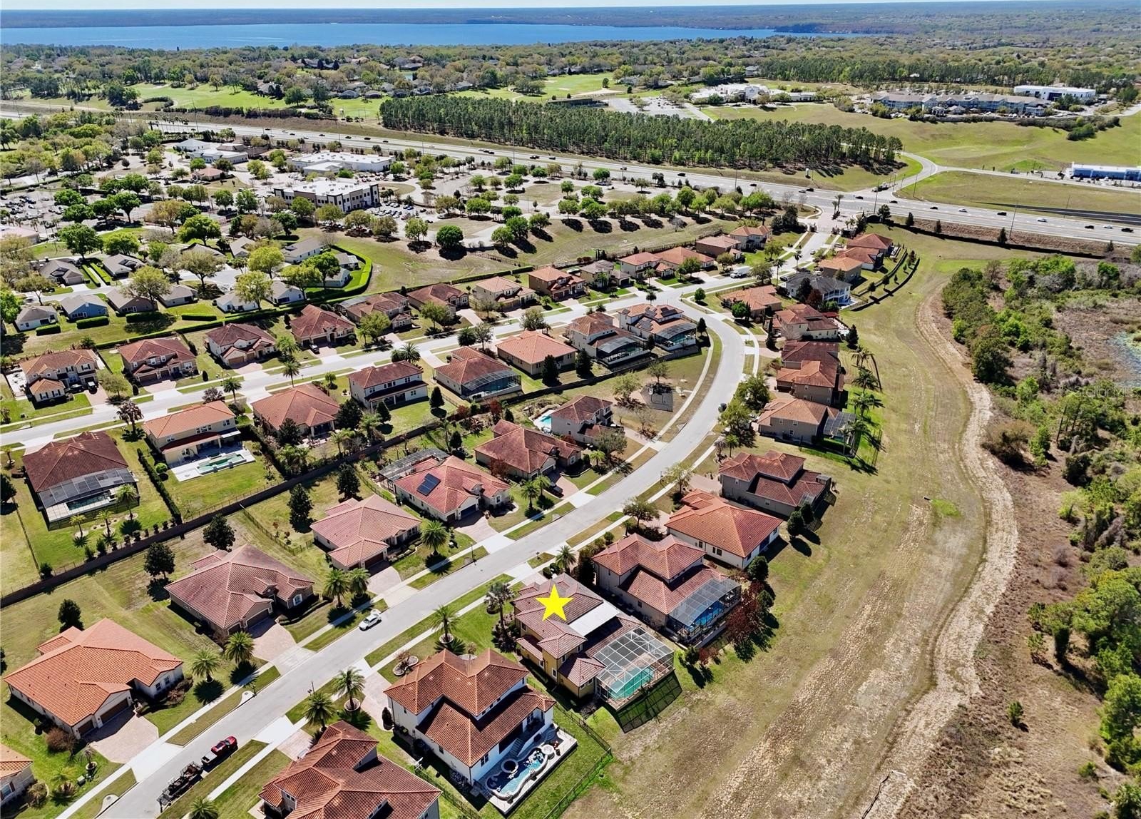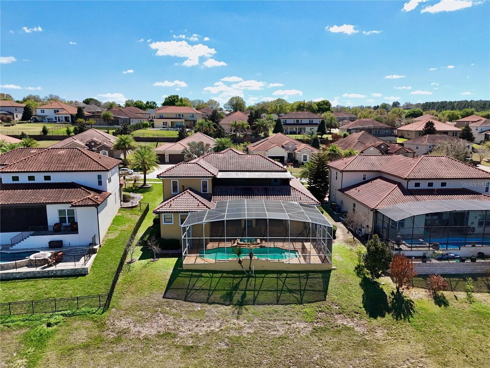 Welcome through the wrought iron gated entrance, where the sun catches the Spanish barrel tile roof and the shadows of swaying palm trees dance across the manicured lawn and paver driveway. Beyond the spacious three car garage, a grand entryway awaits. Framed by stately columns and graceful arched walkways, the home opens into a world of gleaming tile floors, neutral tones, and superior craftsmanship that feels both opulent and welcoming. To your left and right, formal living and dining spaces set the stage for unforgettable evenings. Look up to find the intricate beauty of a coffered ceiling and a warm wood panel accent, illuminated by the soft glow of chandeliers. Just steps away, your finest vintages are showcased behind the wrought iron door of a dedicated wine cellar, complete with a wine fridge and ample racks. The main family room is a masterpiece of light and volume. Soaring ceilings and sliding glass doors frame stunning water vistas, while a fireplace adds a cozy anchor to the space. For the culinary enthusiast, the gourmet kitchen is a dream realized. Wrapped in beautiful cabinetry and granite counters, this space features a gas stove with a pot filler and a range surrounded by brick, stainless steel appliances, built-in double ovens, and a center island. There is also a dedicated coffee station adjacent to a spacious pantry closet. The primary suite provides a restful sanctuary. Under a custom ceiling, you can lounge by the shared fireplace that bridges the bedroom and the luxurious primary bathroom. Wake up and step through French doors directly onto the patio, take a dip in the pool, and indulge in the spa-like bath featuring a bathtub, bench seating, and a walk in shower. Dual vanities and two private toilets provide ultimate convenience, while a massive walk-in closet with built-ins flow seamlessly into the laundry room. This versatile home adapts to your lifestyle; work from the first-floor bonus room, featuring pocket doors for privacy, an en suite bathroom, and patio access, making for a wonderful home office. Upstairs, a hallway overlooks the grand living space below, leading to a home theater equipped with a projector, sconce lighting, elevated floor for seating, and a wet bar with a mini-fridge and half bath. The second floor also houses two guest bedrooms joined by a Jack and Jill style bath with dual sinks and a glass door shower. A fourth bedroom situated next to a full guest bath features direct access to an enclosed balcony. The transition to the incredible outdoor living space is effortless. Relax under wood panel ceilings by the dual sided fireplace, host summer soirées from your outdoor kitchen, and lounge in the swimming pool overlooking tranquil water views. Nestled in the gated community of Bella Lago, you’ll enjoy access to a private fishing pier while being perfectly positioned in Clermont, moments away from shops, dining, and main roads. Experience this unparalleled estate firsthand.