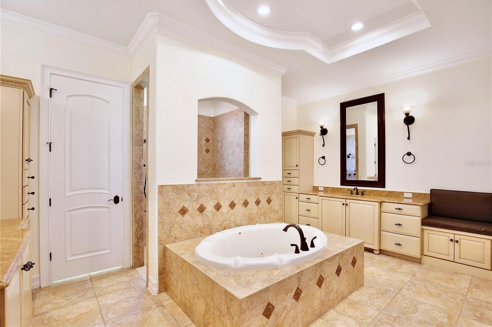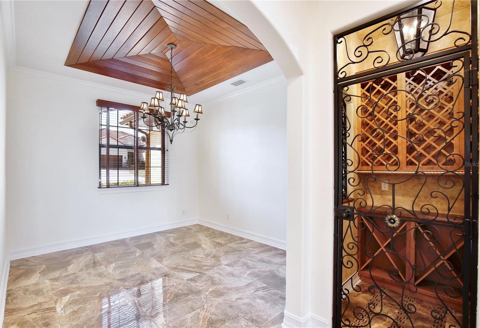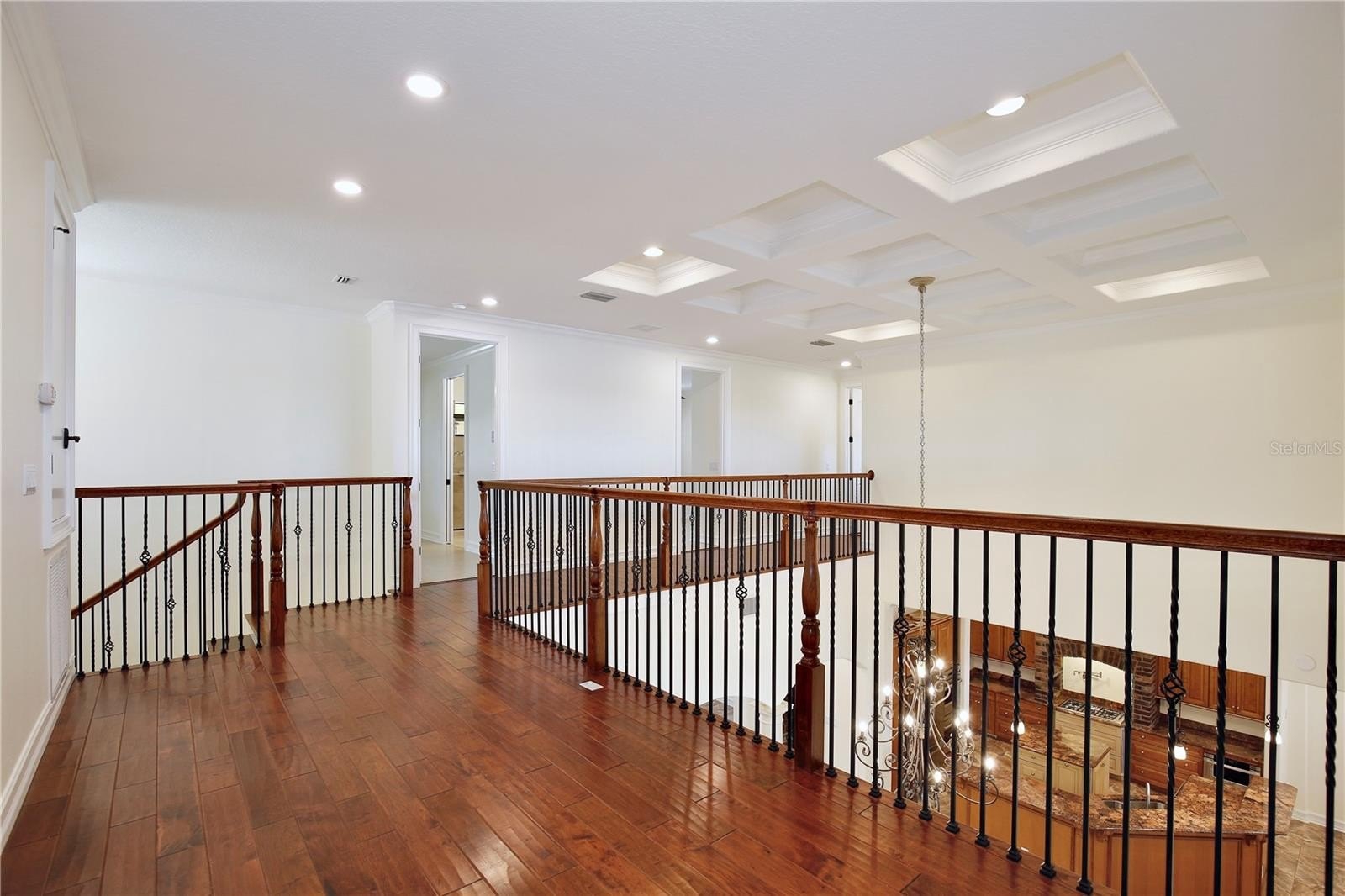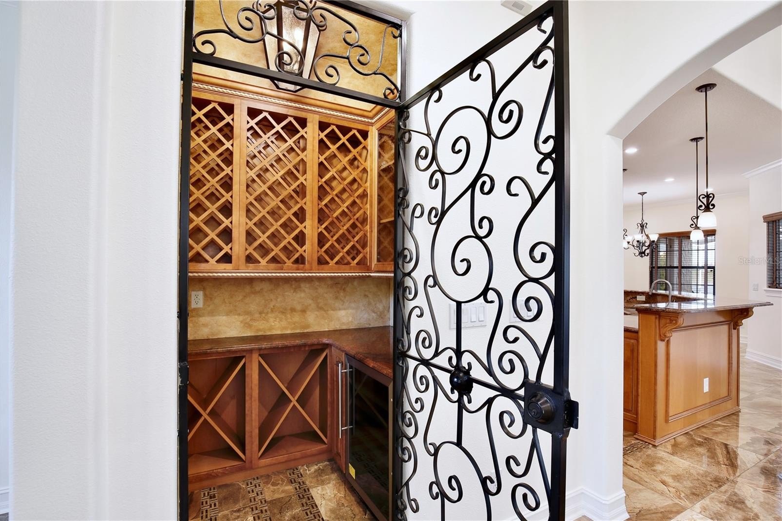 Welcome through the wrought iron gated entrance, where the sun catches the Spanish barrel tile roof and the shadows of swaying palm trees dance across the manicured lawn and paver driveway. Beyond the spacious three car garage, a grand entryway awaits. Framed by stately columns and graceful arched walkways, the home opens into a world of gleaming tile floors, neutral tones, and superior craftsmanship that feels both opulent and welcoming. To your left and right, formal living and dining spaces set the stage for unforgettable evenings. Look up to find the intricate beauty of a coffered ceiling and a warm wood panel accent, illuminated by the soft glow of chandeliers. Just steps away, your finest vintages are showcased behind the wrought iron door of a dedicated wine cellar, complete with a wine fridge and ample racks. The main family room is a masterpiece of light and volume. Soaring ceilings and sliding glass doors frame stunning water vistas, while a fireplace adds a cozy anchor to the space. For the culinary enthusiast, the gourmet kitchen is a dream realized. Wrapped in beautiful cabinetry and granite counters, this space features a gas stove with a pot filler and a range surrounded by brick, stainless steel appliances, built-in double ovens, and a center island. There is also a dedicated coffee station adjacent to a spacious pantry closet. The primary suite provides a restful sanctuary. Under a custom ceiling, you can lounge by the shared fireplace that bridges the bedroom and the luxurious primary bathroom. Wake up and step through French doors directly onto the patio, take a dip in the pool, and indulge in the spa-like bath featuring a bathtub, bench seating, and a walk in shower. Dual vanities and two private toilets provide ultimate convenience, while a massive walk-in closet with built-ins flow seamlessly into the laundry room. This versatile home adapts to your lifestyle; work from the first-floor bonus room, featuring pocket doors for privacy, an en suite bathroom, and patio access, making for a wonderful home office. Upstairs, a hallway overlooks the grand living space below, leading to a home theater equipped with a projector, sconce lighting, elevated floor for seating, and a wet bar with a mini-fridge and half bath. The second floor also houses two guest bedrooms joined by a Jack and Jill style bath with dual sinks and a glass door shower. A fourth bedroom situated next to a full guest bath features direct access to an enclosed balcony. The transition to the incredible outdoor living space is effortless. Relax under wood panel ceilings by the dual sided fireplace, host summer soirées from your outdoor kitchen, and lounge in the swimming pool overlooking tranquil water views. Nestled in the gated community of Bella Lago, you’ll enjoy access to a private fishing pier while being perfectly positioned in Clermont, moments away from shops, dining, and main roads. Experience this unparalleled estate firsthand.