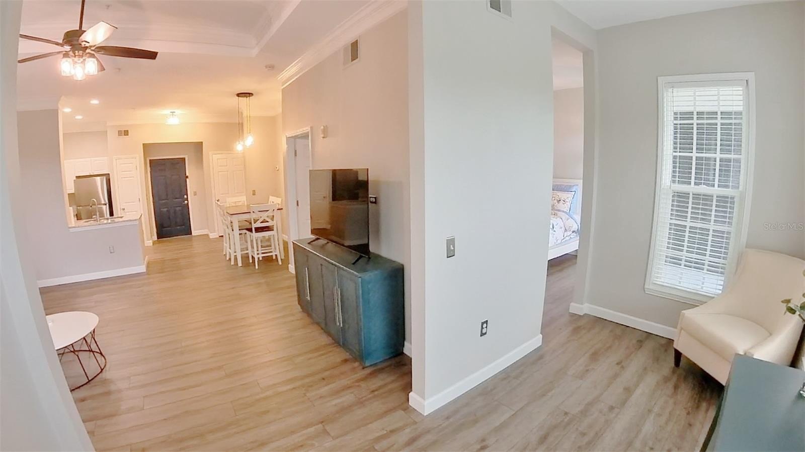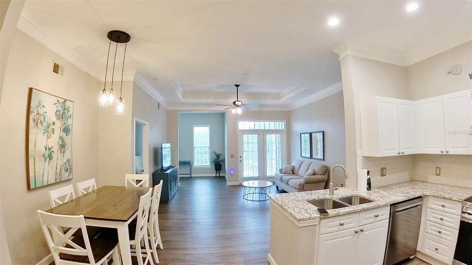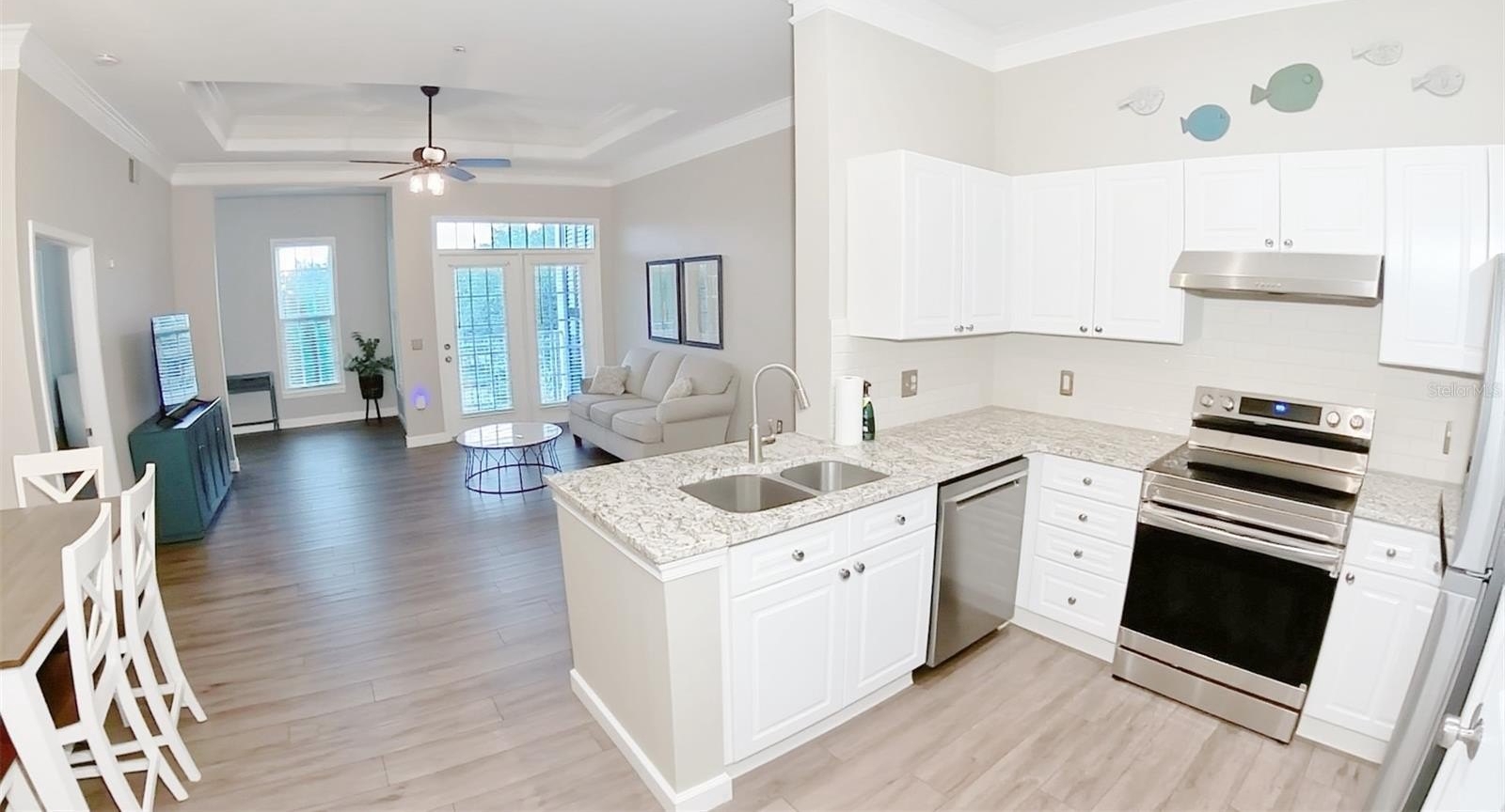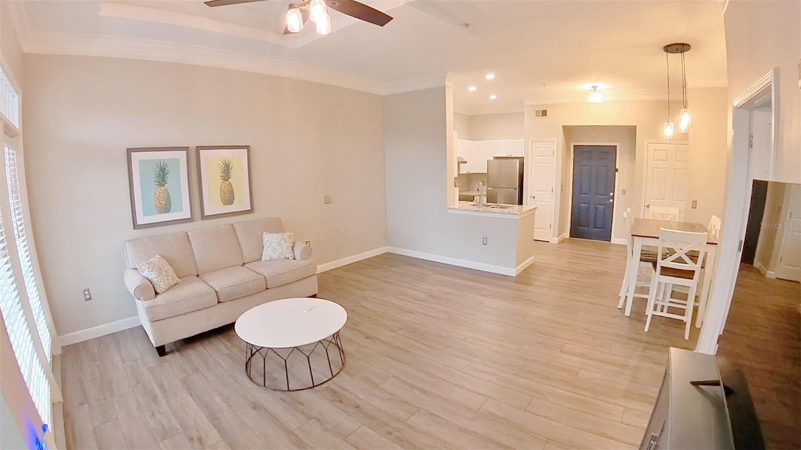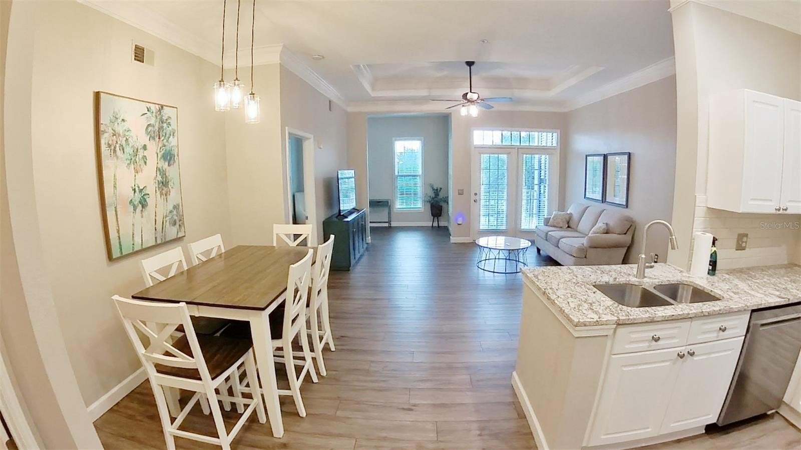 Look no further for your ELEVATOR BUILDING! Exquisitely renovated and maintained 1 Bedroom, 1 Bath "McKinley" Condo located on the top floor. Open living and expansive space greets you as you enter the foyer. Luxury Vinyl Floors will catch your eye throughout the property. Flowing easily from Living/Dining area with Tray Ceiling and Crown Molding. Your covered porch awaits you through a French Door and provides nice indoor / outdoor living. Granite Countertops, Stainless Steel Appliances, Tile Backsplash and Closet Pantry are all tastefully adorning the gourmet kitchen. A second covered porch is directly attached to the well proportioned Master Bedroom. Large walk in closet and a very conveniently placed washer and dryer closet flow through to the attached Master Bathroom with extra large walk-in luxury shower. No expenses spared in renovation of master bathroom with custom vanity and Tile listellos to match the shower flooring. A delightful space adjoins and connects both the living room and master that can be used as den / office / reading or gym area. A/C replaced in 2017. Hot Water heater replaced in 2019. Your comfort will greatly appreciate the Pella Windows recently added. Fantastic location near Clubhouse Pool, Tennis Court, Playground and Georgetown Clubhouse. Concierge Trash pick up at your door. Numerous car charging stations within close proximity to your property. Celebration boasts over 26 miles of walking/biking trails. Extensive amounts of banks, shops, salons, and restaurants nearby. Everyone raves about the Farmer’s Market every Sunday. Disney World theme parks, resorts and Disney Springs complex are all nearby for your enjoyment.