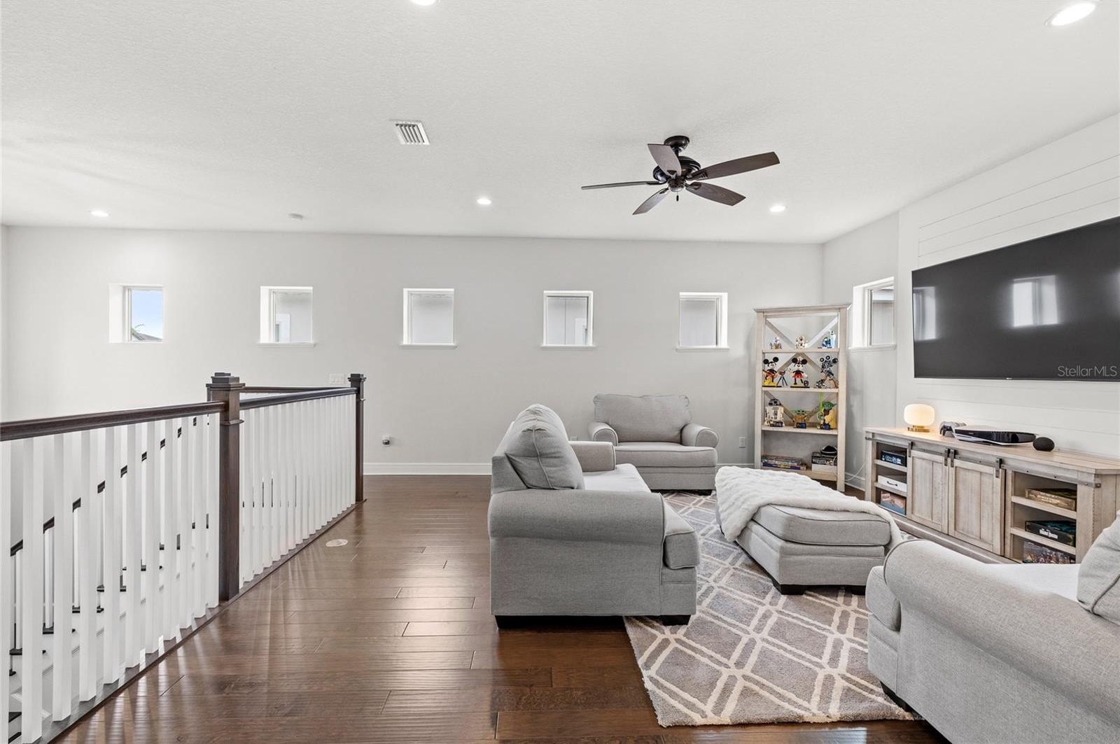 Upstairs, the loft offers a flexible second living area that works as a media room, office, or play space. The three additional bedrooms are well-sized and tucked away for privacy. Details like open stair railings and an extended lanai add to the home’s open, airy feel.