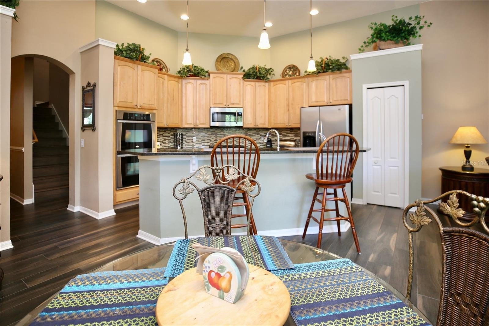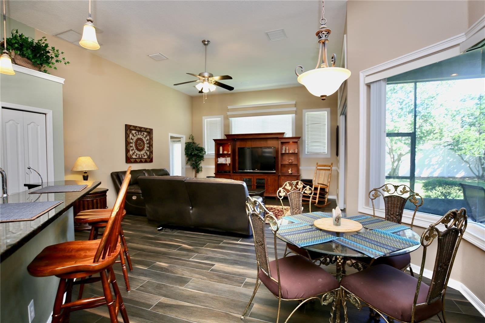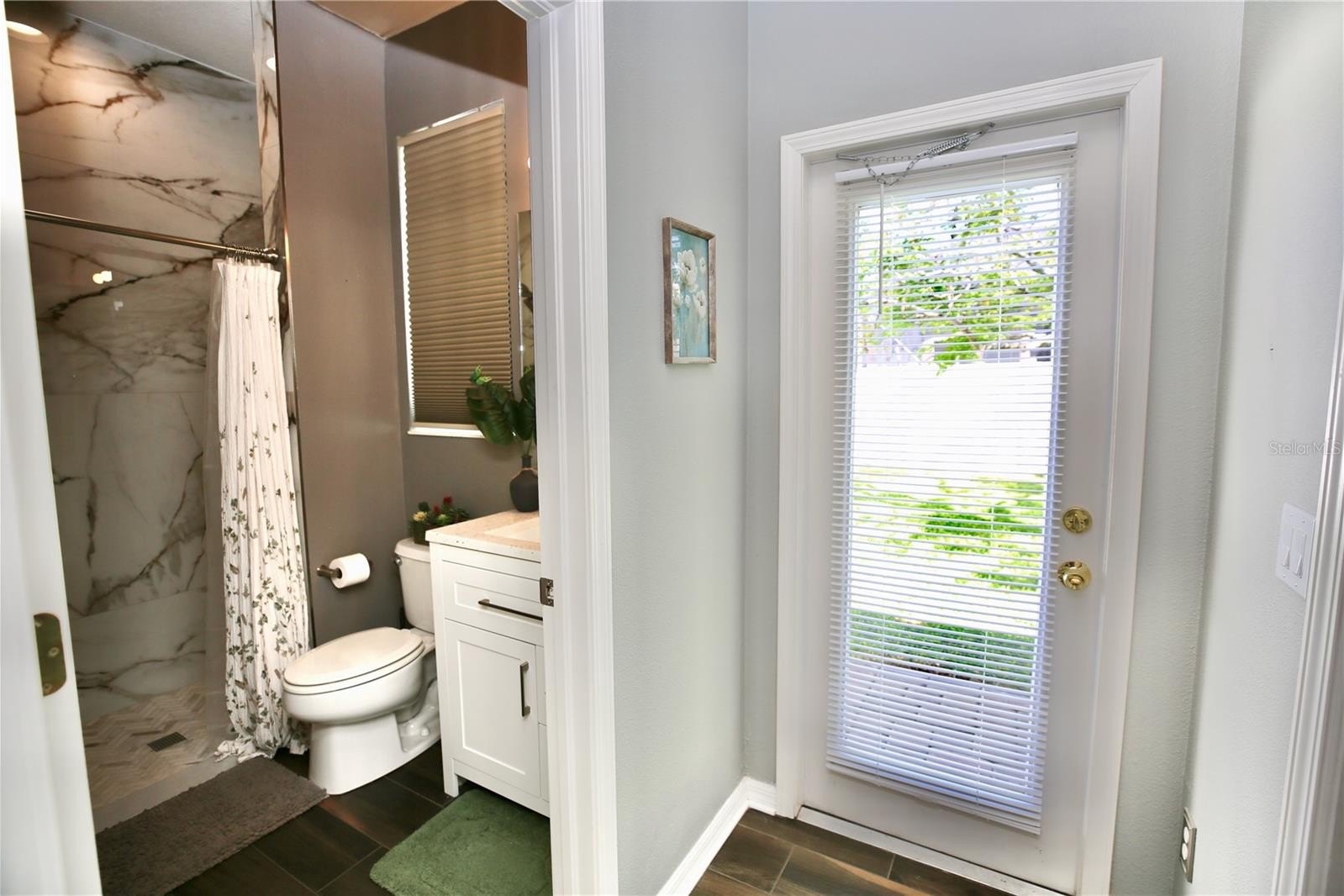 Expansive sliding glass doors fully retract into the wall, creating a seamless indoor-outdoor living experience. Notable upgrades include a newer roof (2023), updated flooring throughout, including laminate on the stairs, a hybrid electric/heat pump water heater (2022), and multiple HVAC enhancements.