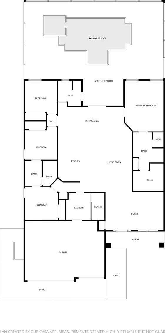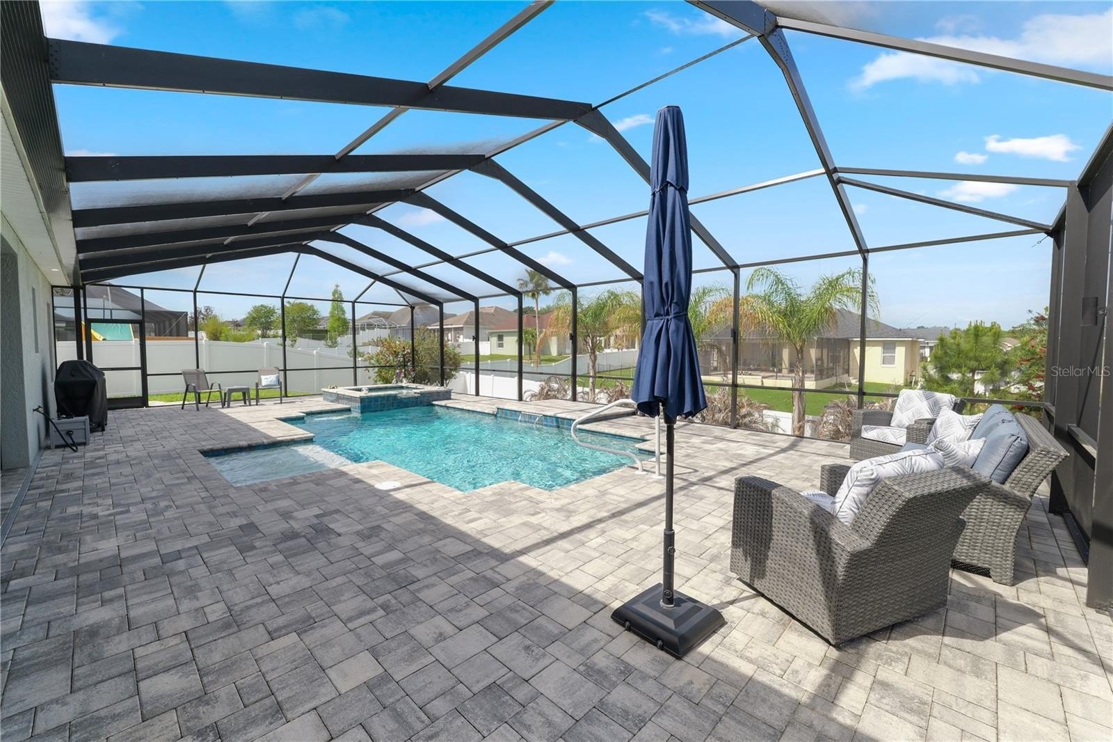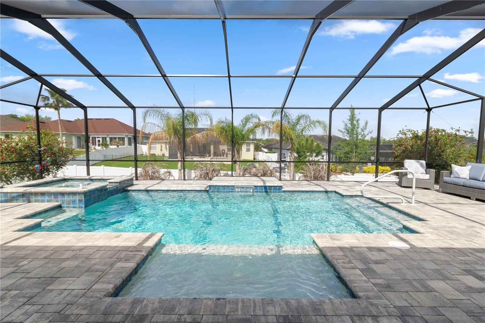 The living space opens to an expansive screened lanai, featuring a private pool and spa with integrated water features, creating a true resort-style setting. A dedicated pool-access bathroom adds both convenience and functionality.