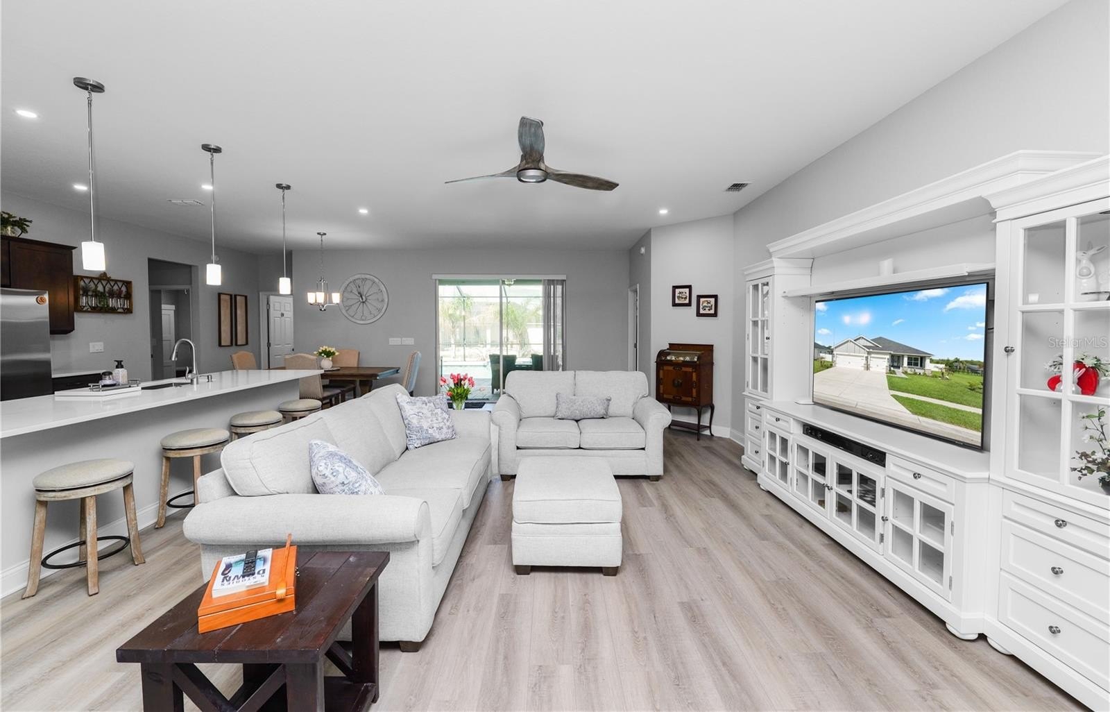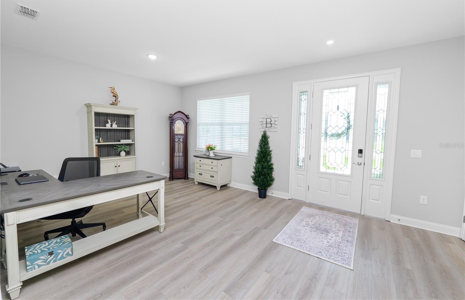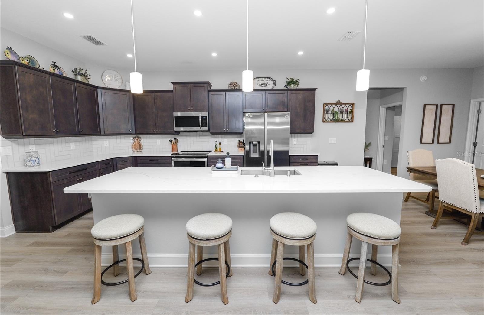 A spacious front foyer creates an inviting first impression and is currently utilized as a home office, offering flexibility for today’s lifestyle needs. From there, the home opens into a thoughtfully designed great room where the kitchen, dining, and living areas come together to create a bright and connected space. The kitchen anchors the home with a large island with seating, ample cabinetry, stainless steel appliances, and designer lighting, ideal for both everyday living and entertaining. Durable wood-style laminate flooring runs throughout the main living areas, adding warmth and continuity.