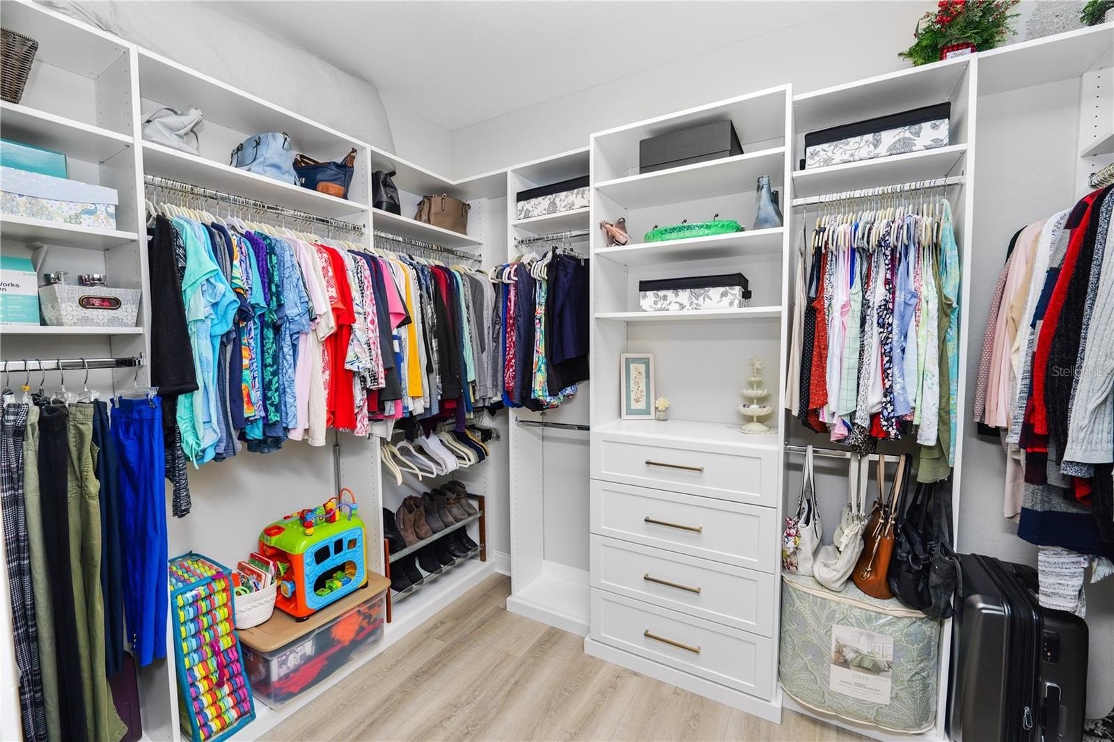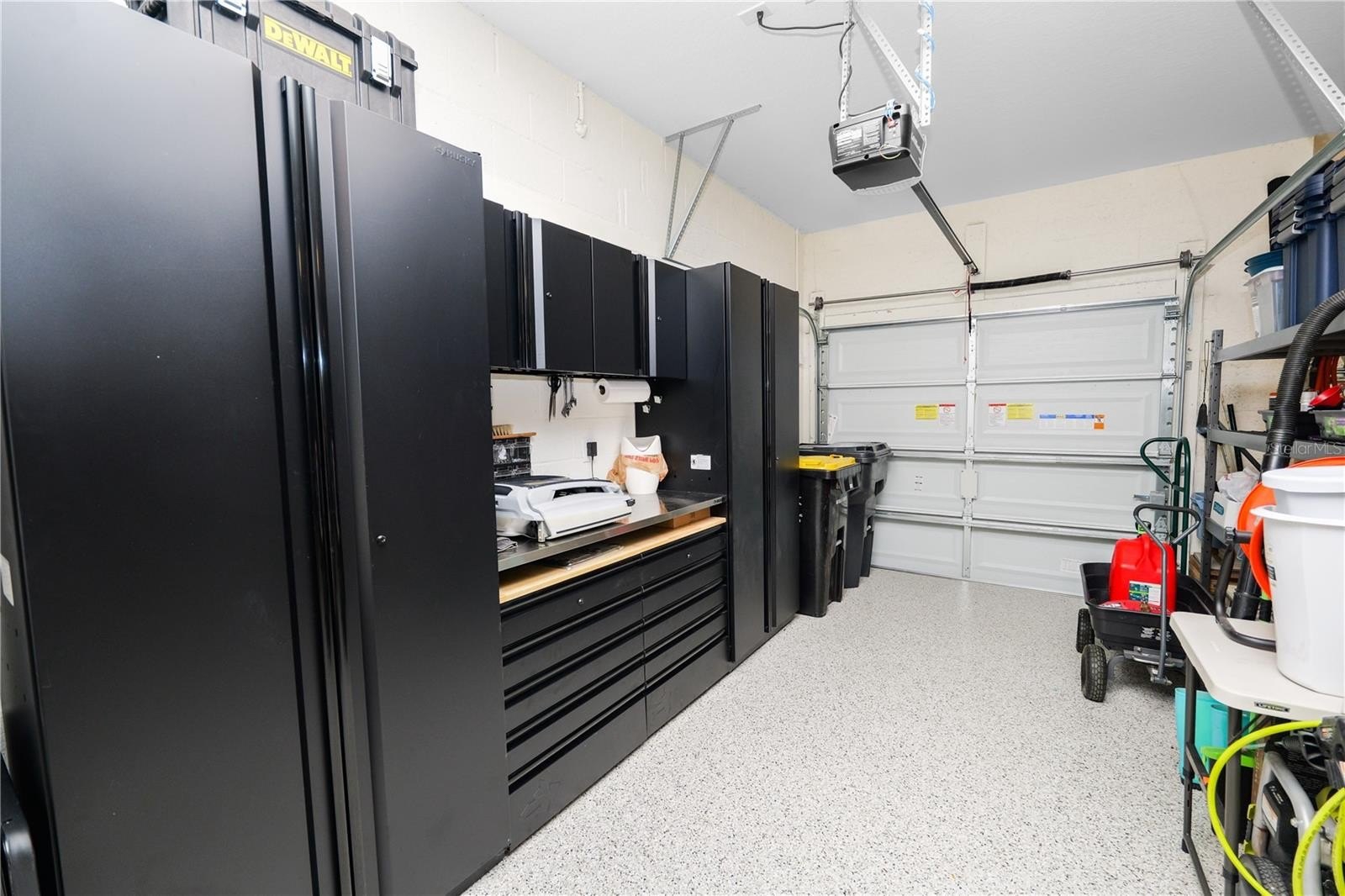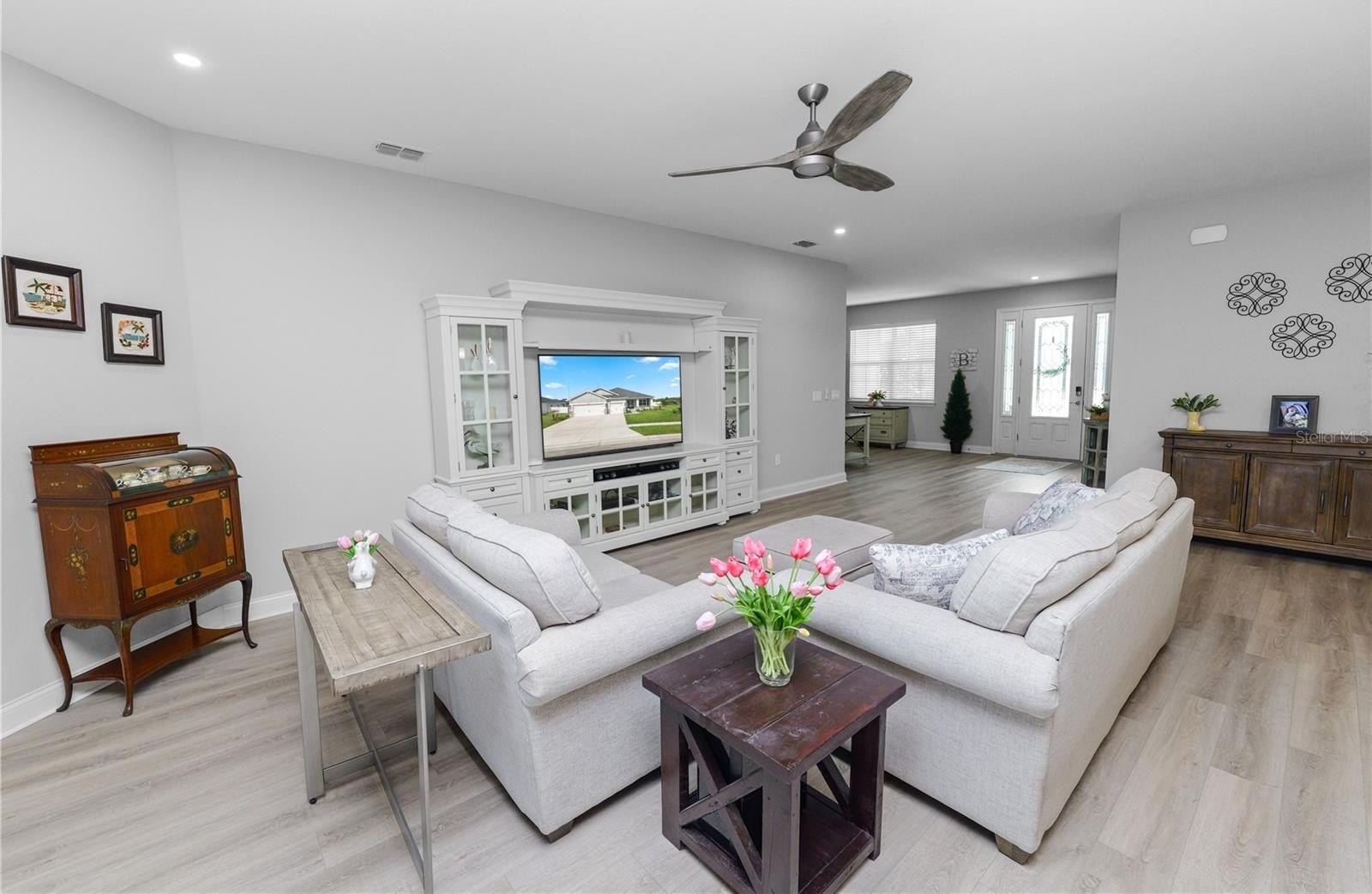 A spacious front foyer creates an inviting first impression and is currently utilized as a home office, offering flexibility for today’s lifestyle needs. From there, the home opens into a thoughtfully designed great room where the kitchen, dining, and living areas come together to create a bright and connected space. The kitchen anchors the home with a large island with seating, ample cabinetry, stainless steel appliances, and designer lighting, ideal for both everyday living and entertaining. Durable wood-style laminate flooring runs throughout the main living areas, adding warmth and continuity.
