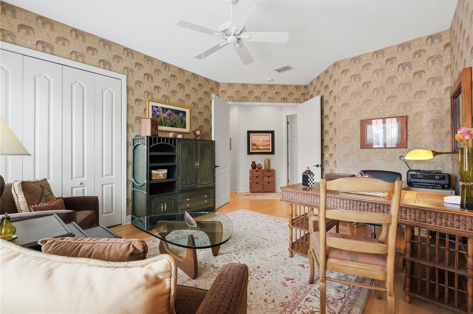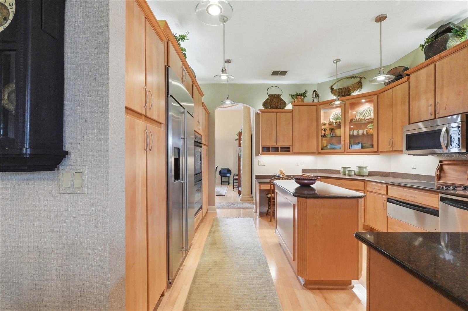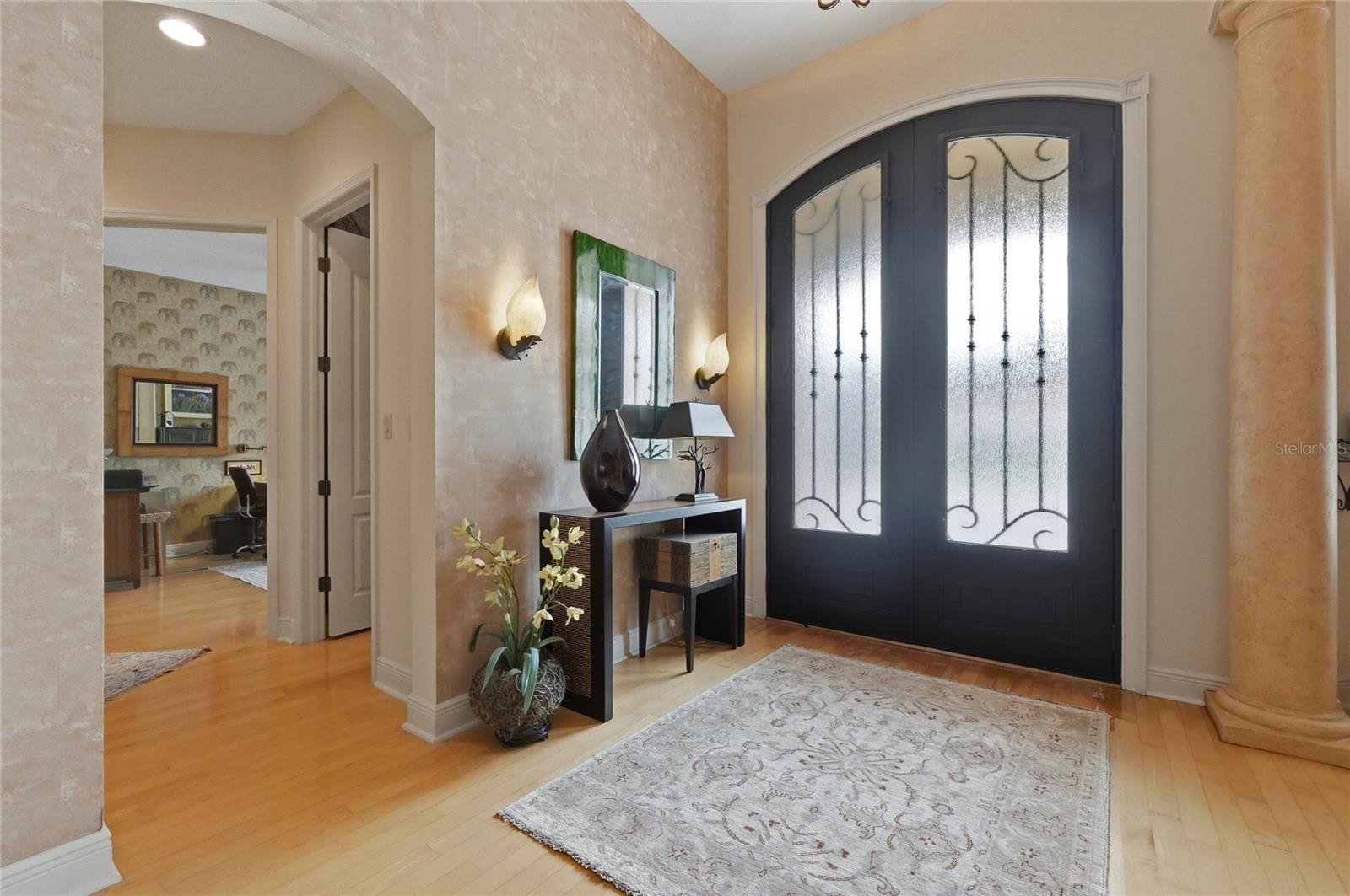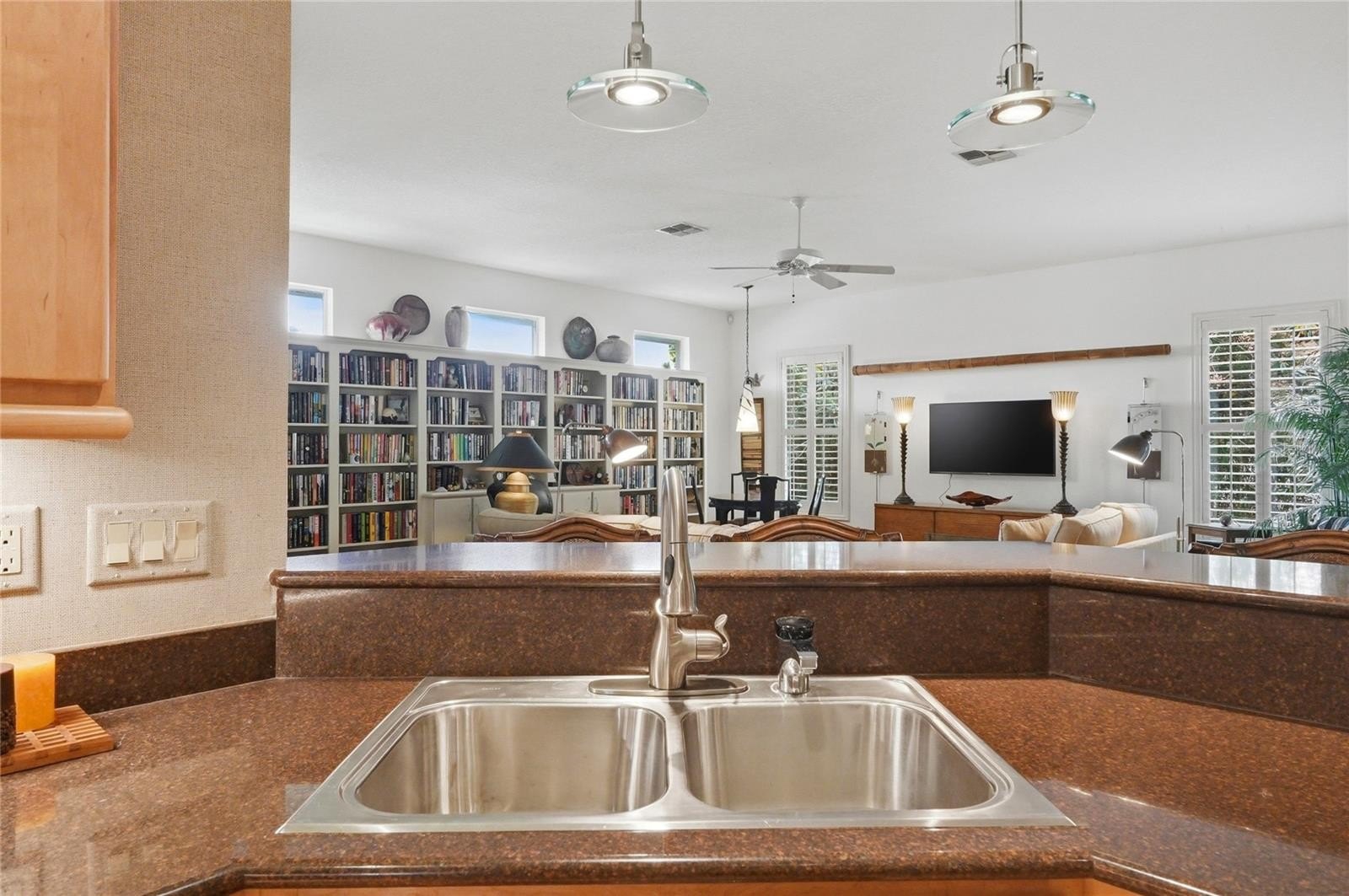 523 Greenway Drive | Lake Wales Country Club...Impressive in both design and detail, this upgraded residence offers 4 bedrooms, 2.5 baths and over 3,400 square feet of thoughtfully designed living space within the storied and timeless Lake Wales Country Club. Tucked away in a quiet, private enclave of the community, the setting is as refined as the home itself. From the moment you enter through the custom iron doors, the attention to detail is evident. Soaring ceilings, warm wood flooring, and elegant formal living and dining spaces create an inviting yet sophisticated atmosphere. The spacious family room is anchored by a full wall of custom built-in shelving, enhanced by transom lighting and a wet bar—ideal for both everyday living and entertaining. The kitchen is both functional and beautifully finished, featuring solid wood maple cabinetry, quartz counters, double ovens, a warming drawer, flat-top range, integrated desk, and upper and lower cabinet lighting that provides the perfect ambiance. A true retreat, the primary suite offers a generous bedroom with sitting area, a large walk-in closet with custom organizers, and a well-appointed bath with quartz counters, dual sinks, a makeup station, soaking tub, and separate walk-in shower. The split-bedroom layout includes 3 guest rooms, one currently used as a dedicated art studio and another as an office—flexible space that could easily serve as a game room, craft room, or additional bedroom. The private office/4th bedroom features wood flooring, plantation shutters, and a closet for added versatility. Guest bath includes a glassed in shower while the stylish powder room showcases custom wallpaper and a Kohler Artist collection sink. Additional highlights include a well-equipped laundry room with cabinetry, wash tub, and dual storage closets, as well as an oversized 3-car garage with built-in storage. Outdoor living is exceptional. The expansive screened lanai faces east, capturing soft morning light while remaining comfortably shaded in the afternoons. Complete with tile flooring, a tongue-and-groove ceiling, and a summer kitchen, this space is designed for year-round enjoyment. The backyard has been thoughtfully landscaped to create a private, natural setting, featuring clumping bamboo, fragrant camellias, and mature foliage that enhance both privacy and ambiance. Notable upgrades include a 16KW Generac Guardian generator, gas tankless water heater, irrigation well, gutters, pavered driveway, and dual A/C systems for optimal efficiency. Located within the Lake Wales Country Club, residents enjoy access to a community pool, clubhouse, and an 18-hole golf course—all while maintaining a sense of privacy and tranquility. Lake Wales itself is one of Central Florida’s hidden gems—an established community known for its rolling hills, lakes, and strong commitment to preserving Old Florida character. With landmarks like Bok Tower Gardens and a growing arts and cultural presence, it has become a destination for creatives, nature lovers, and those seeking a quieter lifestyle—without sacrificing access to modern conveniences. Originally the home of an artist, the level of detail and thoughtful design is evident throughout. Every element has been carefully selected, creating a home that feels both refined and welcoming. A distinctive property in a timeless setting.