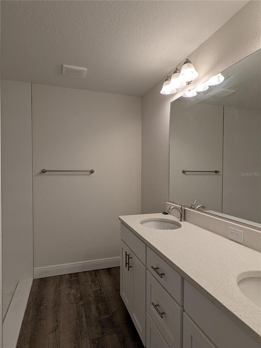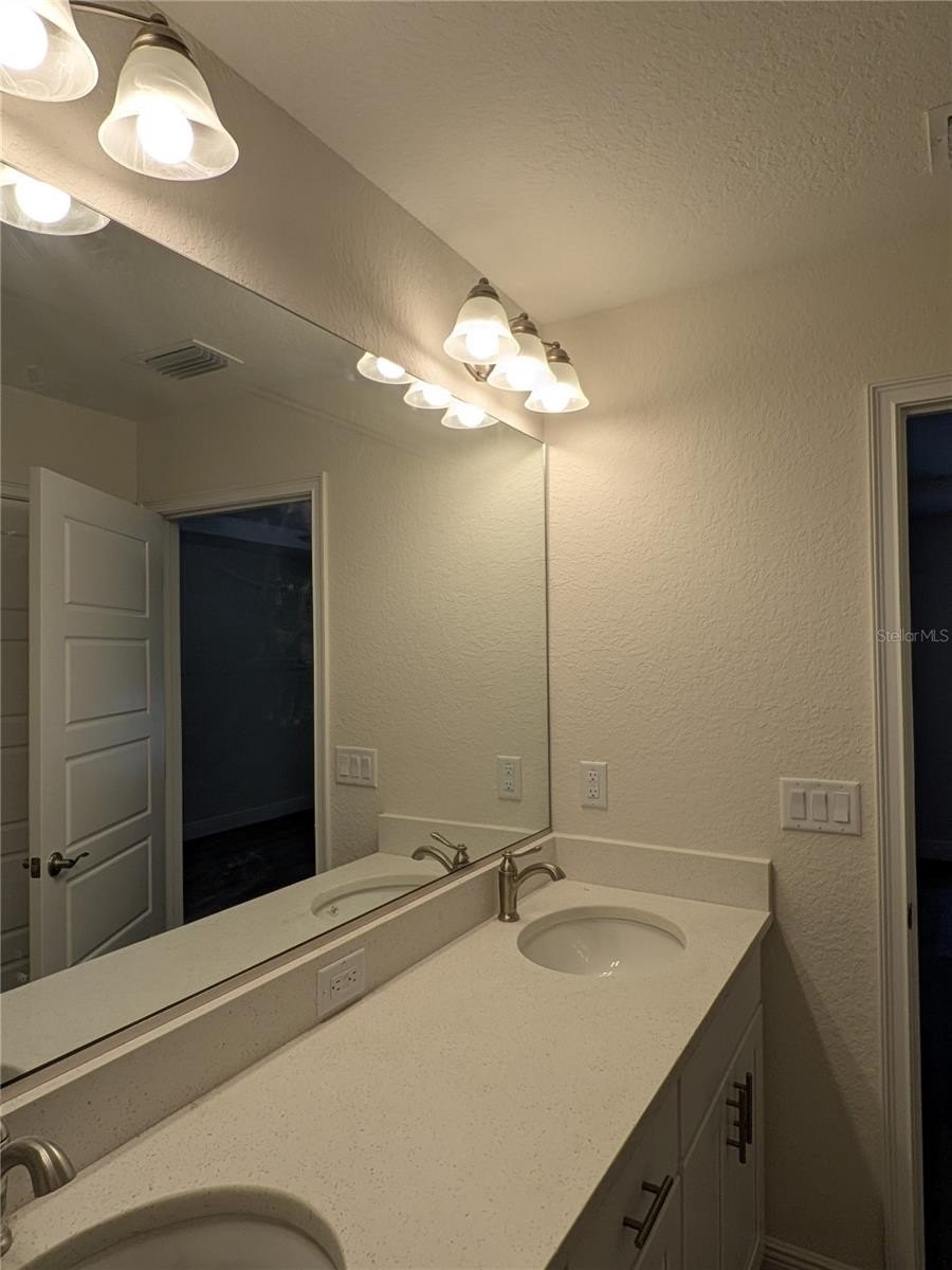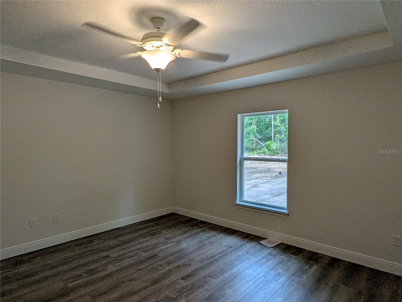 The owner’s retreat serves as a true sanctuary, elevated by elegant tray ceilings and a large walk-in closet. The attached en suite bathroom offers a touch of luxury with dual sinks and a walk-in shower finished in exquisite floor-to-ceiling tile.