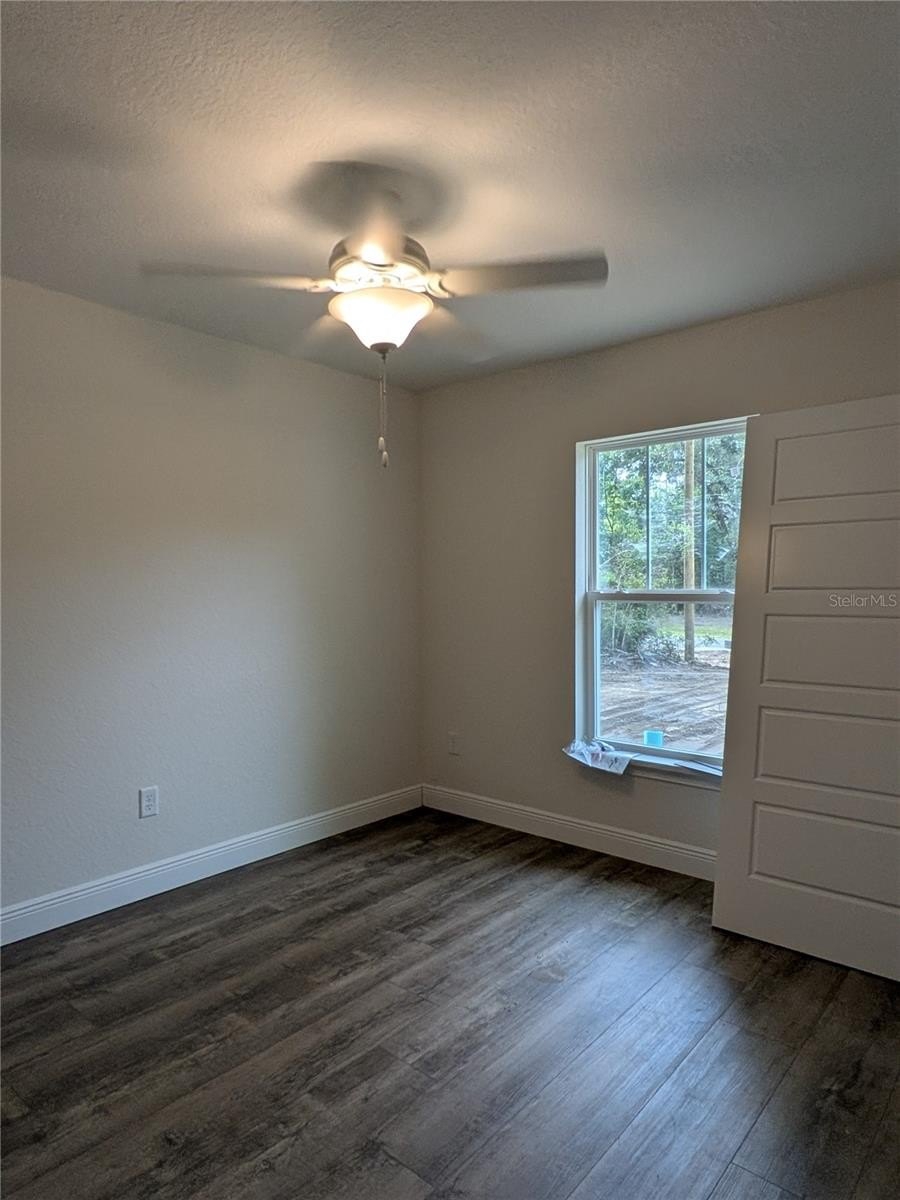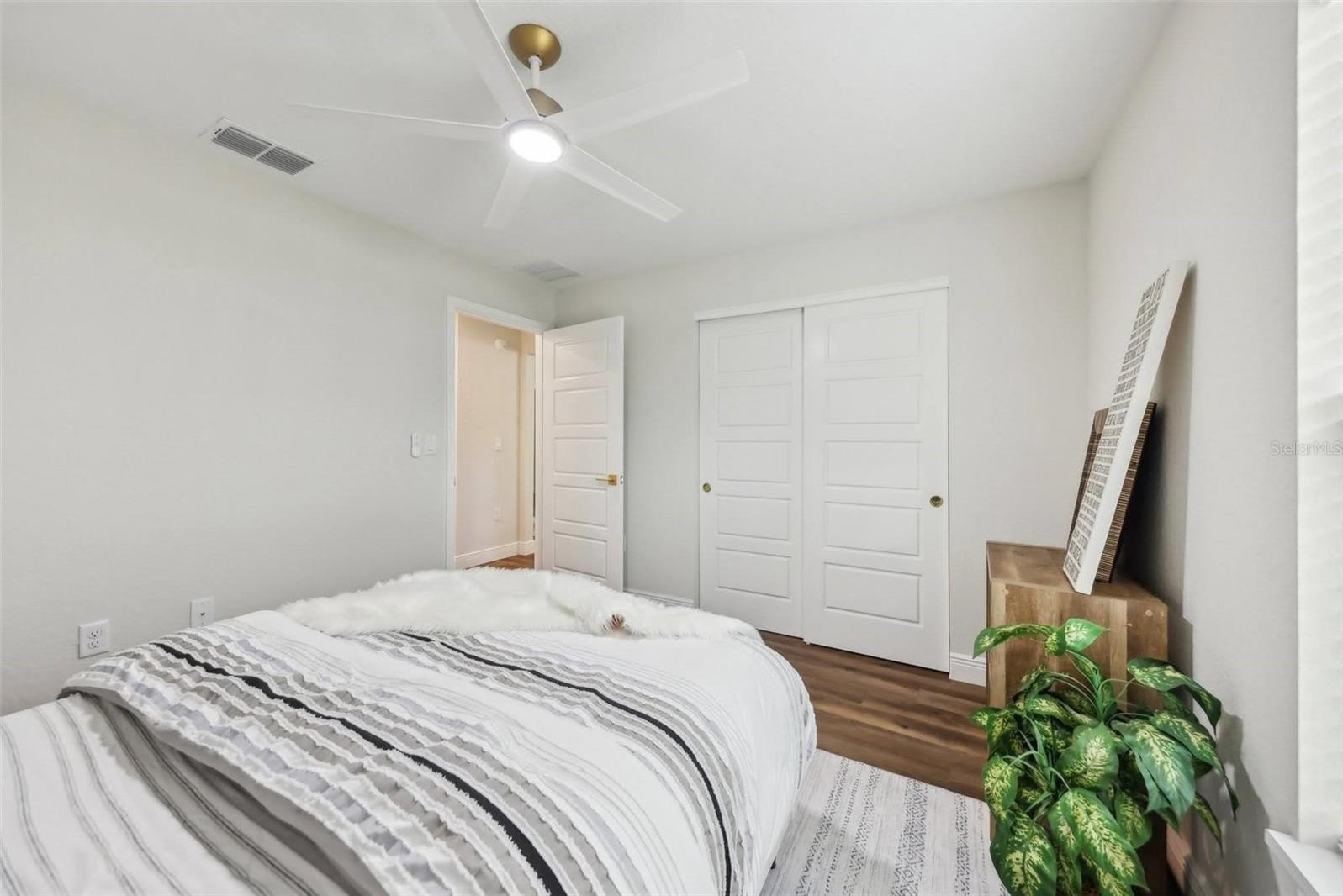 Every detail has been considered for your comfort, including ceiling fans in all three bedrooms and two-inch blinds on every window for instant privacy. The living space extends outdoors to a 128-square-foot screened-in lanai equipped with its own ceiling fan, offering a serene escape from the afternoon sun. Beyond the lanai, the massive, tree-lined backyard provides a secure and expansive space for outdoor gatherings, gardening, or simply unwinding in complete seclusion.