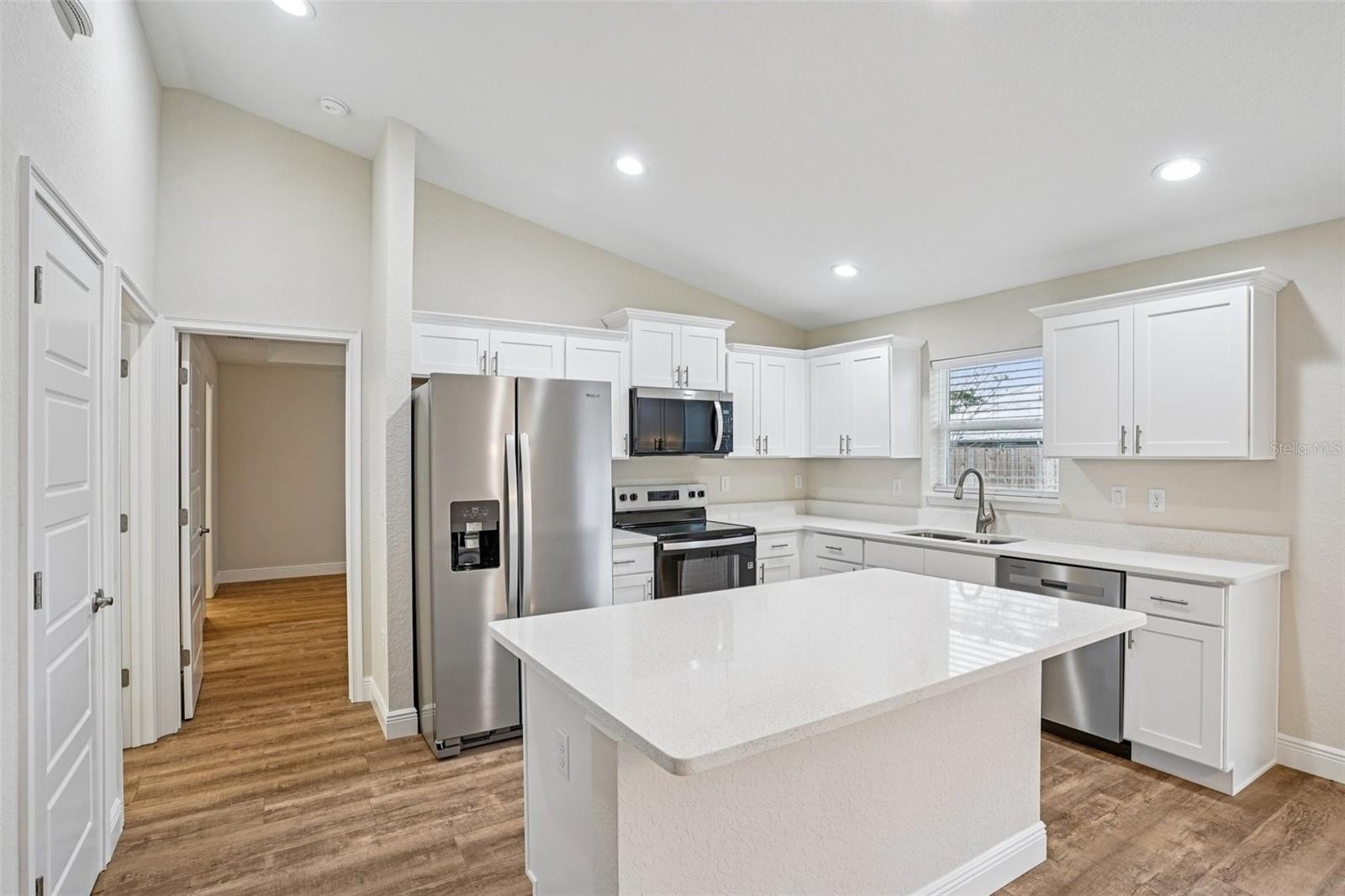 Inside, the open-concept layout feels incredibly airy thanks to high ceilings and a thoughtful split-floor plan that ensures maximum privacy for everyone. Durable and stylish luxury vinyl plank flooring spans every room, offering an elegant look that is remarkably easy to maintain. The kitchen and bathrooms are finished with high-quality features, including soft-close cabinetry and beautiful quartz countertops. As the centerpiece of the home, the kitchen boasts sleek stainless steel appliances, recessed lighting, and a generous island perfect for meal prep, a breakfast bar, or casual dining.