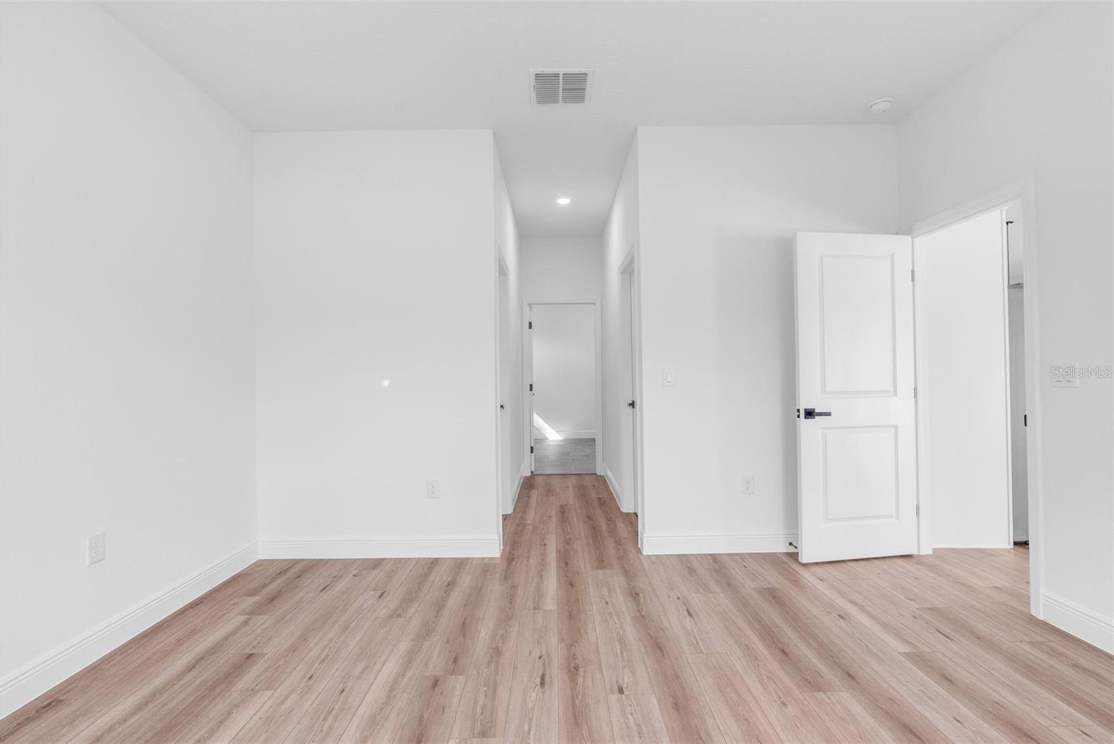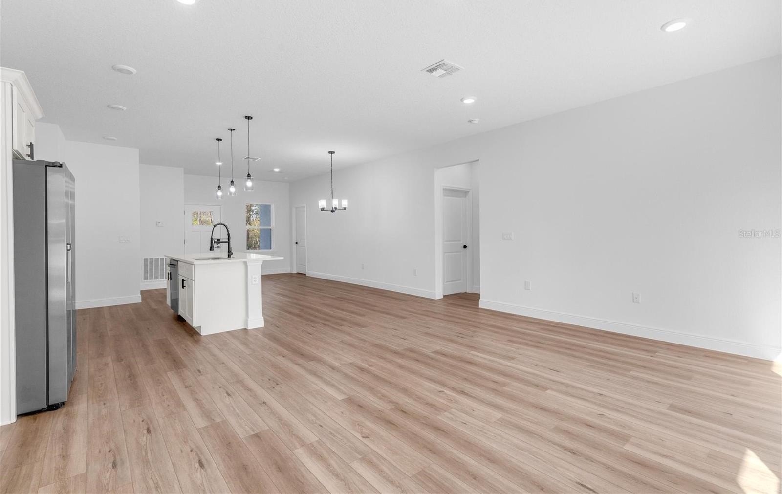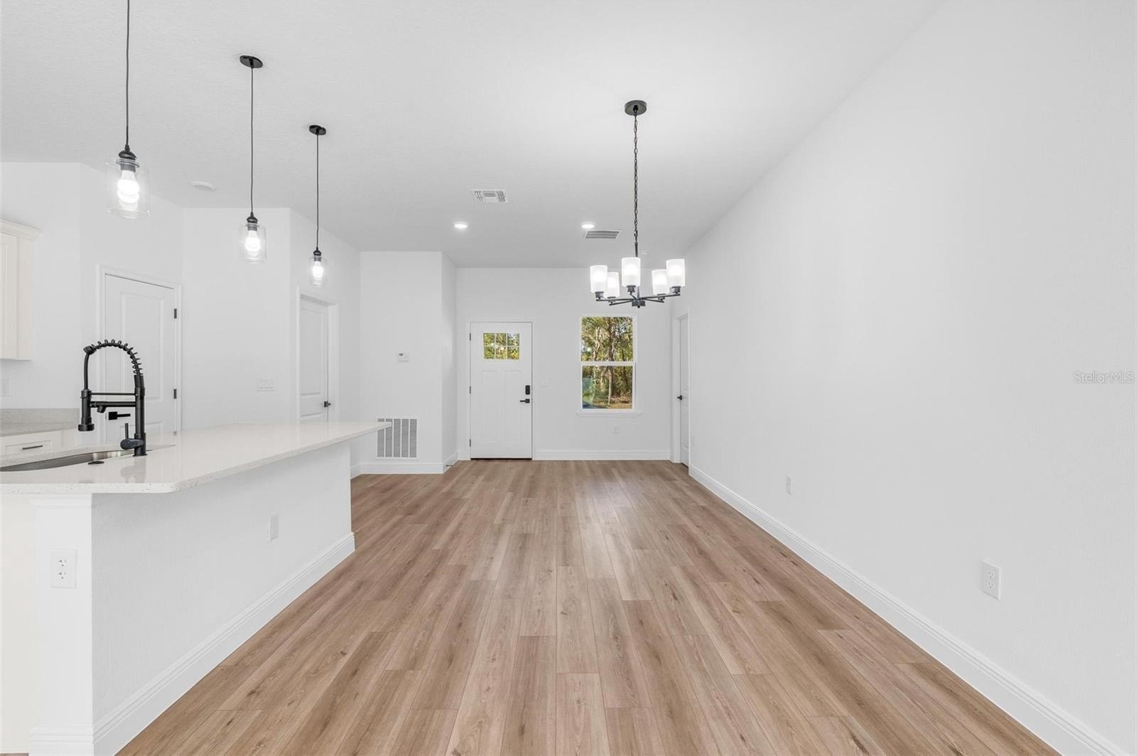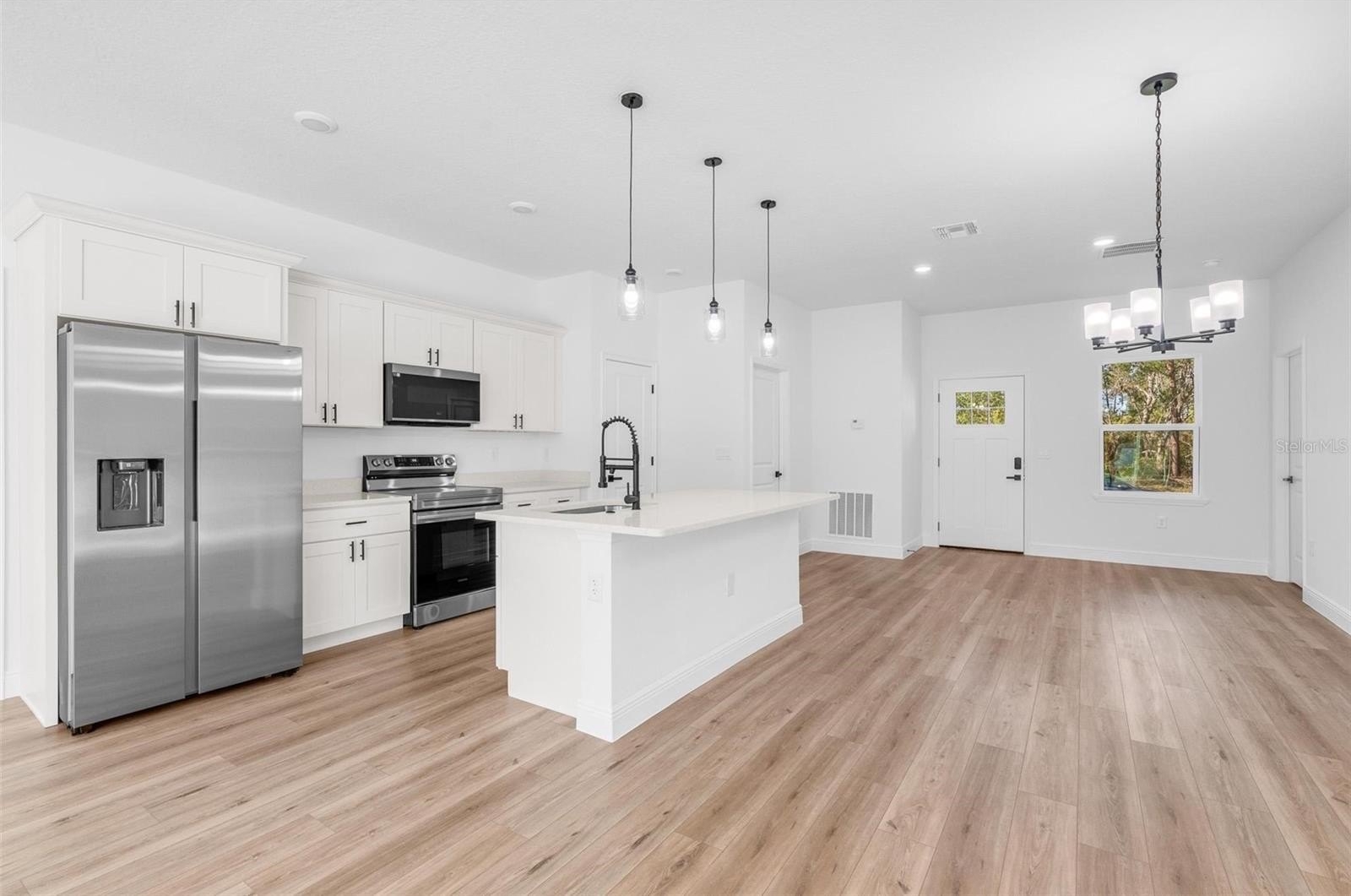 The open-concept layout connects living, dining and kitchen in one continuous space, with quartz countertops, stainless steel appliances and ample cabinet storage. The split floor plan places the owner's suite — walk-in closet and private en-suite bath — on its own side of the home. Three additional bedrooms each include built-in closets, flexible for guests, a home office or multi-purpose use.