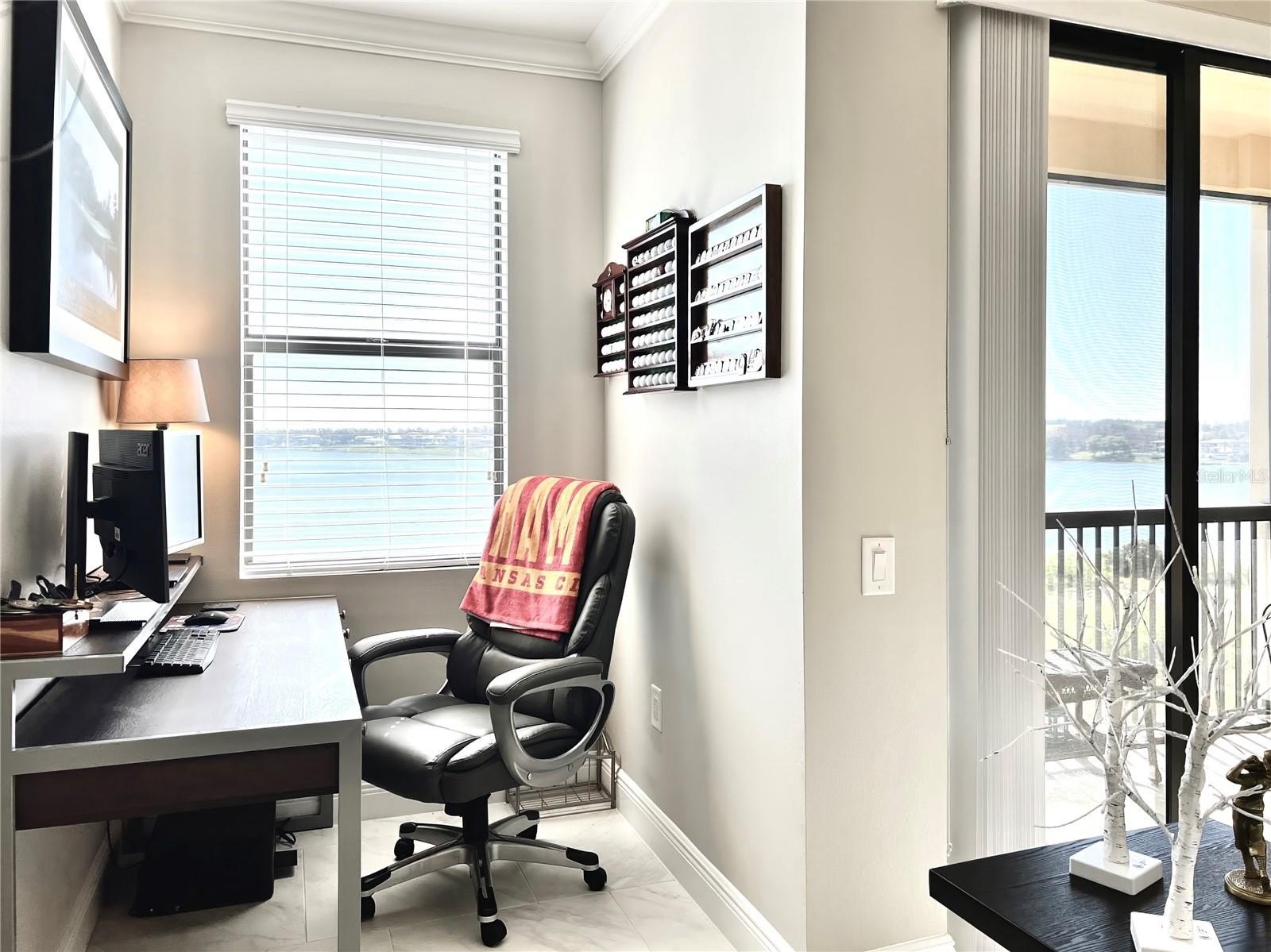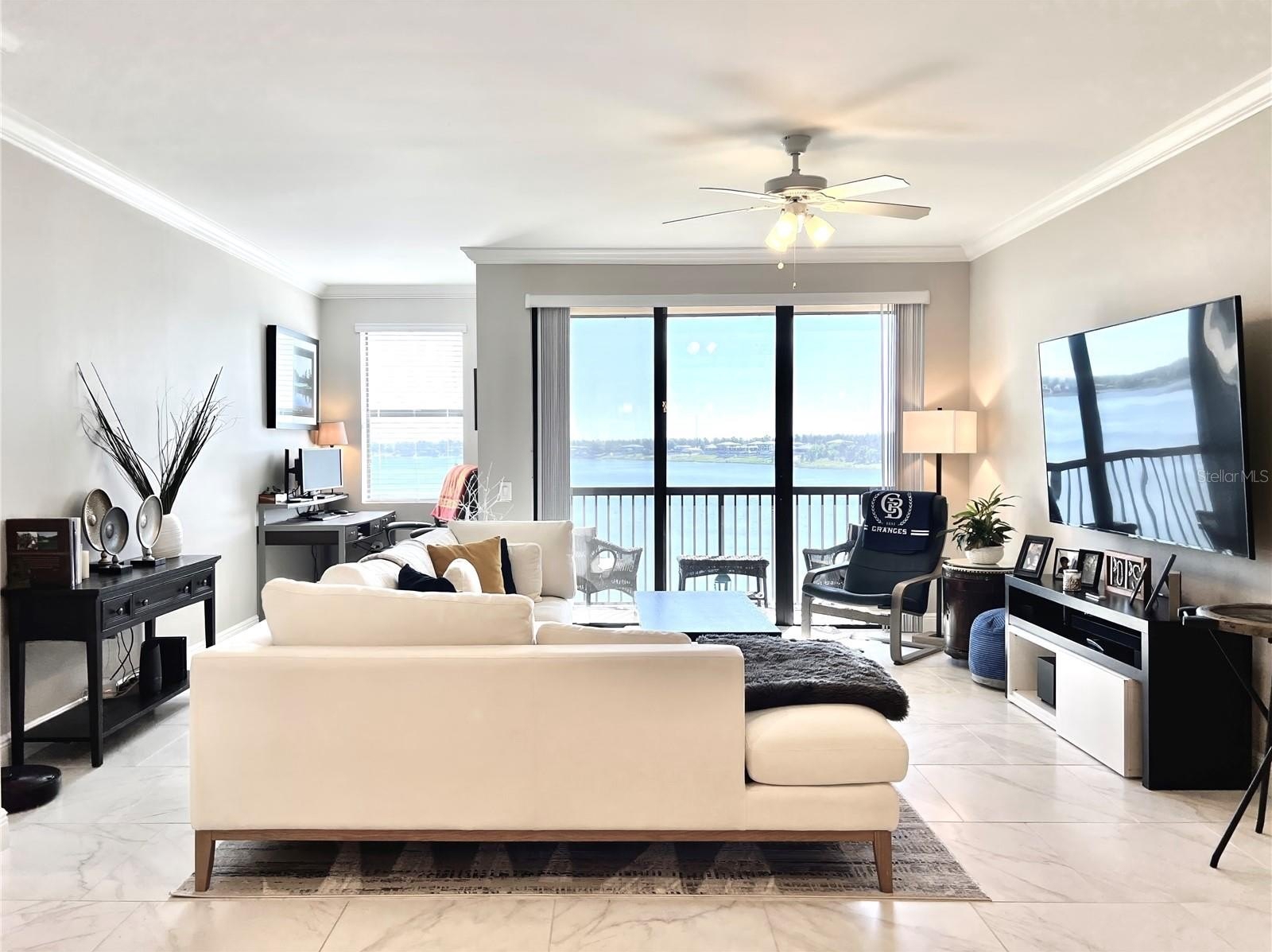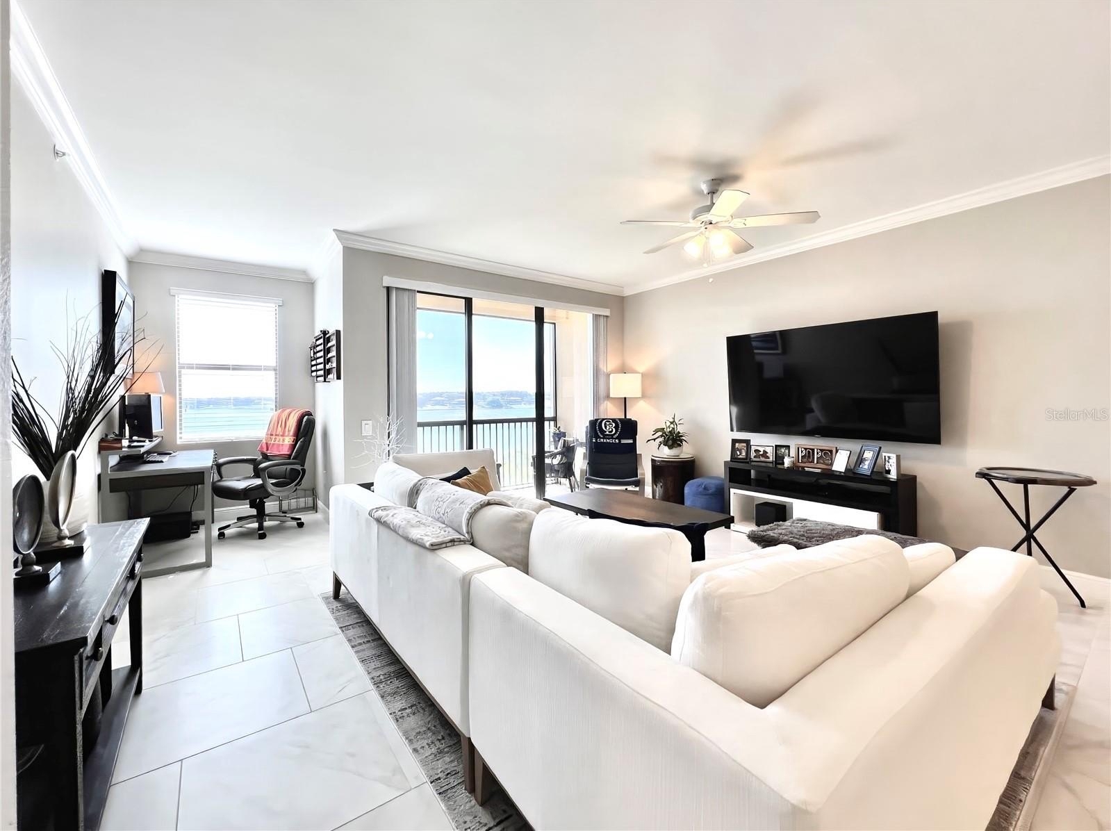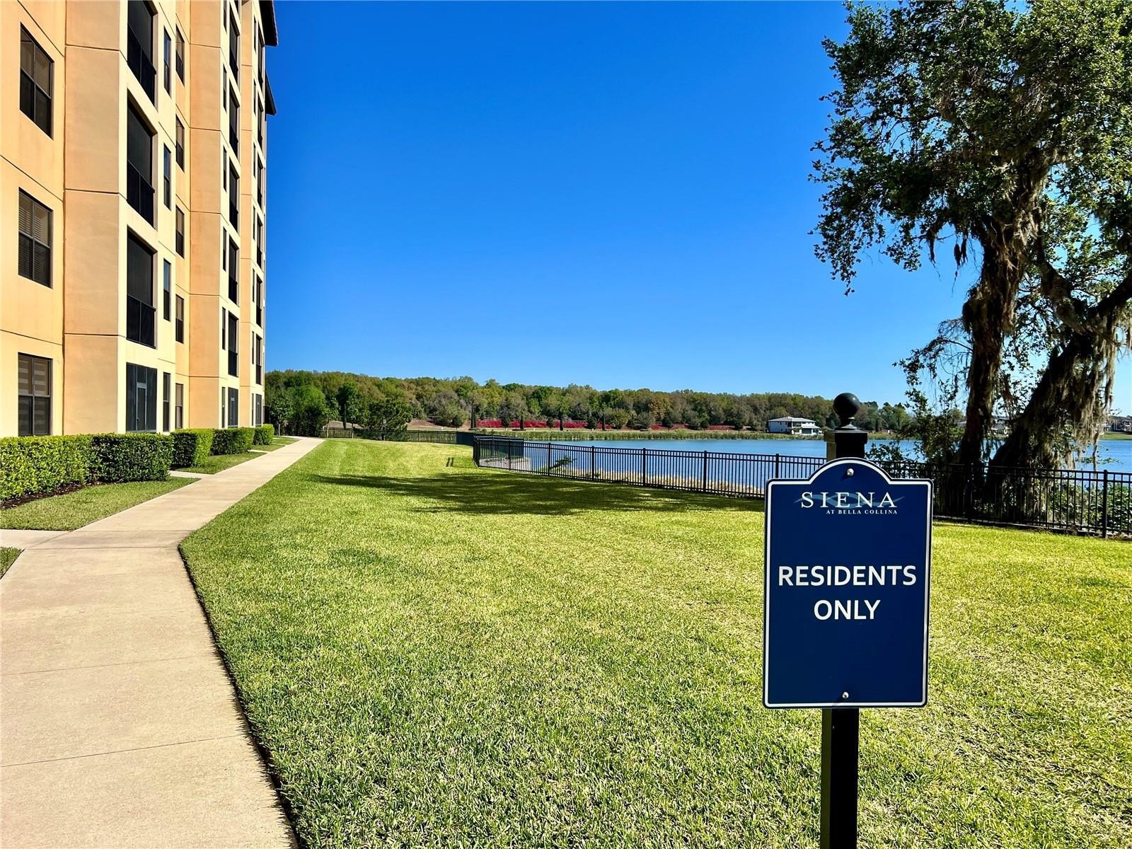 Welcome to the luxurious Siena condos neighboring the resort-style Bella Collina community. This gate-protected building is renown for high end amenities, and its prime location. Upon entry you're met with the glorious water view of Lake Siena immediately. This unit is situated on the fifth floor, offering an optimal vantage to fully appreciate the waterfront lifestyle at its best. This wide open floor plan allows the kitchen, living room, dining, and office nook to enjoy access to the view. From your sliding glass doors you may access your screened-in balcony space with chairs to sit out and feel the breeze. Your spacious kitchen boasts contemporary finishes. Quartz countertops, stainless steel appliances with tile backsplash, modern pendant light fixtures, ample cabinetry, nook for breakfast table seating, and a large kitchen island great for entertaining. A half bath services the living areas for guests, while both the large bedrooms enjoy private en-suite baths. All full baths feature tub. The plentiful windows throughout the home and primary bedroom let in abundant natural light, in addition to offering stunning panoramic views of the shimmering water outside. Your palatial primary bathroom features dual under-mount sinks, a tasteful walk-in shower with tile accents, and a separate soaking tub with backsplash for relaxation. Your dues provide access to world-class amenities including an impressive fitness center, a large outdoor pool backing the lake, with your internet, cable, water, and trash collection utilities included. Residents may access the resort style Club at Bella Collina, with exclusive restaurants and social events for the community and its members. Schedule a showing today! Don't Miss Our Video Tour!