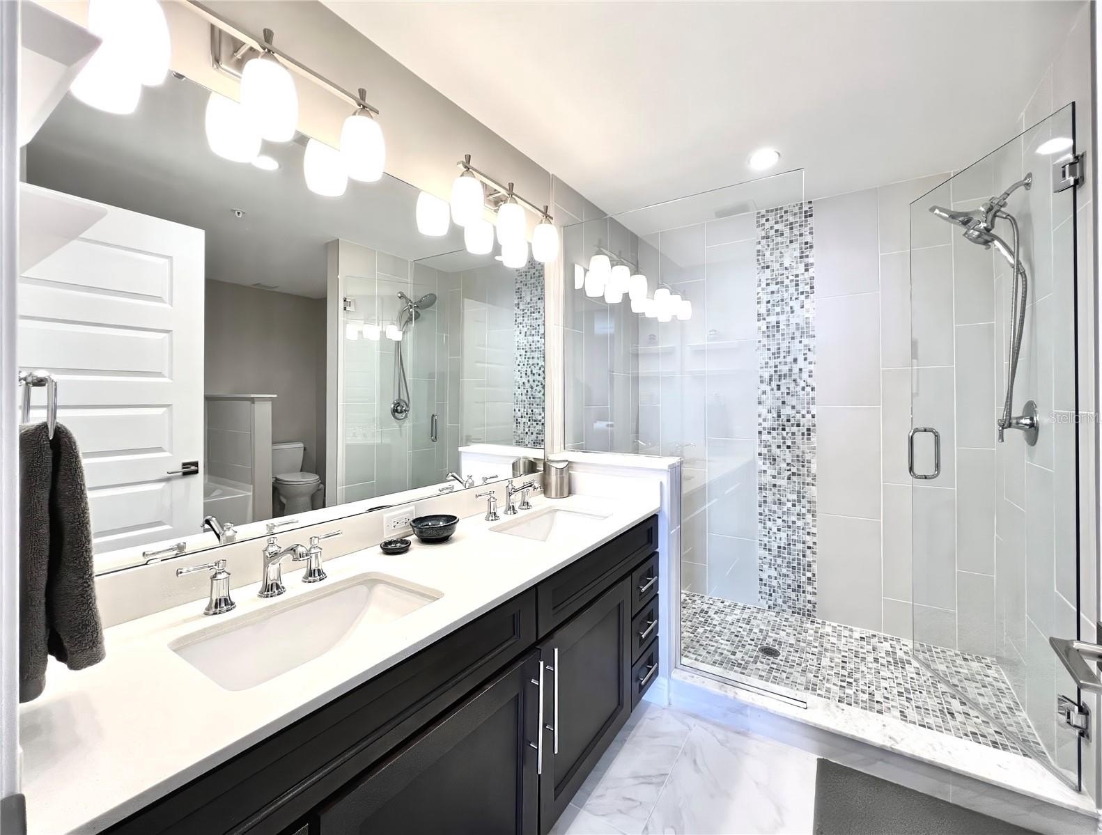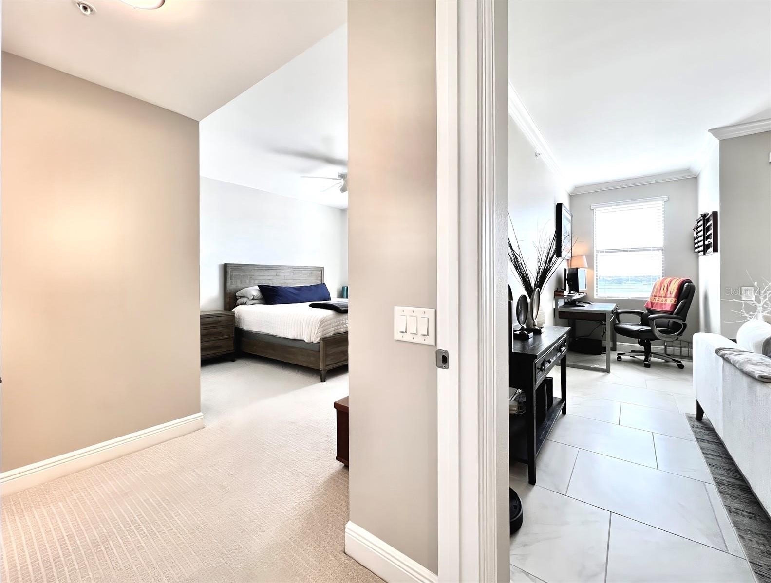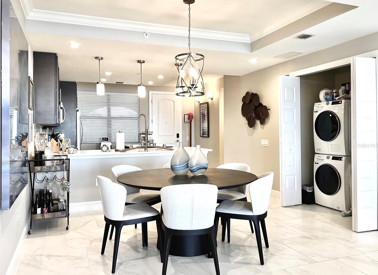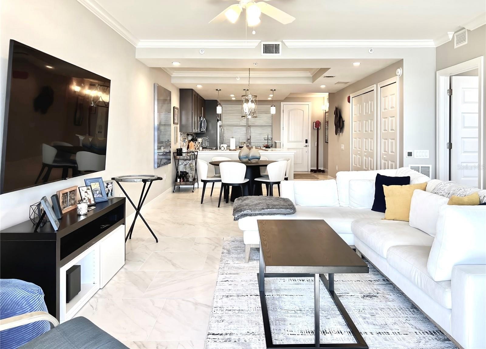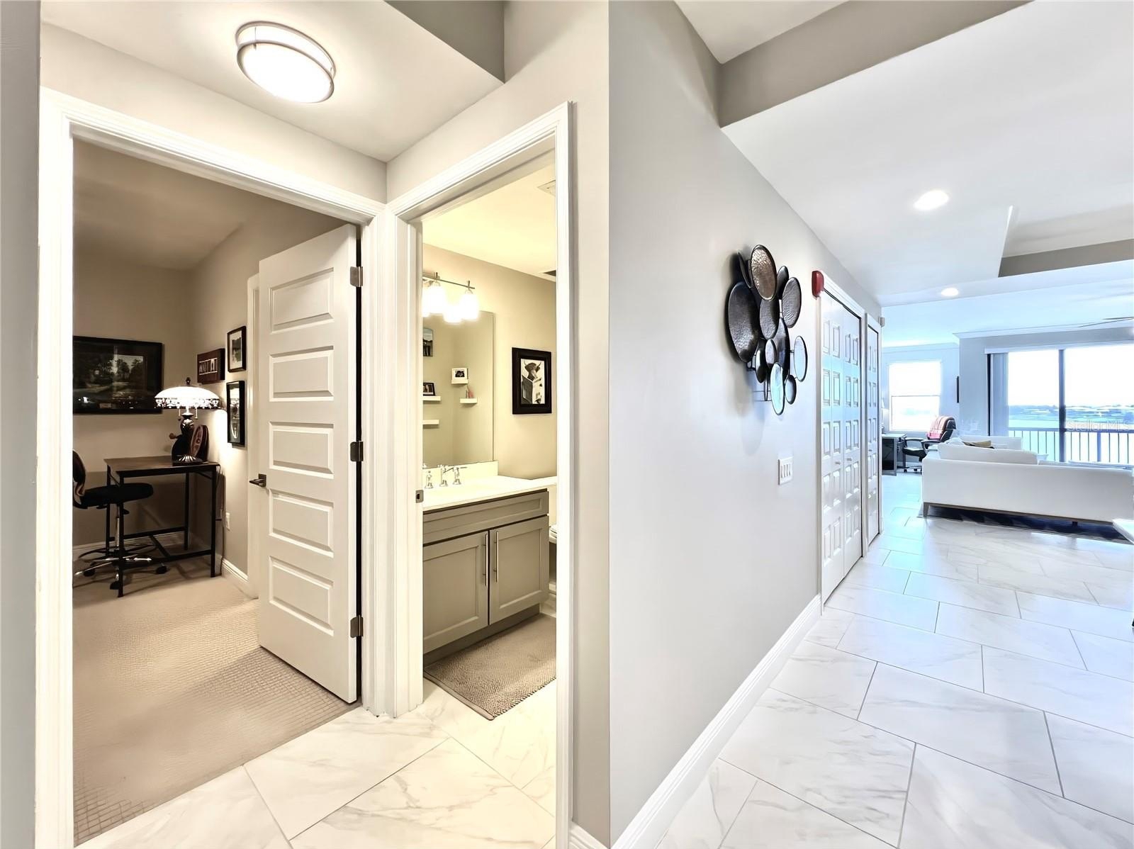 Welcome to the luxurious Siena condos neighboring the resort-style Bella Collina community. This gate-protected building is renown for high end amenities, and its prime location. Upon entry you're met with the glorious water view of Lake Siena immediately. This unit is situated on the fifth floor, offering an optimal vantage to fully appreciate the waterfront lifestyle at its best. This wide open floor plan allows the kitchen, living room, dining, and office nook to enjoy access to the view. From your sliding glass doors you may access your screened-in balcony space with chairs to sit out and feel the breeze. Your spacious kitchen boasts contemporary finishes. Quartz countertops, stainless steel appliances with tile backsplash, modern pendant light fixtures, ample cabinetry, nook for breakfast table seating, and a large kitchen island great for entertaining. A half bath services the living areas for guests, while both the large bedrooms enjoy private en-suite baths. All full baths feature tub. The plentiful windows throughout the home and primary bedroom let in abundant natural light, in addition to offering stunning panoramic views of the shimmering water outside. Your palatial primary bathroom features dual under-mount sinks, a tasteful walk-in shower with tile accents, and a separate soaking tub with backsplash for relaxation. Your dues provide access to world-class amenities including an impressive fitness center, a large outdoor pool backing the lake, with your internet, cable, water, and trash collection utilities included. Residents may access the resort style Club at Bella Collina, with exclusive restaurants and social events for the community and its members. Schedule a showing today! Don't Miss Our Video Tour!