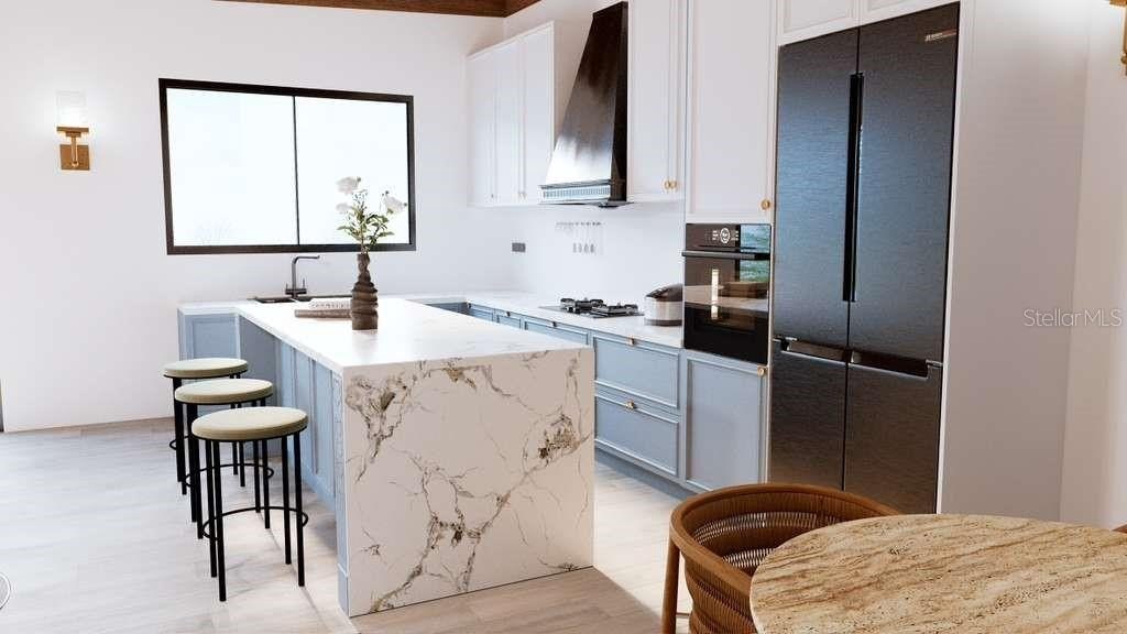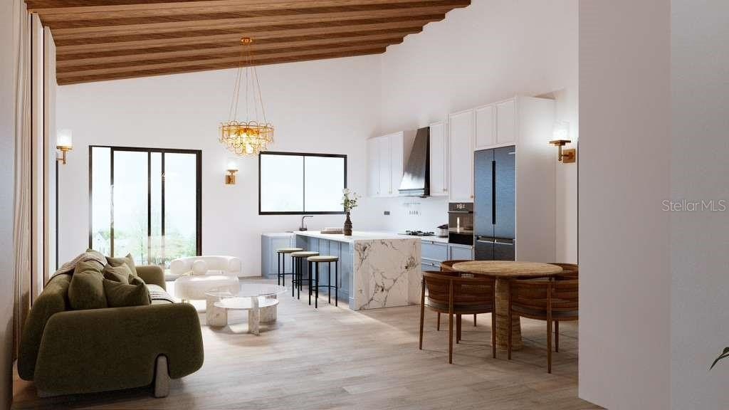The kitchen is thoughtfully designed with quartz countertops, stainless steel appliances, 42” solid wood cabinetry, a walk-in pantry, and a center island that anchors the living space. Interior features include 9-foot ceilings, luxury vinyl plank flooring throughout, upgraded lighting, 8-foot sliding glass doors, an 8-foot front entry door, and an 8-foot window entry, creating a bright, modern feel with a sense of openness.
